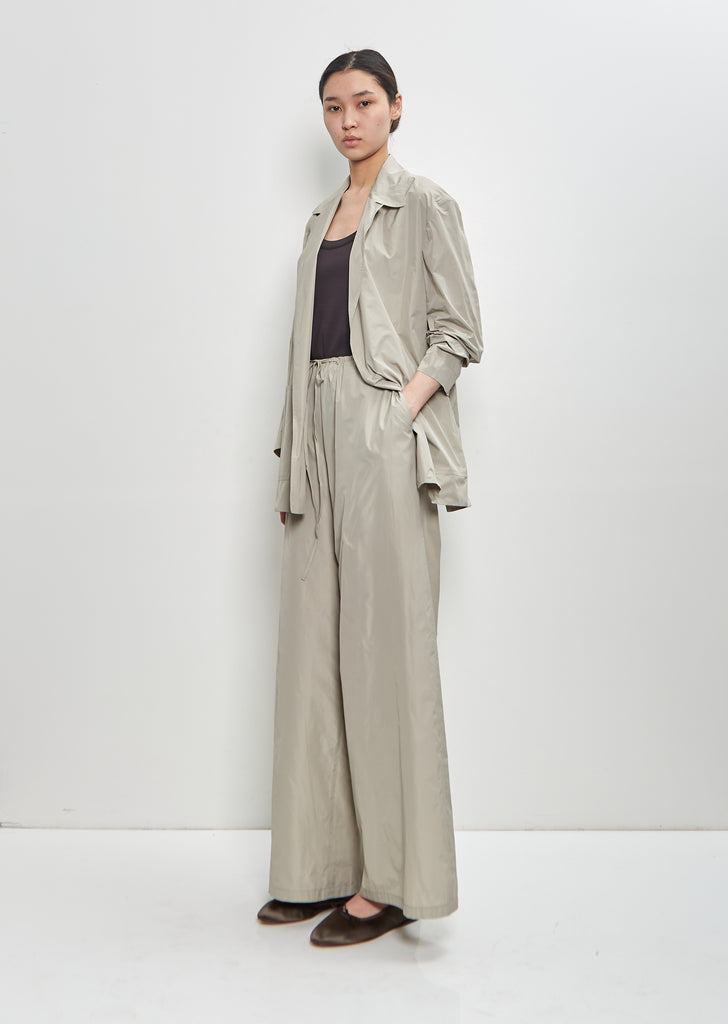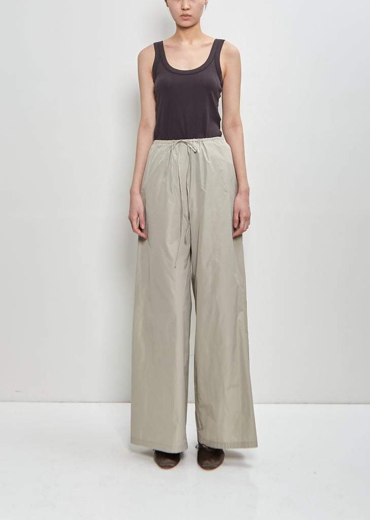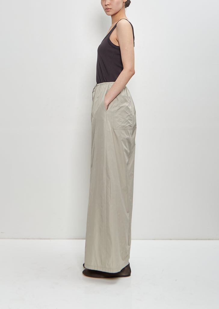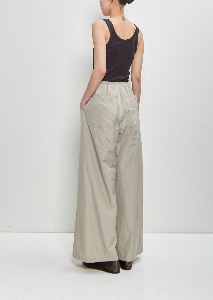 Ter et Bantine light grey pull-on pants with wide, straight legs in lightweight technical twill. Features side seam pockets, deep patch pockets at back and an elasticated adjustable waist. Relaxed fit.