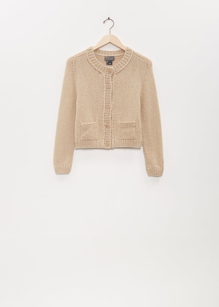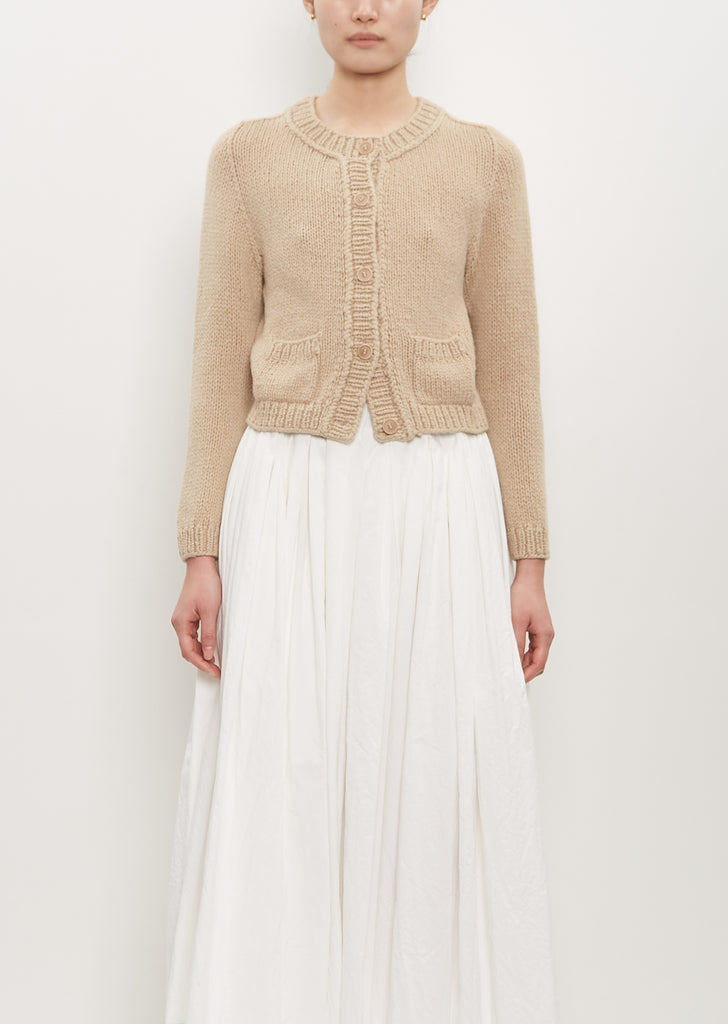 Wommelsdorf desert beige slightly cropped cardigan sweater with a crew neck hand-knitted in Berlin from the finest cashmere yarns. Features front patch pockets and a rib trim finish at neckline, placket, pockets, cuffs, and hem. Finished with tonal buttons.