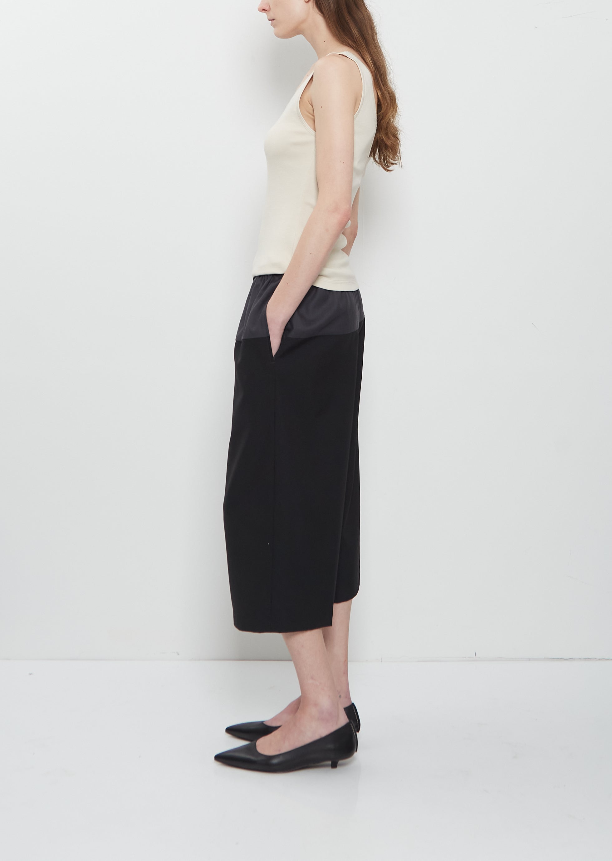 6397 jet black pull-on cropped paneled pant with wide legs and a contrasting high sheen wool panel at waist in matte lightweight Italian wool. Features a covered elasticated waist, side seam pockets and an adjustable tonal drawstring closure. Loose, easy fit.