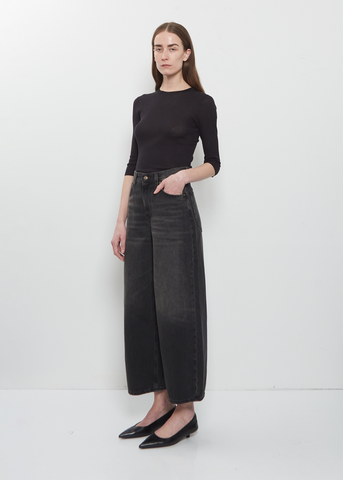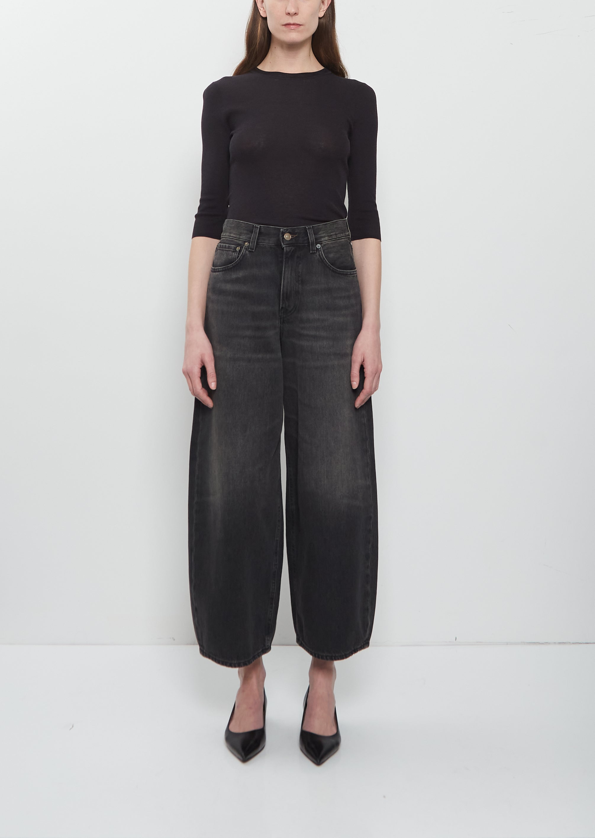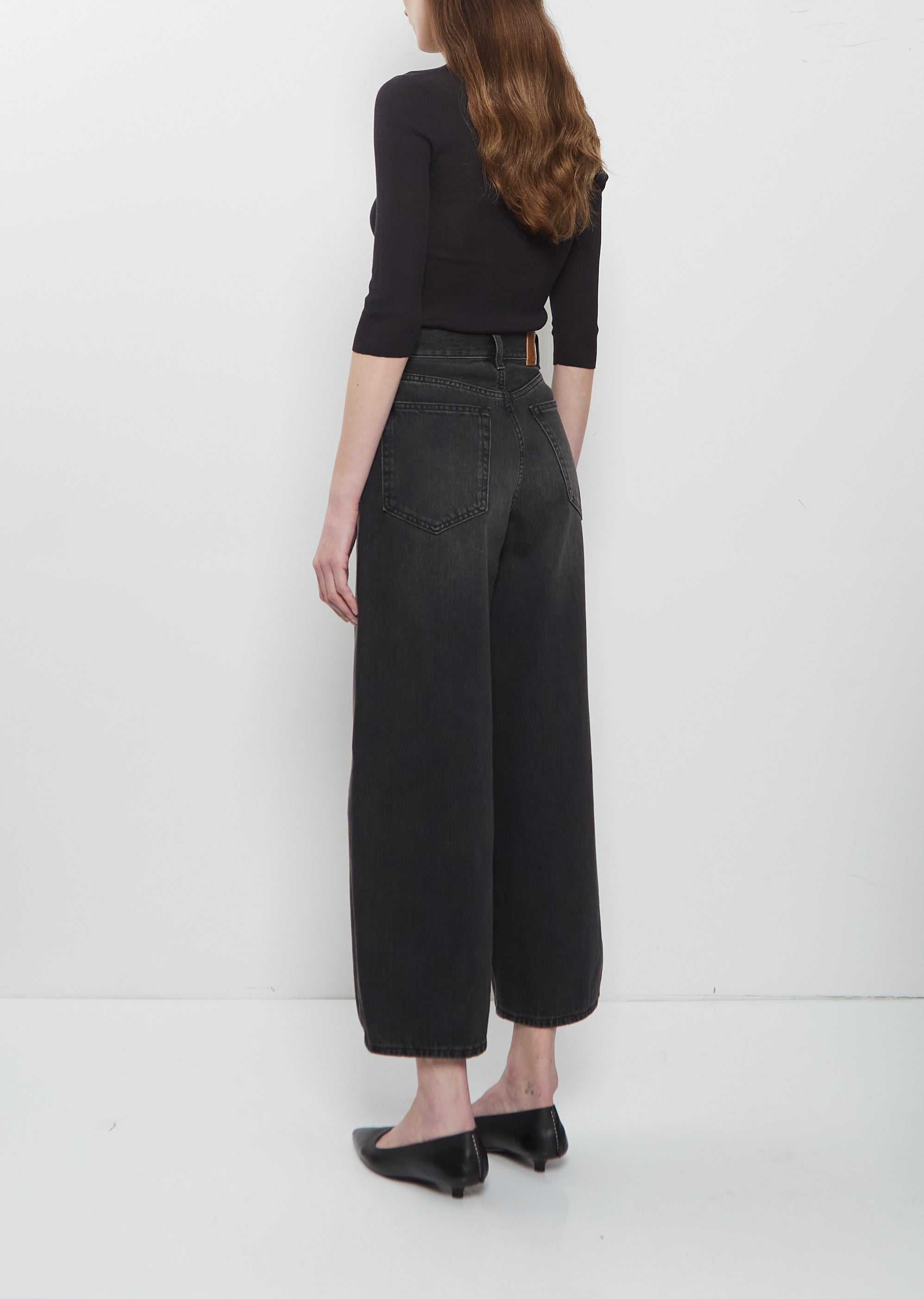 6397 black high-rise jean with cropped, wide legs in cotton denim with a washed effect. Features 5-pocket construction, belt loops and button and zip-fly fastening. Relaxed fit.
