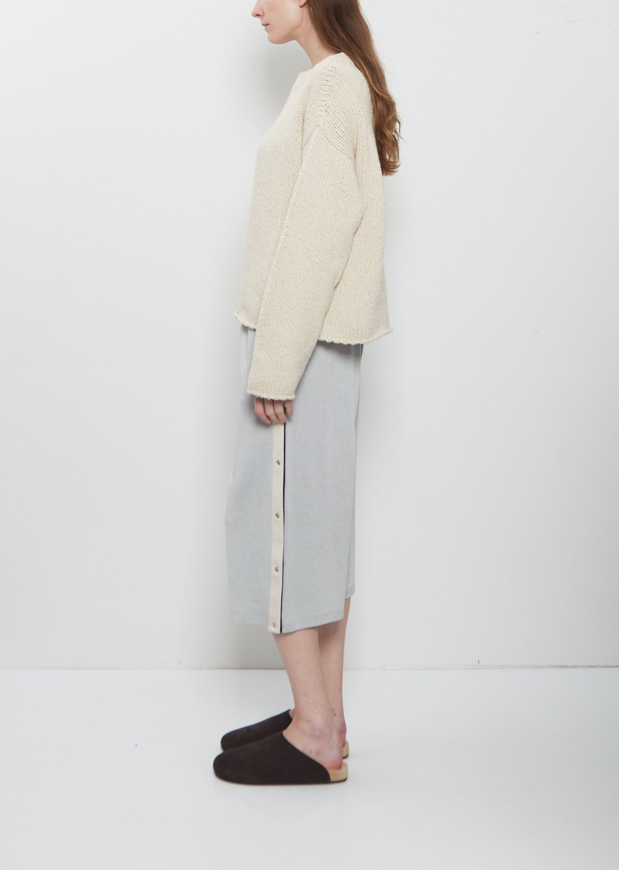 6397 cream sweater with a high boat neck and long sleeves crafted in a mid-weight Peruvian cotton knit with a slight stretch. Features dropped shoulders and roll edge finishings at cuffs and hem. Boxy, relaxed fit.