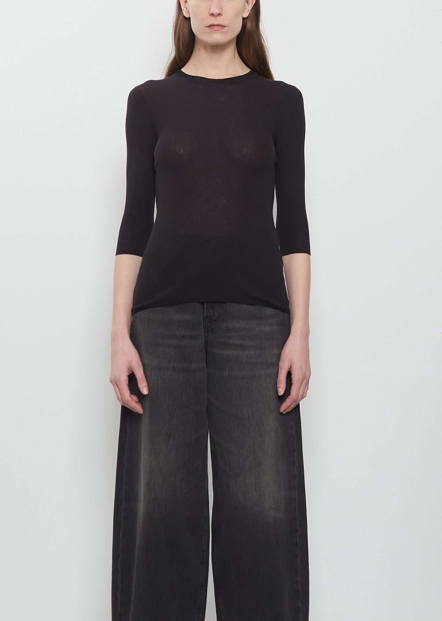 6397 off-black tee with a crew neck with a ribbed trim finish in a delicate and lightweight ribbed tencel, cotton and silk blend knit. Features elbow length sleeves and a straight hem. Closer fit.