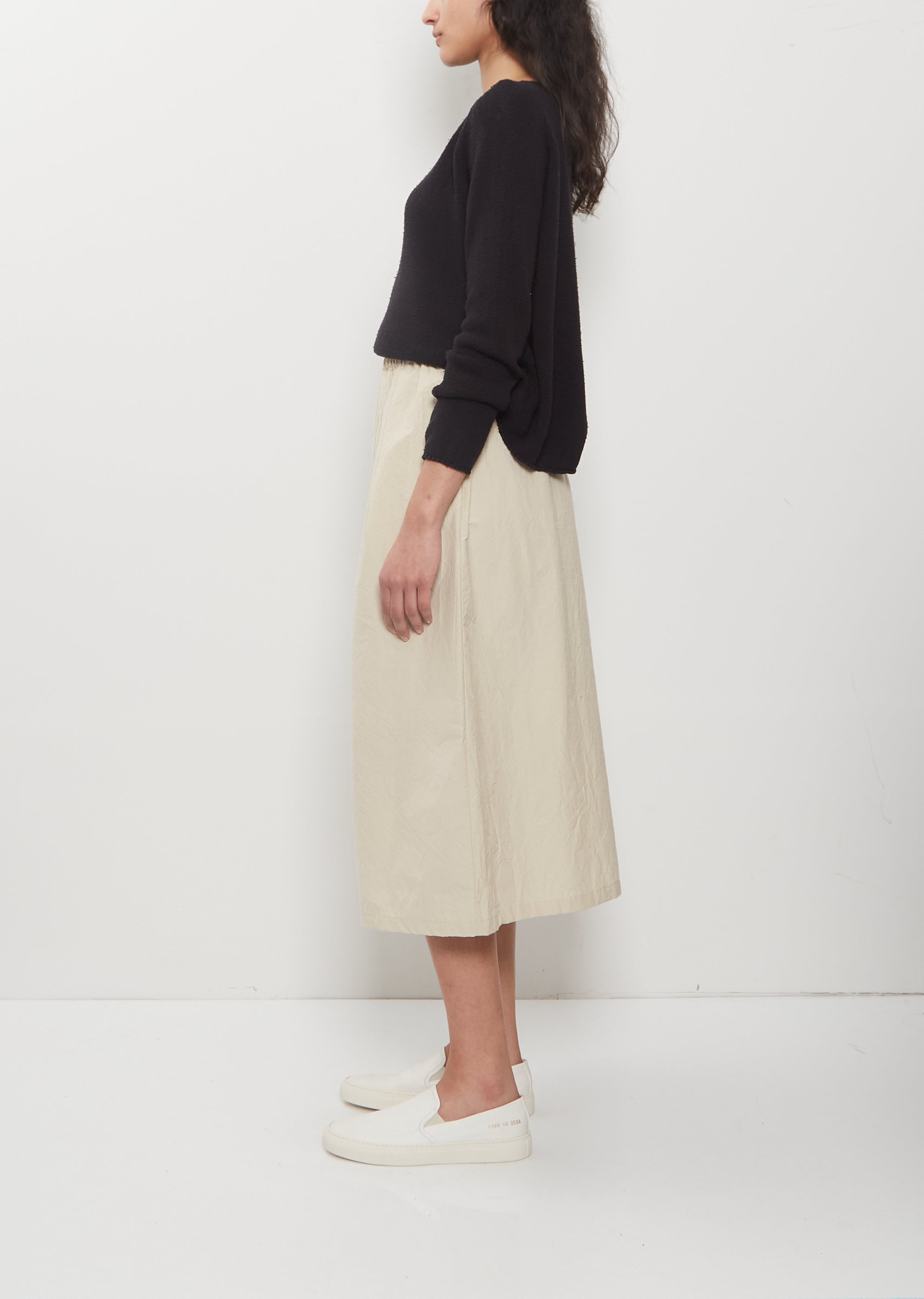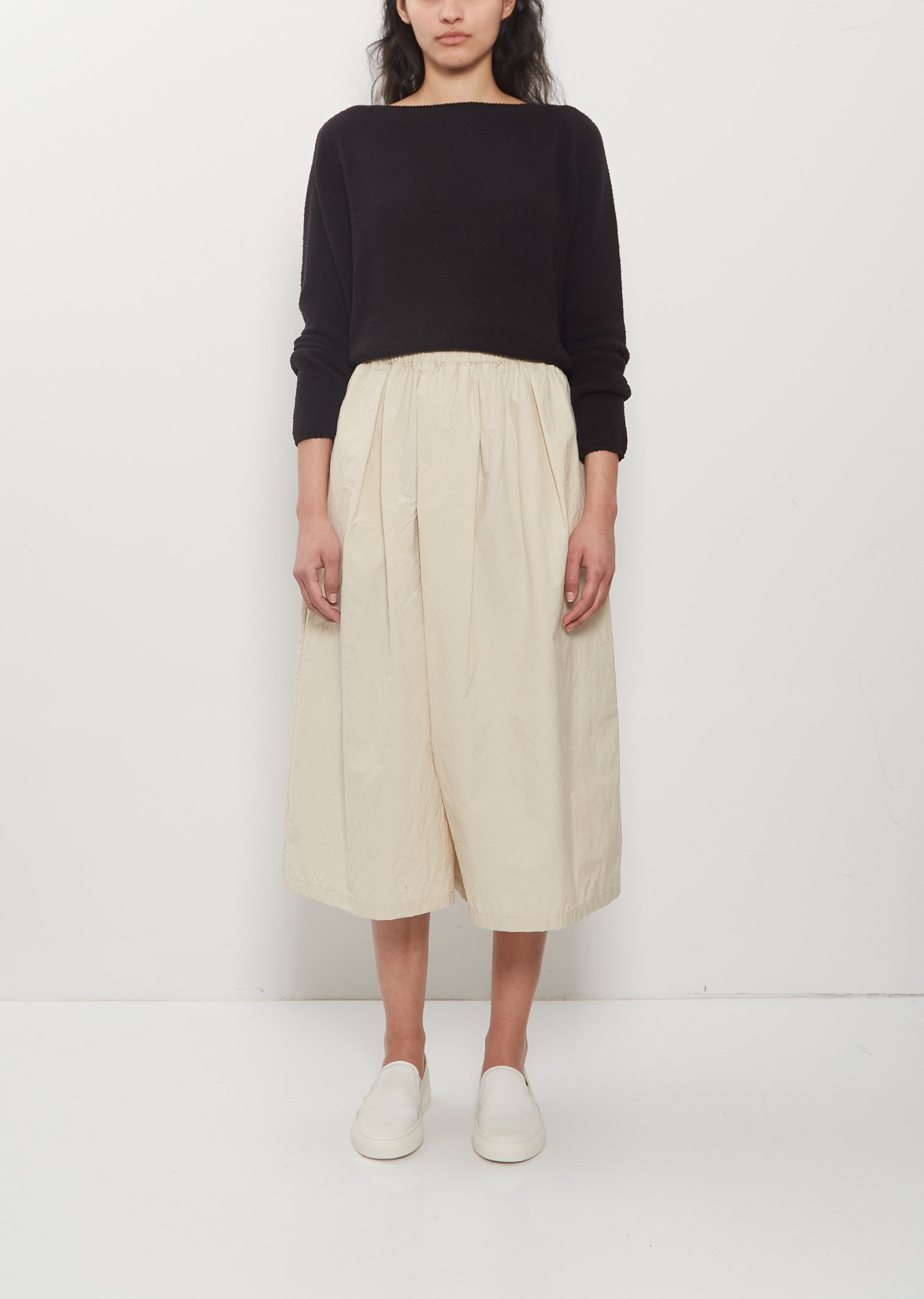 Apuntob light beige cropped pull-on pant with wide legs and wrap front detail in crisp technical cotton poplin. Features a pleated elasticated waistline and concealed side seam pockets. Relaxed fit.