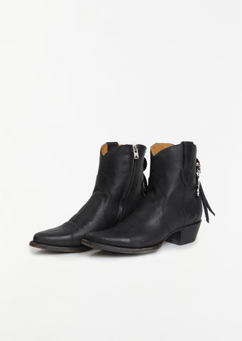 Comme des Garçons in collaboration with Mexicana black ankle boot with a pointed toe and branded silver-toned charms in rich leather. Features side tabs, tonal topstitching, a stacked leather heel, a leather sole, and a silver-toned zipper closure at side. Comes lined in soft tan leather.