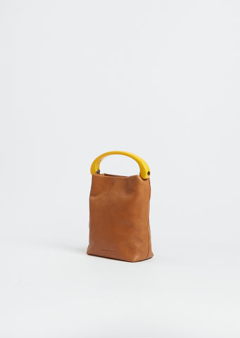 Dries Van Noten tan brown mini crossbody bag with a yellow resin curved top handle crafted in soft and supple leather. Features an optional thin shoulder strap, an interior slip pocket and a magnetic fastener at opening. Fully lined in suede.