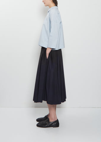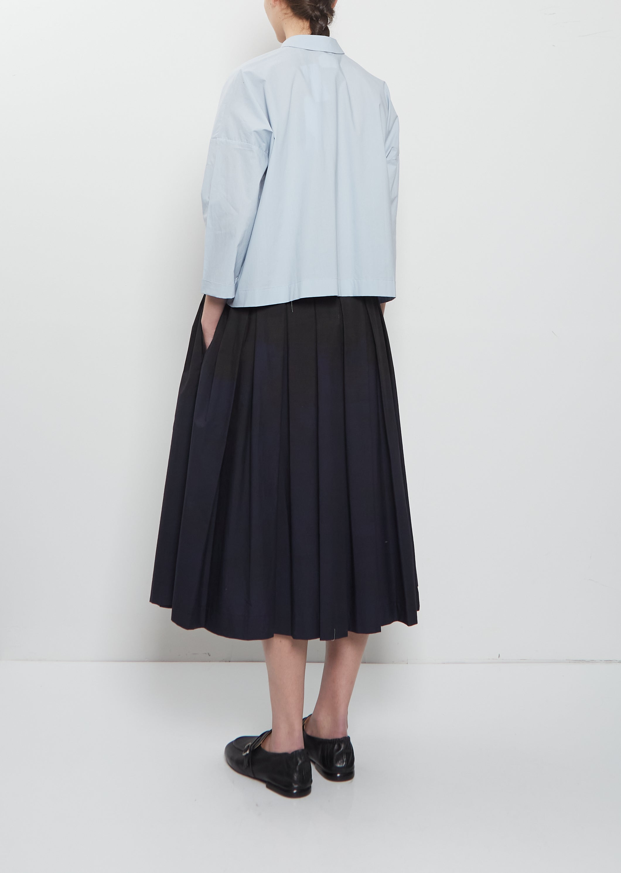 École de Curiosités sky blue signature cropped blouse with a narrow pointed collar and 3/4 sleeves in a crisp densely woven cotton with a paper-like hand feel. Features dropped shoulders and a French placket with vintage glass buttons closure.