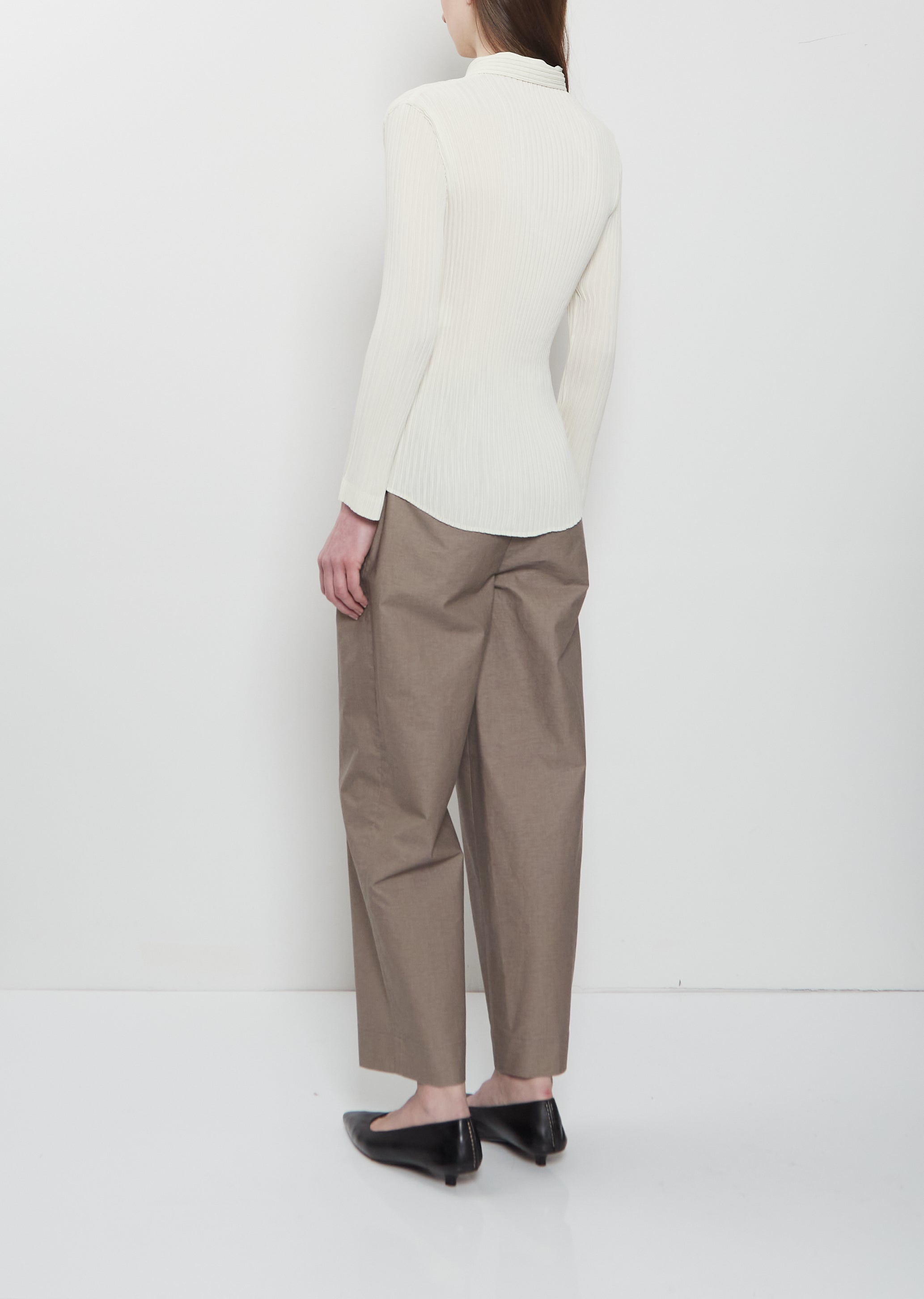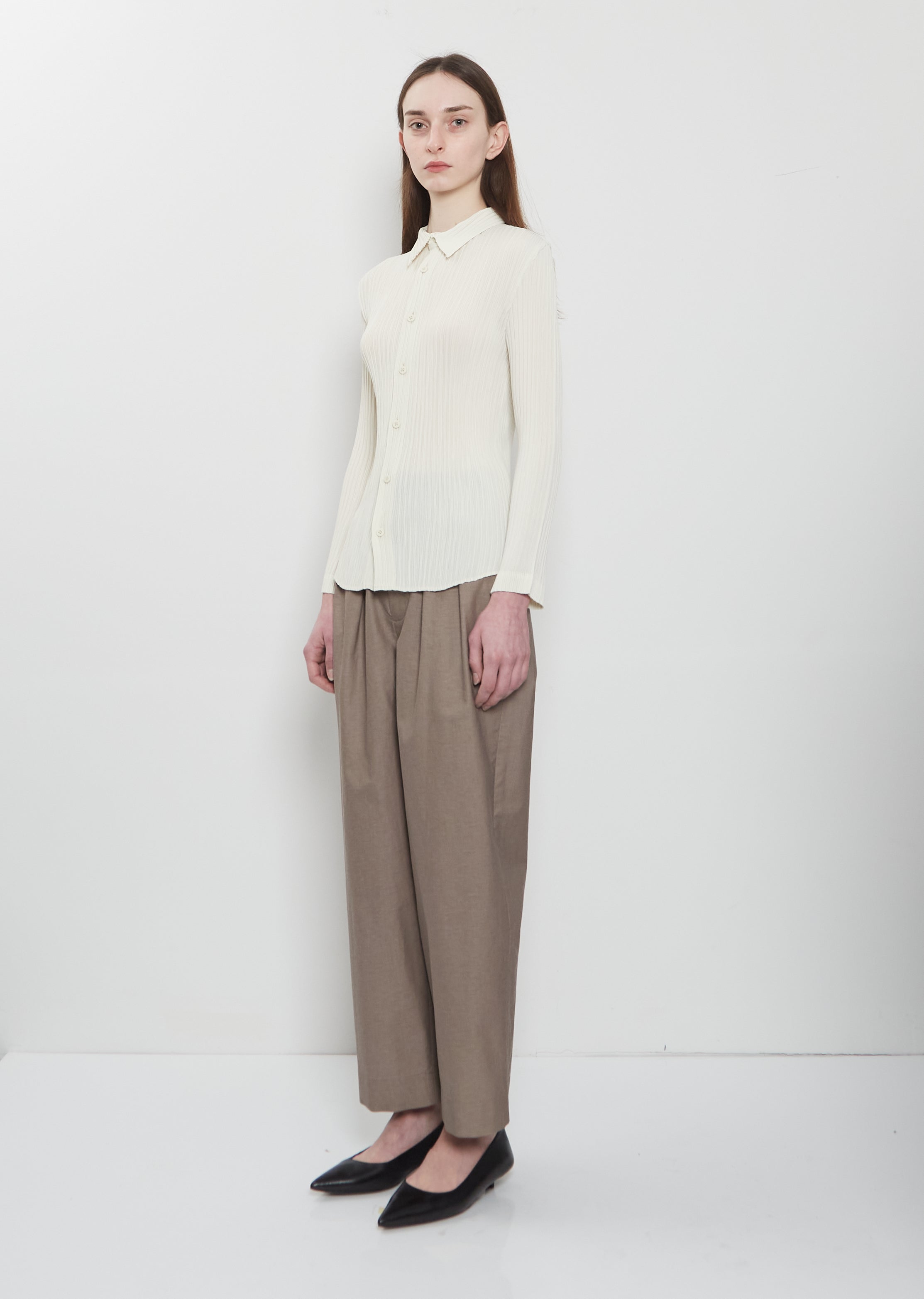 Issey Miyake shirt with a classic collar made from pleated recycled polyester with a textured finish. Features a curved shirttail and tonal buttons closure at front. Regular fit.