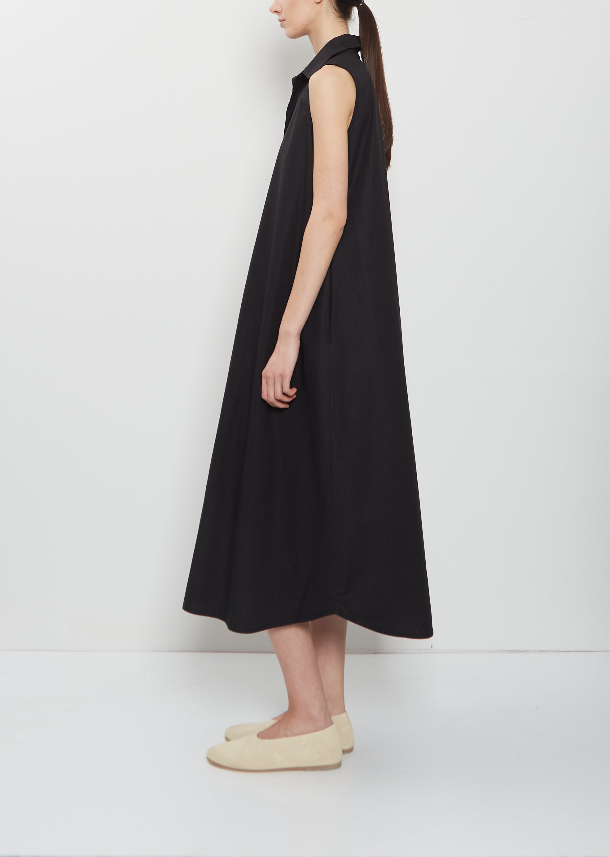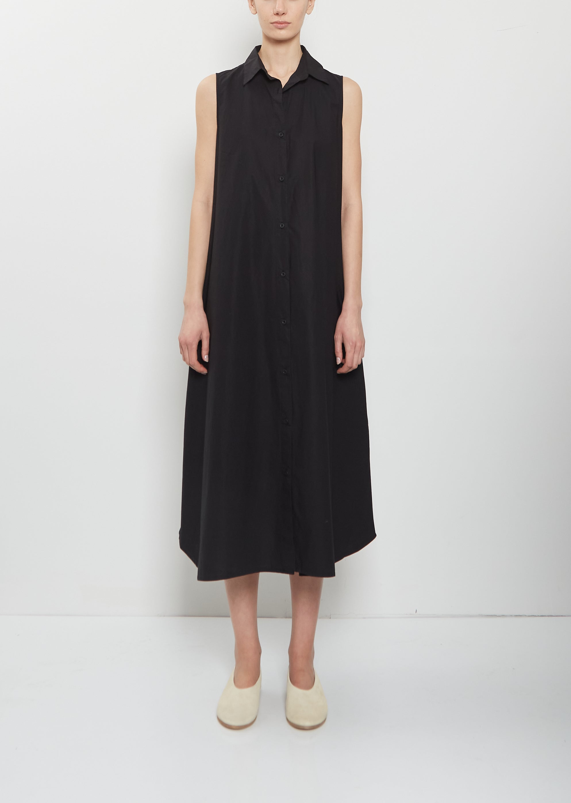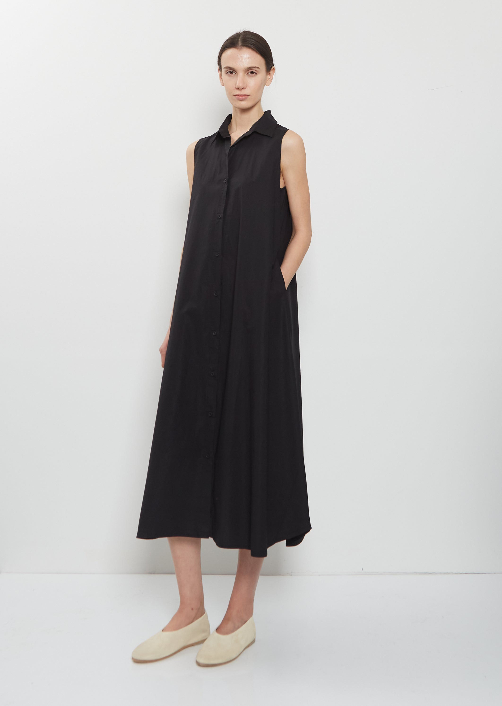 Labo.Art black sleeveless A-line shirt dress with a classic collar in a crisp cotton poplin. Features side seem pockets and a tonal buttons closure at front.