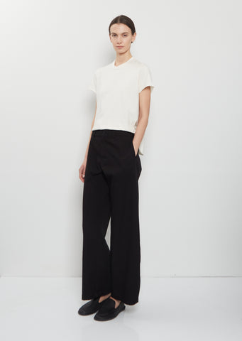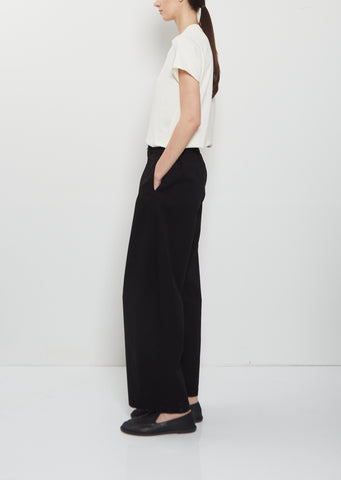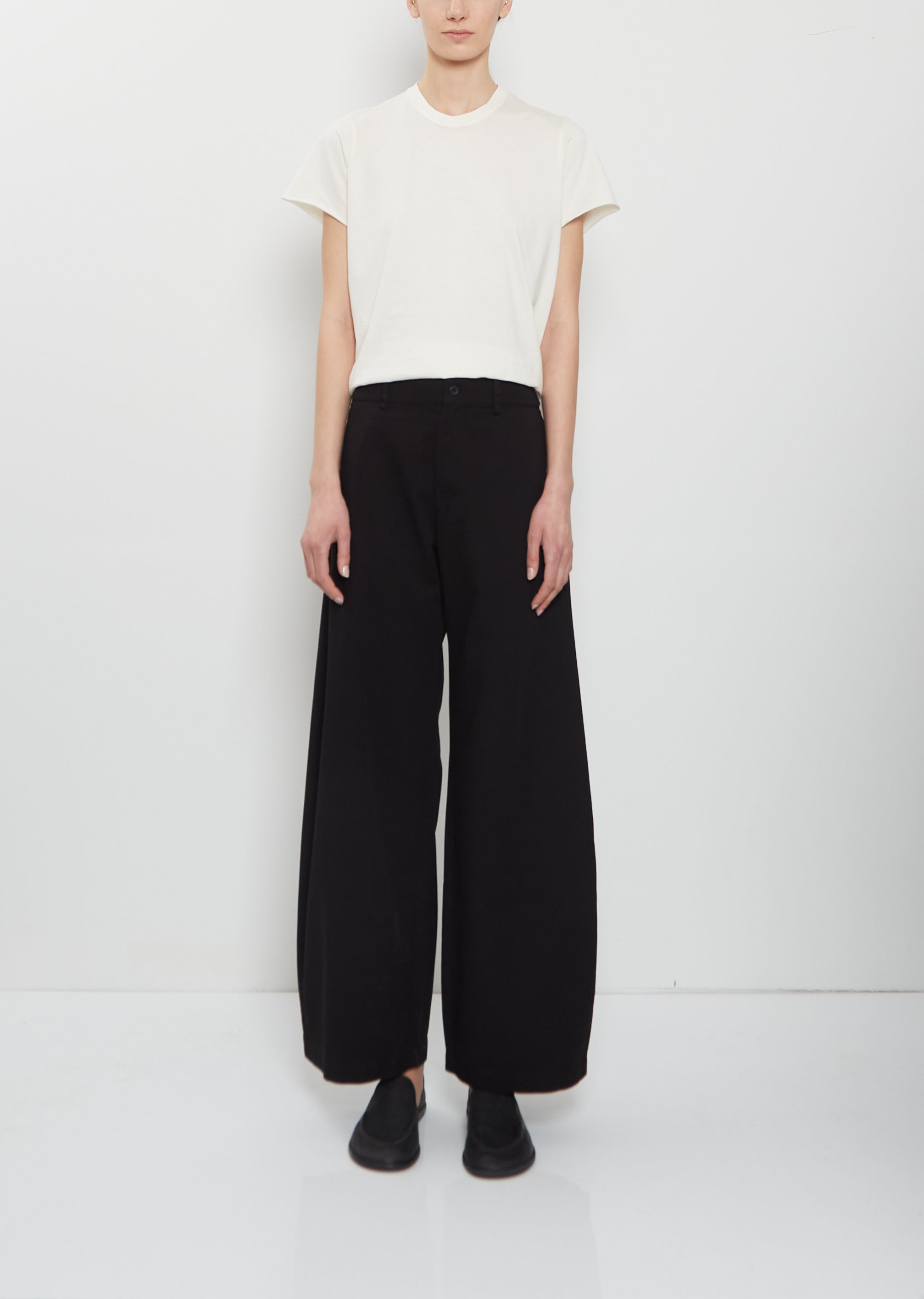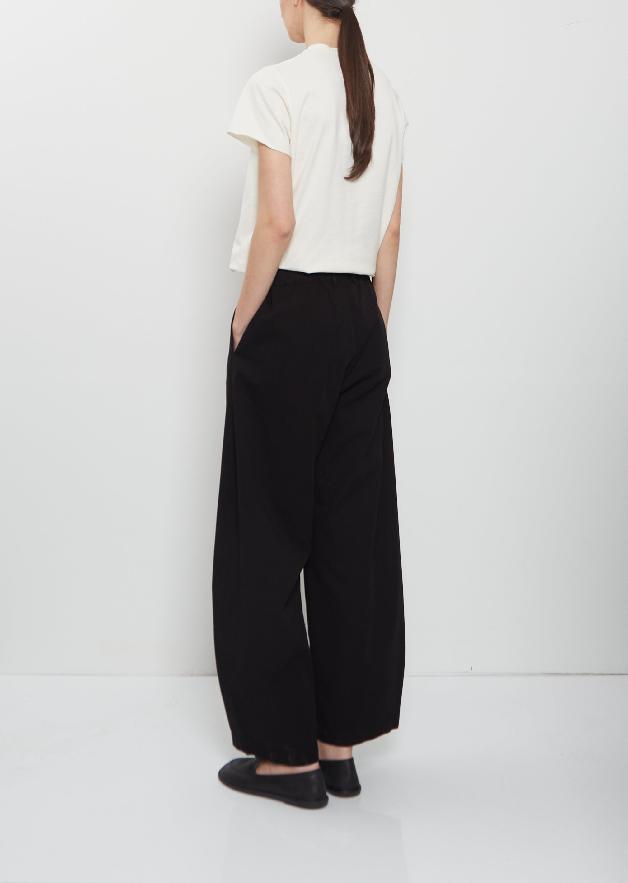 Labo.art black pant with wide, straight legs and half elasticated back waist in lightweight cotton twill. Features belt loops, side seam pockets and tonal button and zip-fly closure. Relaxed fit.