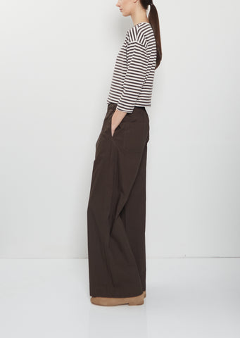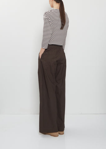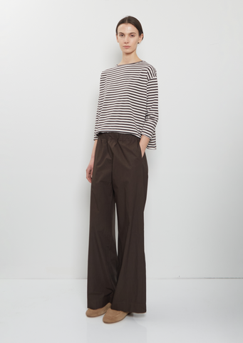 Labo.Art chocolate brown pull-on pants with wide legs and front pleats in crisp cotton poplin. Featuring an elasticated waistline, side seam pockets and back patch pockets. Relaxed fit.