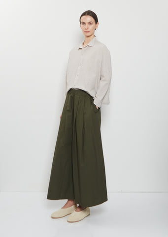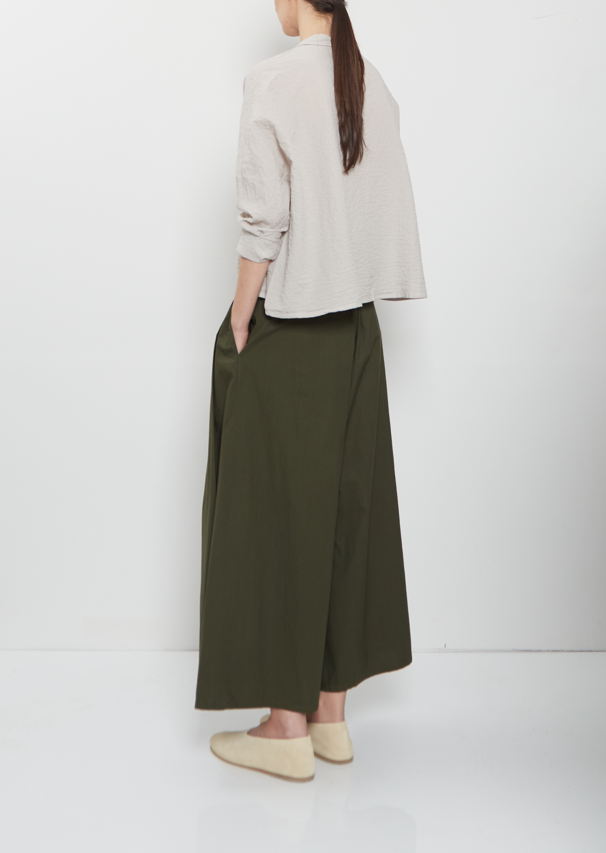 Labo.Art olive cropped pull-on slightly cropped pants with wide legs and double pleats at front in crisp cotton poplin. Features an elasticated waistband and side seam pockets. Relaxed fit.