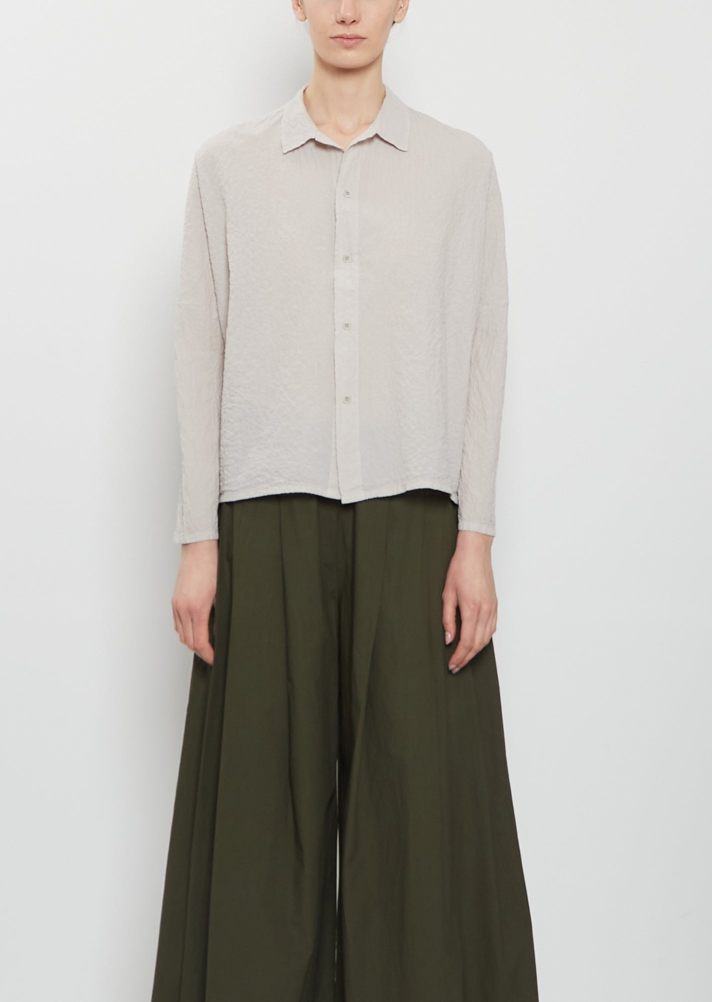 Labo.Art light grey shirt with a spread collar and tonal button front in cotton with a wrinkled effect. Features dropped shoulders and a straight hem. Relaxed fit.
