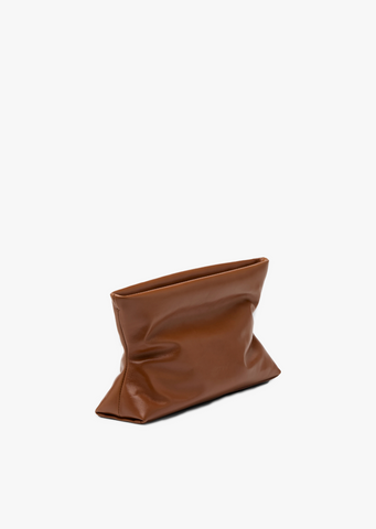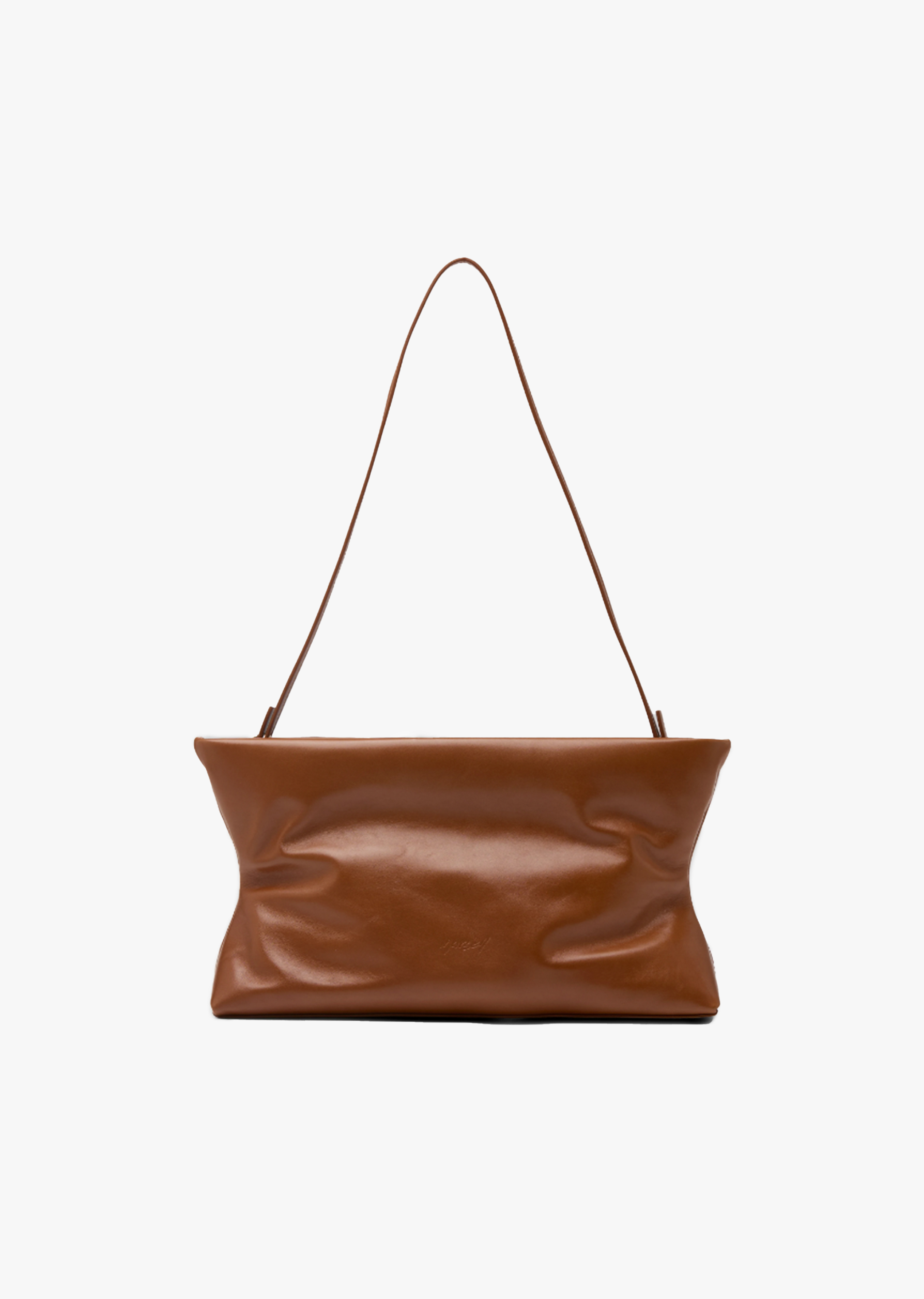Marséll basalt brown clutch bag with an hourglass silhouette and removable shoulder strap in soft calfskin leather with a shiny finish. Features a single interior zipper pocket and a concealed top zip closure. Fully lined in tonal leather.