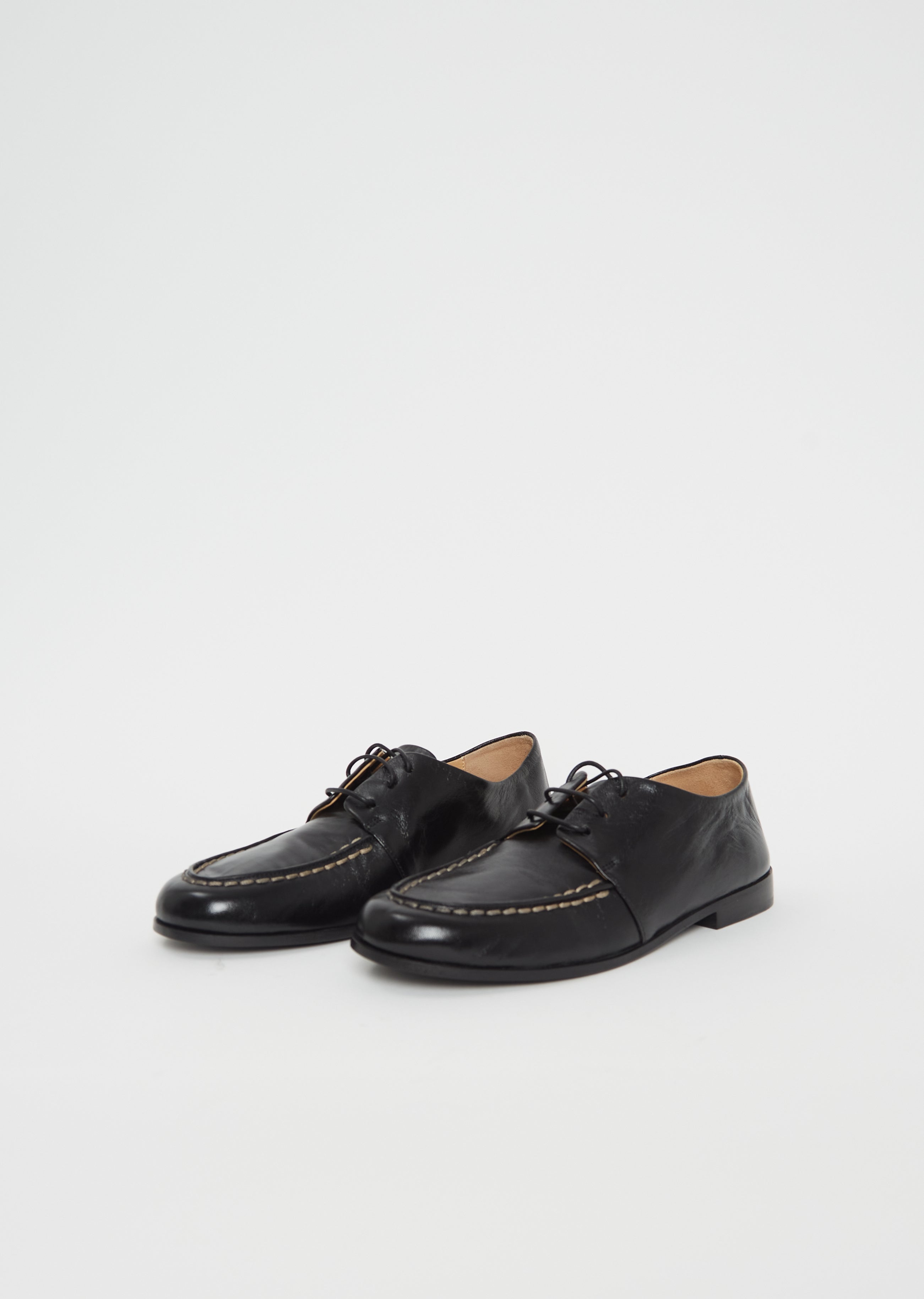 Marsèll black laced loafer with piping at round toe and contrasting beige topstitching handcrafted in polished lambskin leather with a crinkled shiny finish. Features tonal laces, a soft tan leather interior, and a hand-colored natural leather sole with a stacked heel.