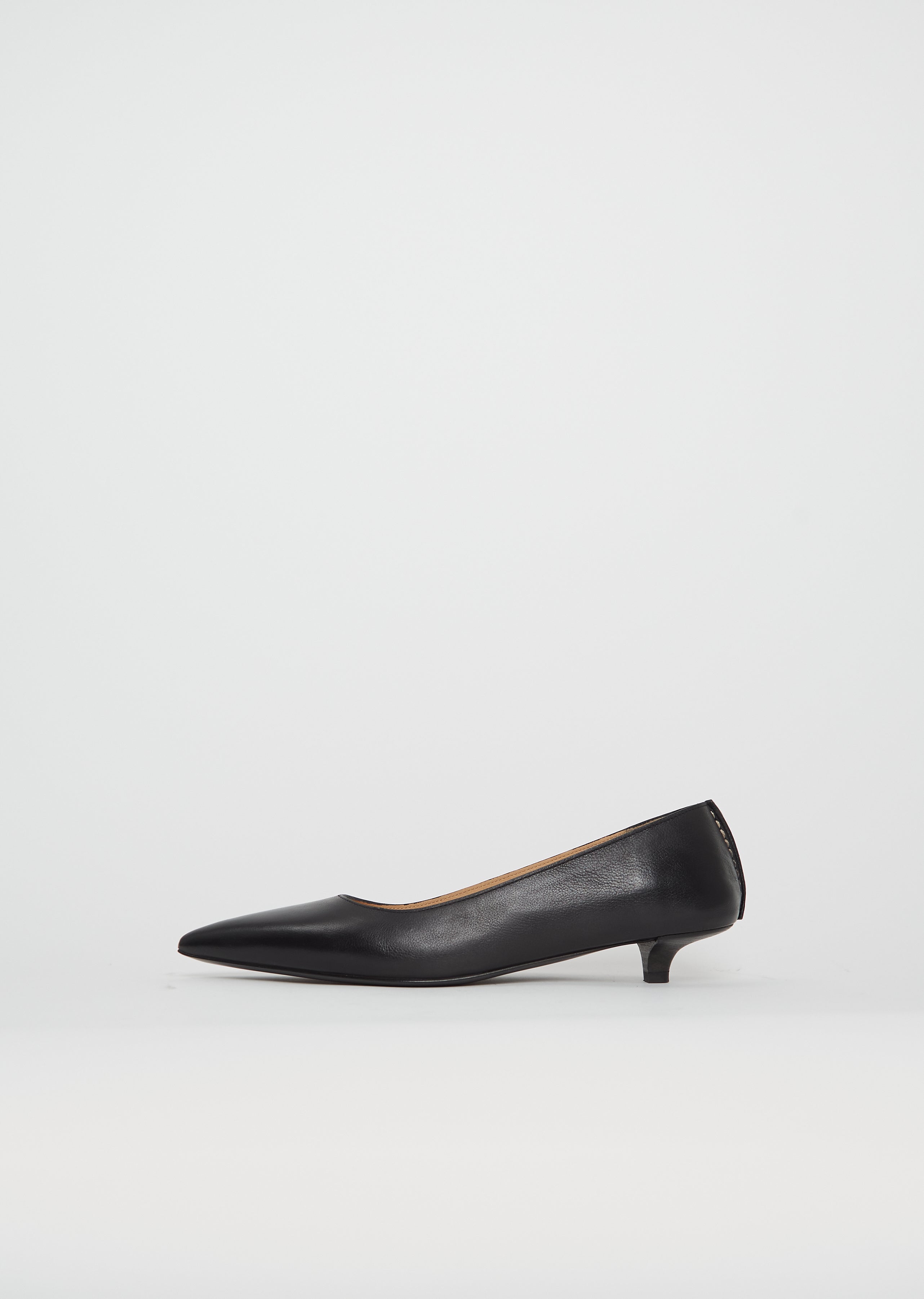 Marsèll black kitten-heel pumps with a pointed toe and contrasting hand-stitching at back in pebbled calfskin leather. Features soft tan leather lining, soft tan leather lining, leather outsole, and a thin stacked heel covered in leather.