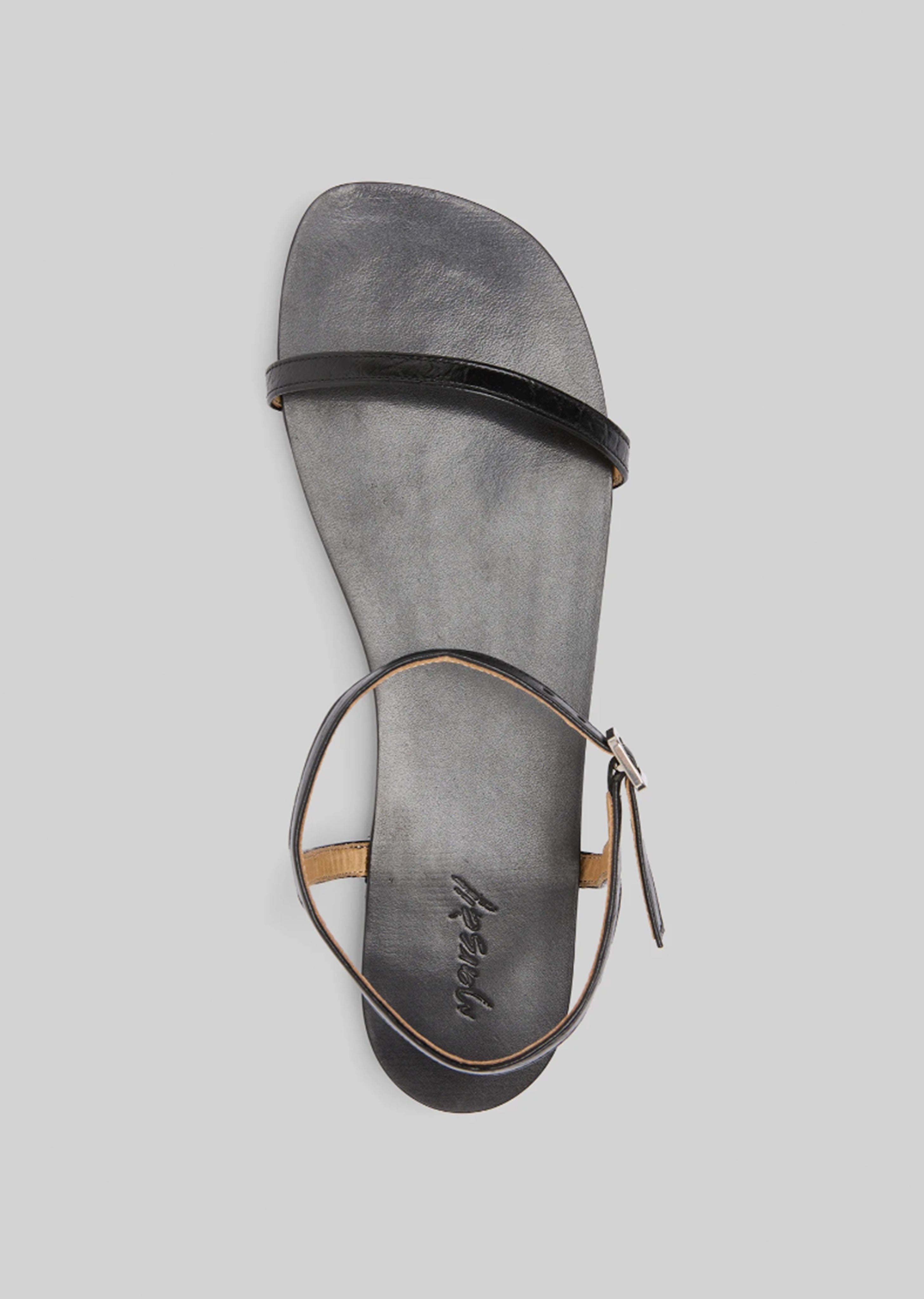 Marsèll black sandals with a slim upper strap in crinkled pebbled leather. Features a micro rubber insole and an almond-shaped hand-painted leather sole.