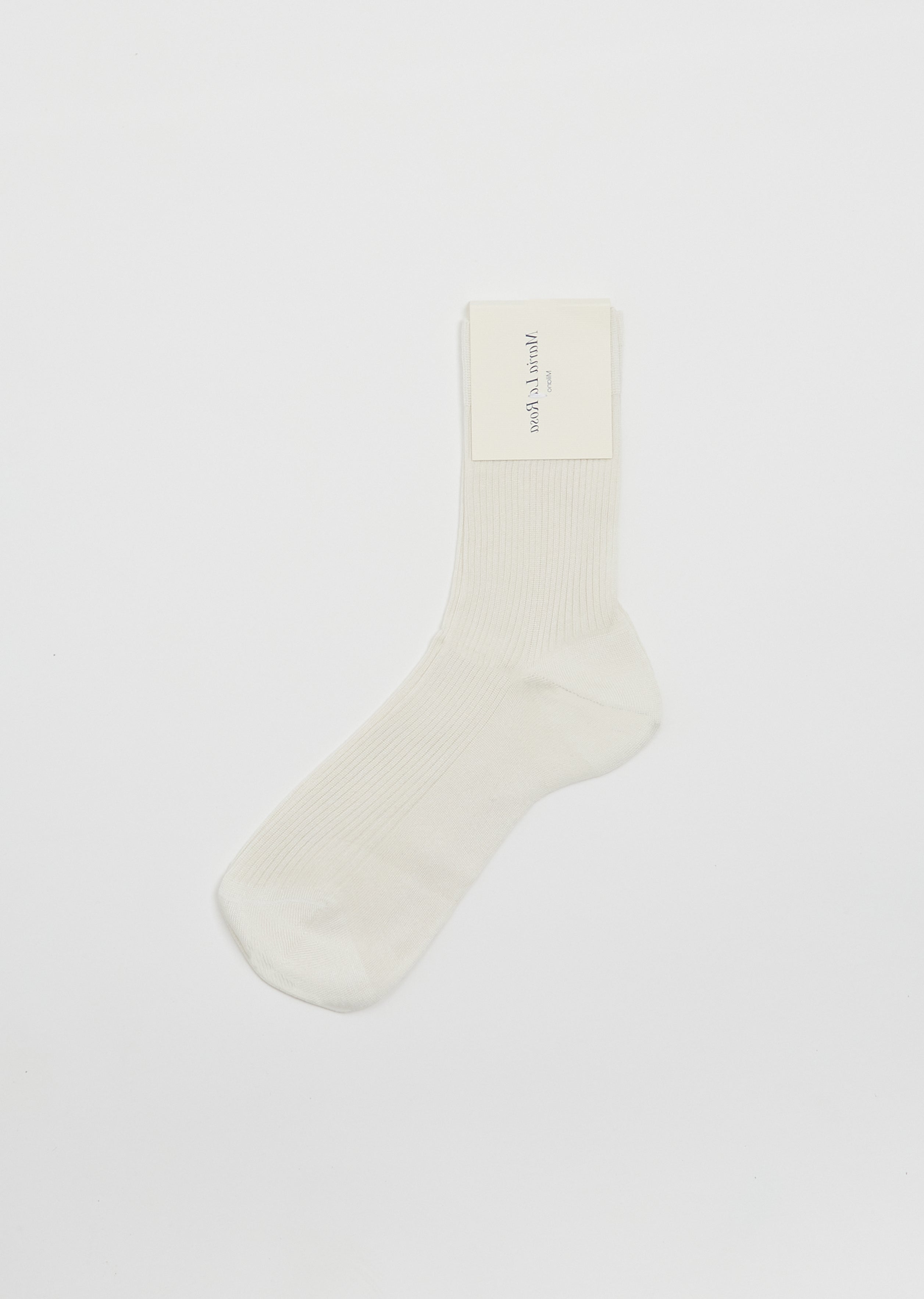 Maria La Rosa off white mid-calf socks in a delicate and soft silk blend ribbed knit with reinforced toe, heel, and top.