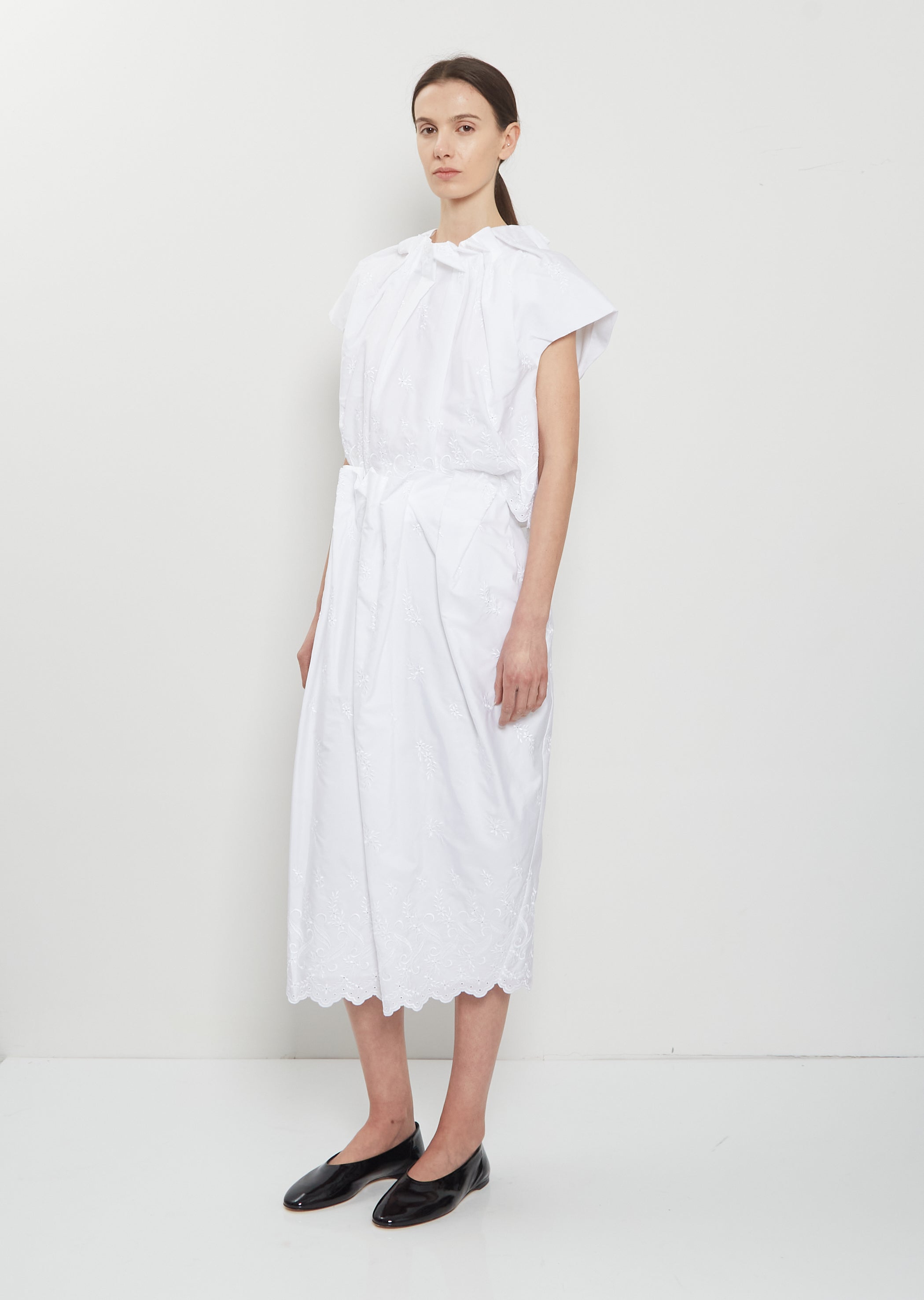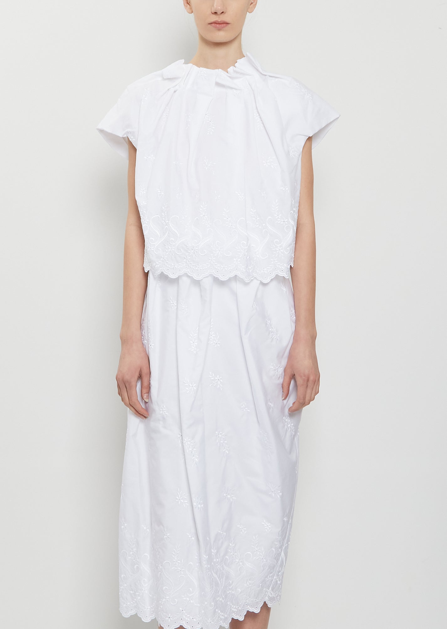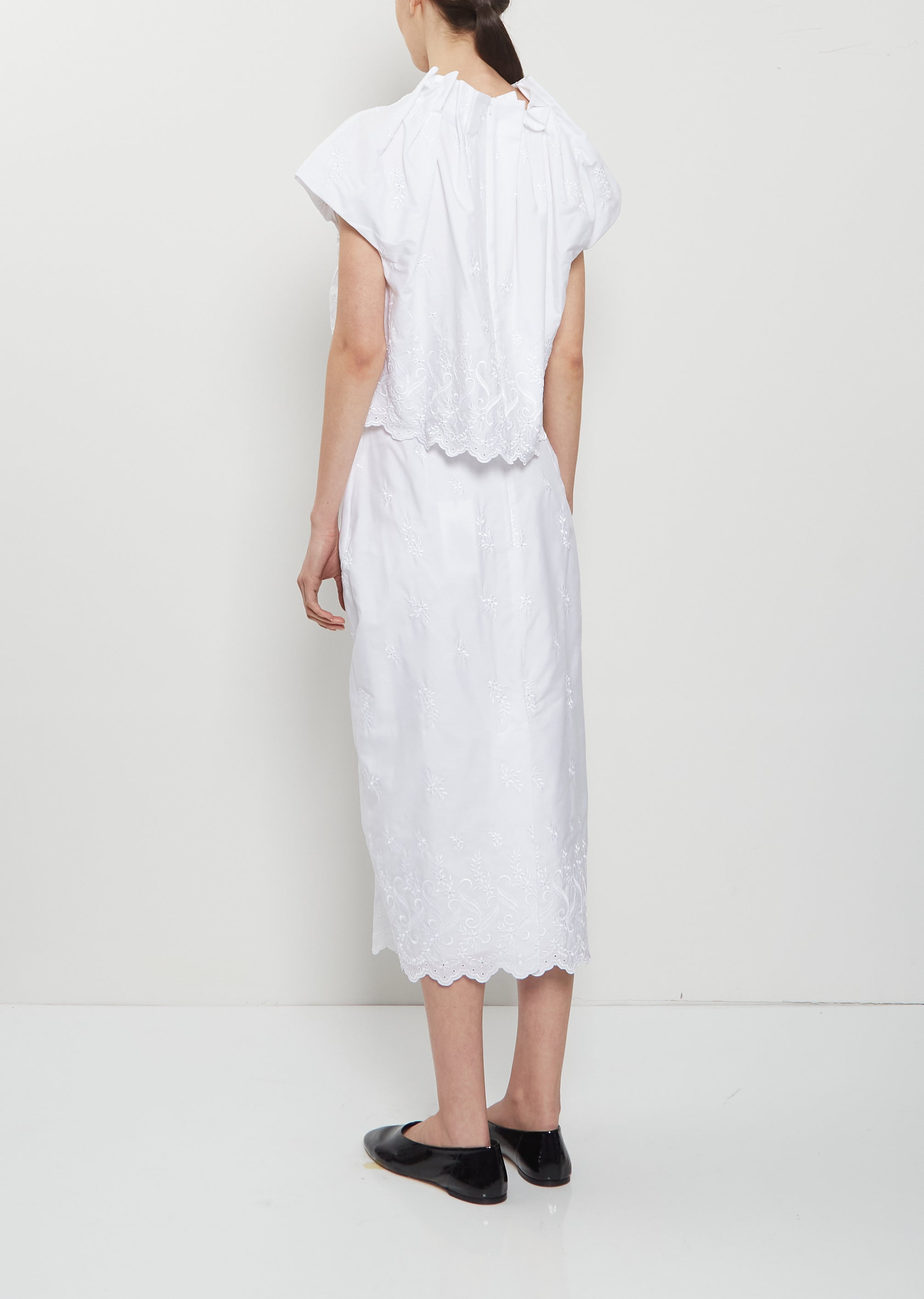 Simone Rocha white cropped top with a gathered neckline to resemble flower petals in crisp cotton with eyelet lace details. Features cap sleeves and a concealed zipper closure at back. Regular fit.