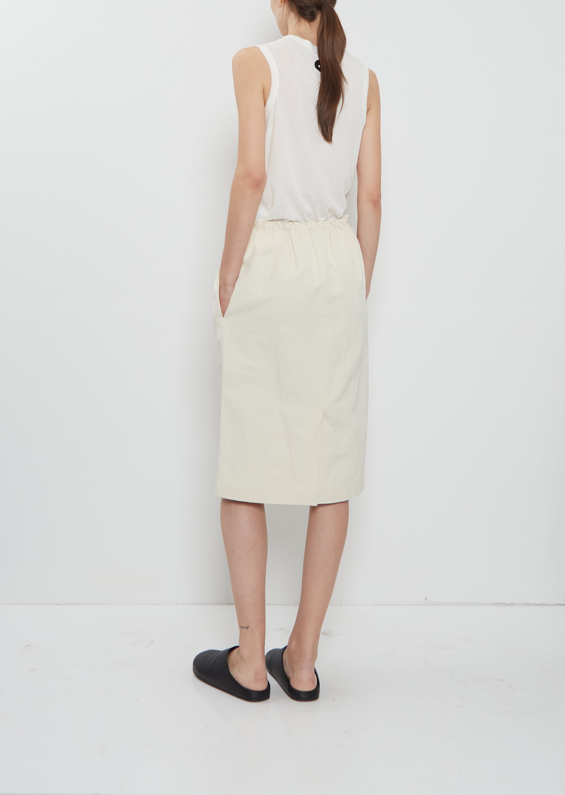 Ter et Bantine tube pull-on skirt with an elasticated, gathered waistband in a crisp linen. Features concealed side pockets and slit at back. Comes unlined.