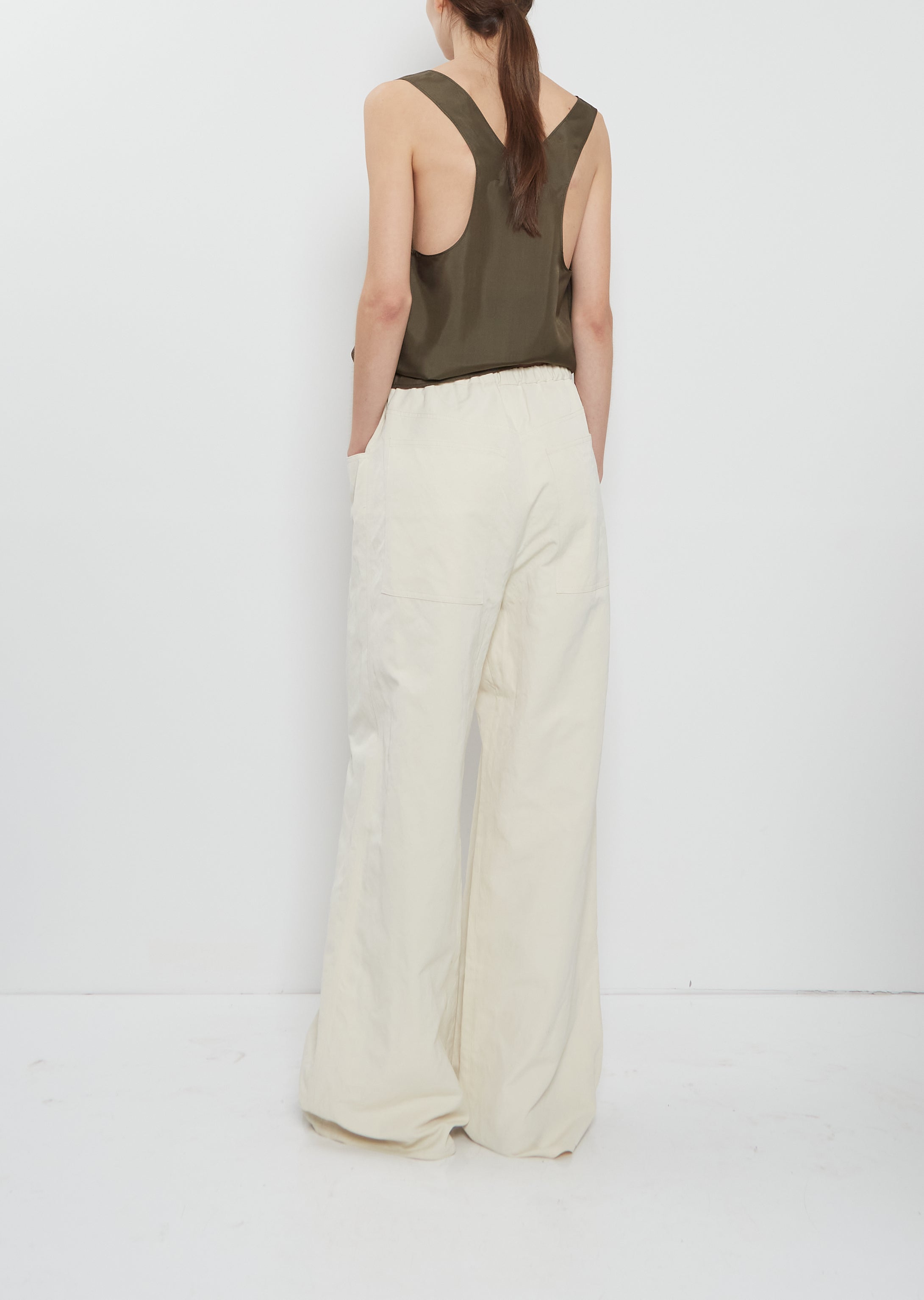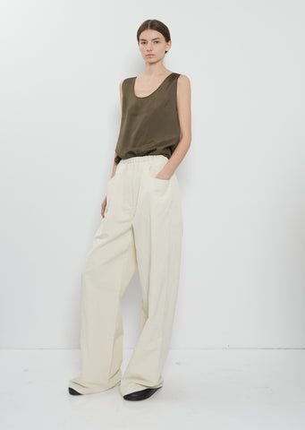 Ter et Bantine pull-on pants with wide, straight legs in a lightweights and crisp linen blend. Features an elasticated waistband, a faux fly, deep side pockets and two patch pockets at back. Relaxed fit.