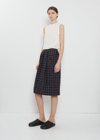 Ter et Bantine black checkered pencil skirt with a pleated front in crisp cotton. Features an elasticated waist and concealed zipper at back. Comes line in black satin.