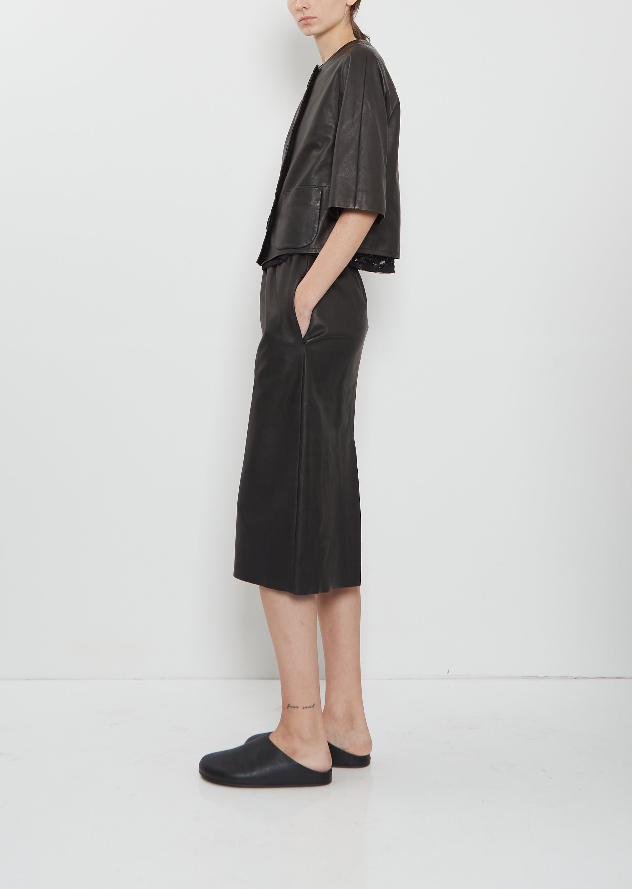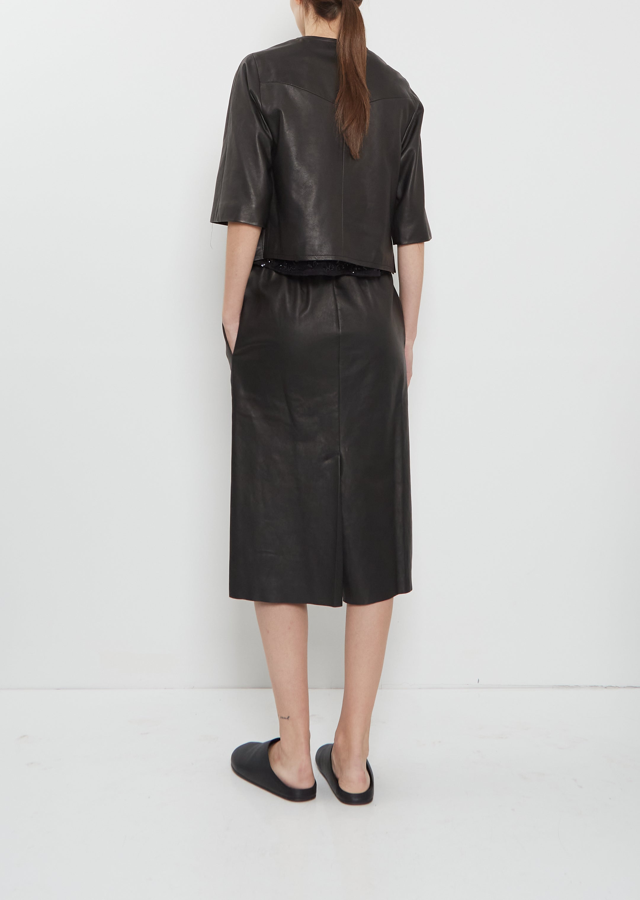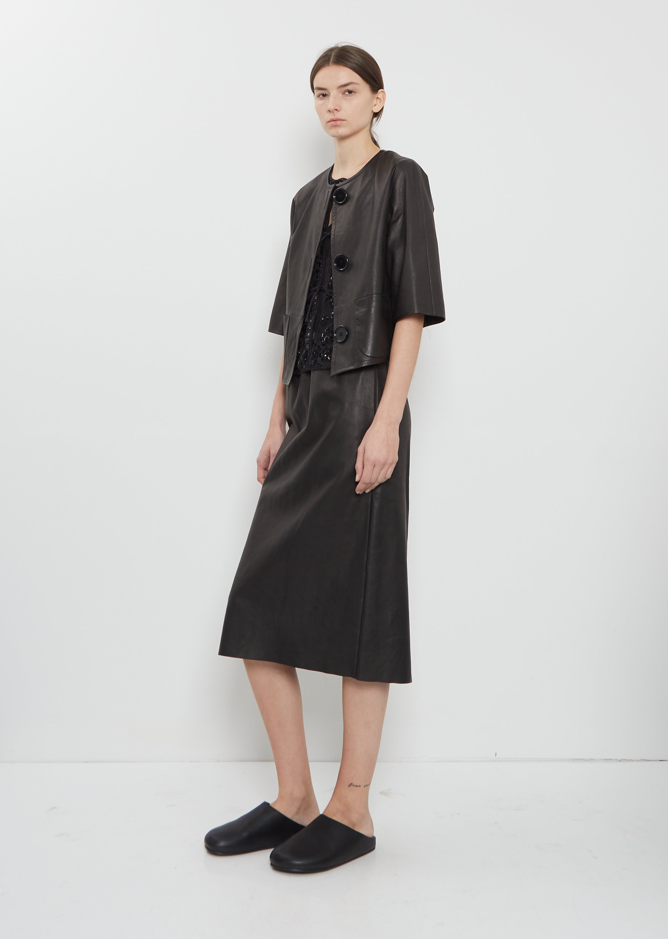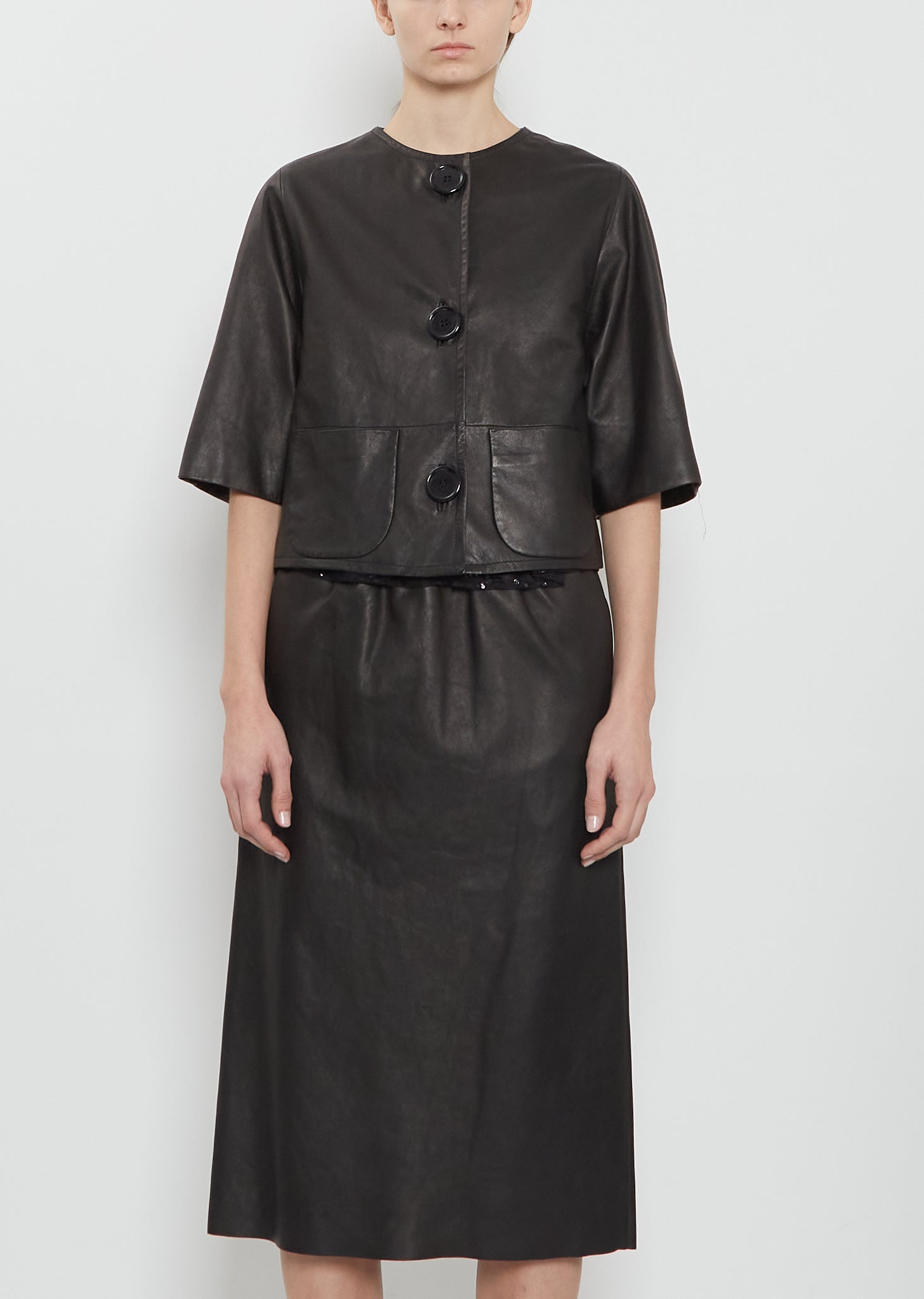 Ter et Bantine black short paneled jacket with short sleeves and a crew neck in soft nappa leather. Features an oversized buttons closure at front, slits at sides, back yoke and two patch pockets at front.