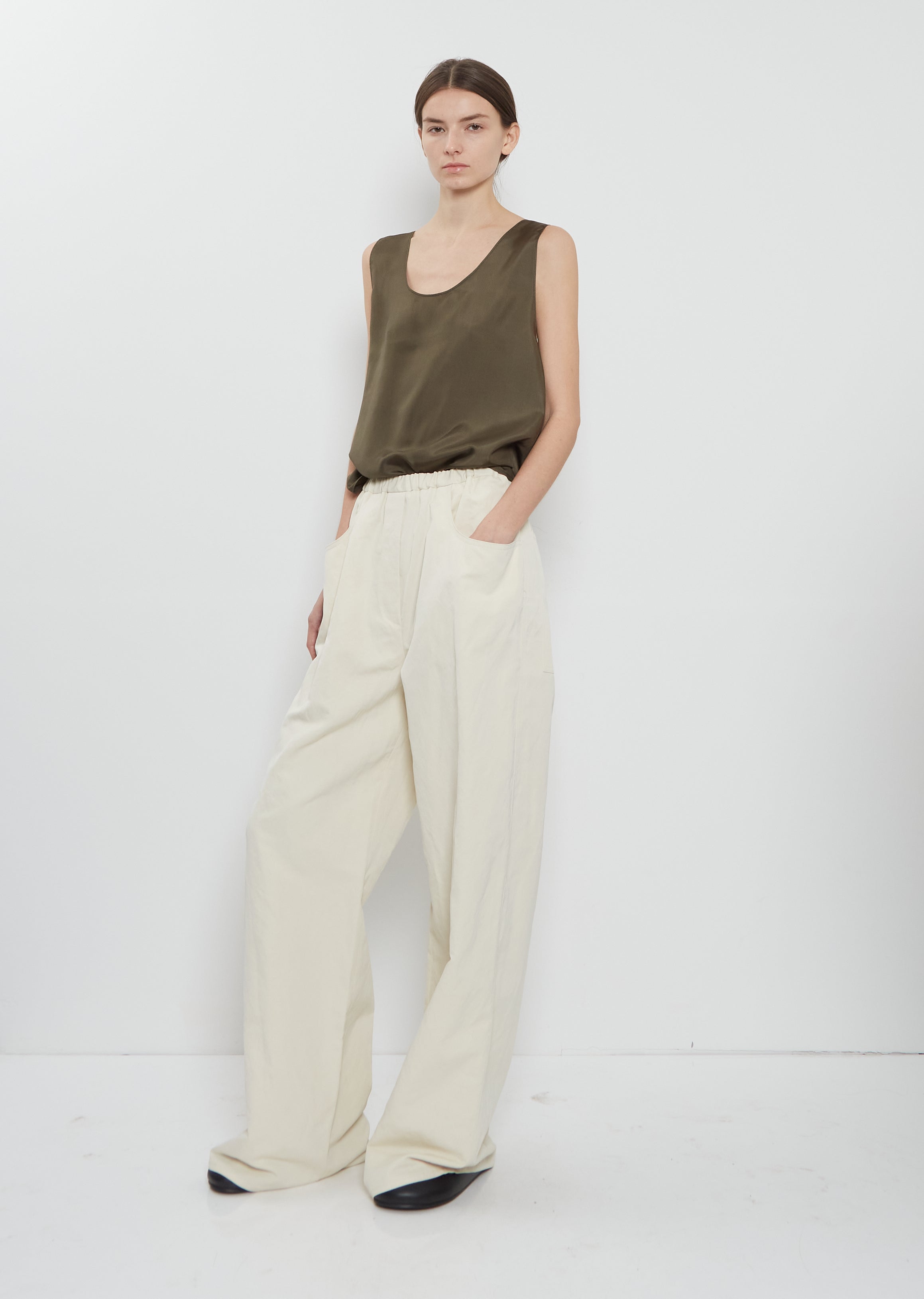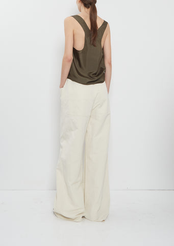 Ter et Bantine khaki green tank with wide shoulder straps and a scoop neckline in smooth and luxurious silk. Features wide arm holes and a straight hem.