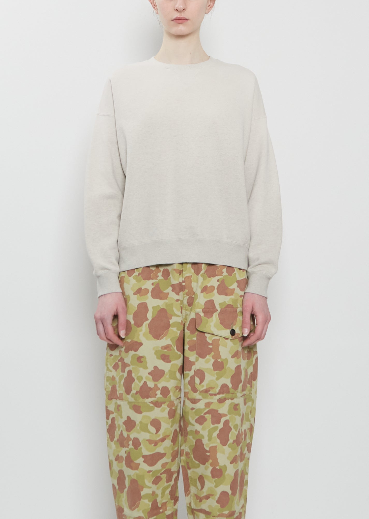 Visvim grey sweatshirt with a round neck and dropped shoulders in a soft garment-dyed cotton French terry sweatshirt with a washed, worn-in effect. Features ribbed trim finishings at cuffs and hem. Relaxed fit.