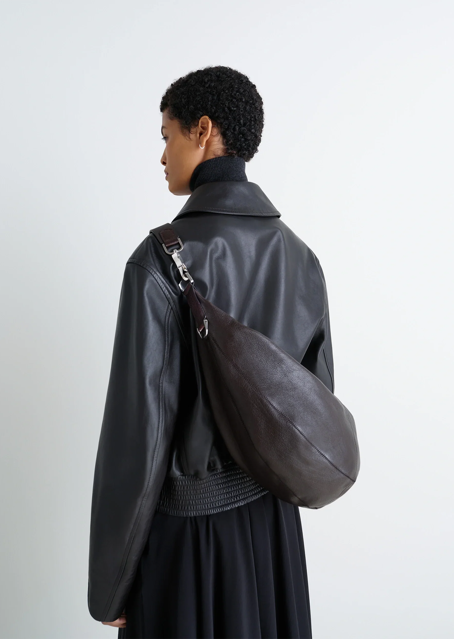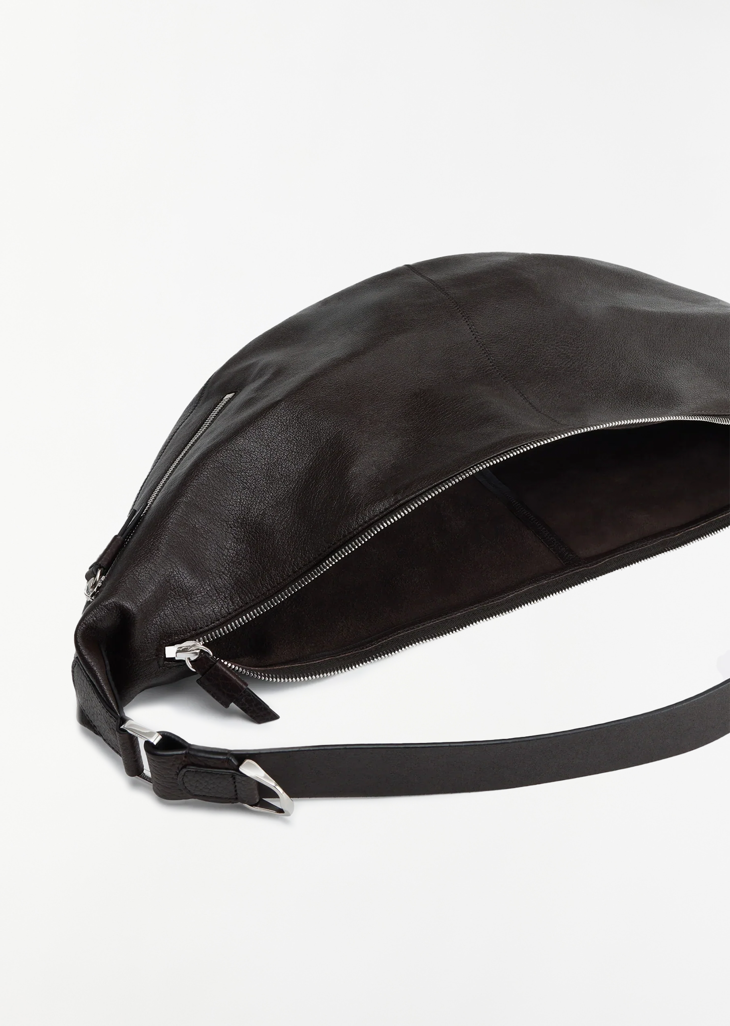 Lemaire dark chocolate bag with an adjustable snap hook shoulder strap in vegetable-tanned grained buffalo leather. Features a double top zipper closure and zippered pocket at side. Finished with silver-toned hardware throughout. Can be worn on the shoulder or crossbody.