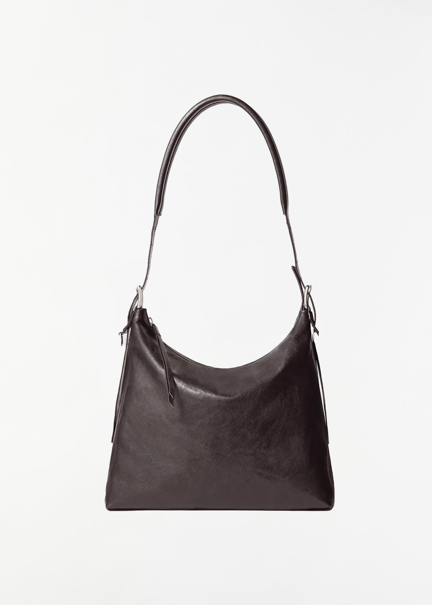 Lemaire dark chocolate brown hobo bag in the small size with an adjustable leather belt-like strap with buckles and keepers in smooth vegetable-tanned paper leather. Features a silver-toned top zipper closure with leather pull tab, an interior zipper pocket with embossed branded logo. Can be worn on the shoulder or across the body.