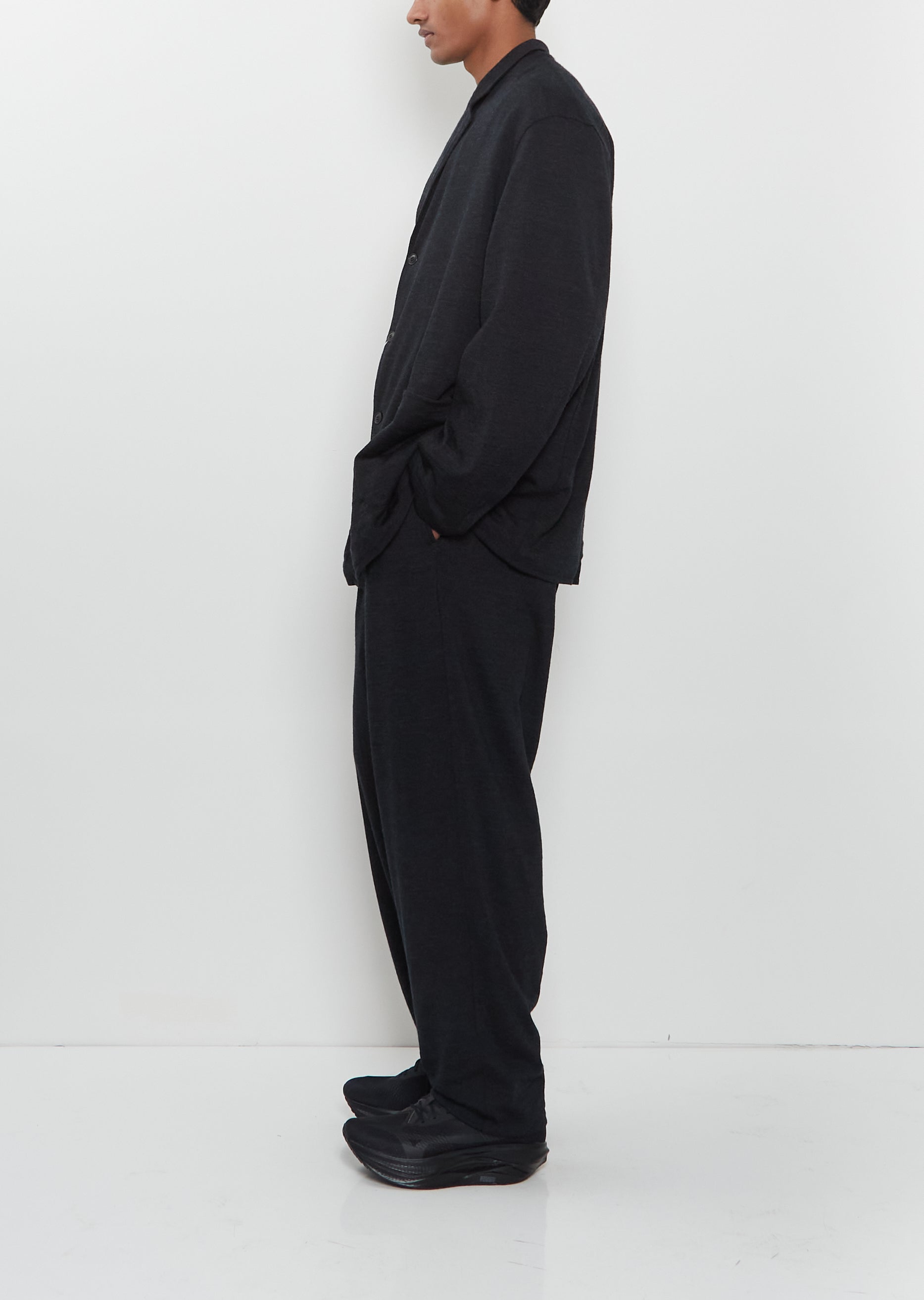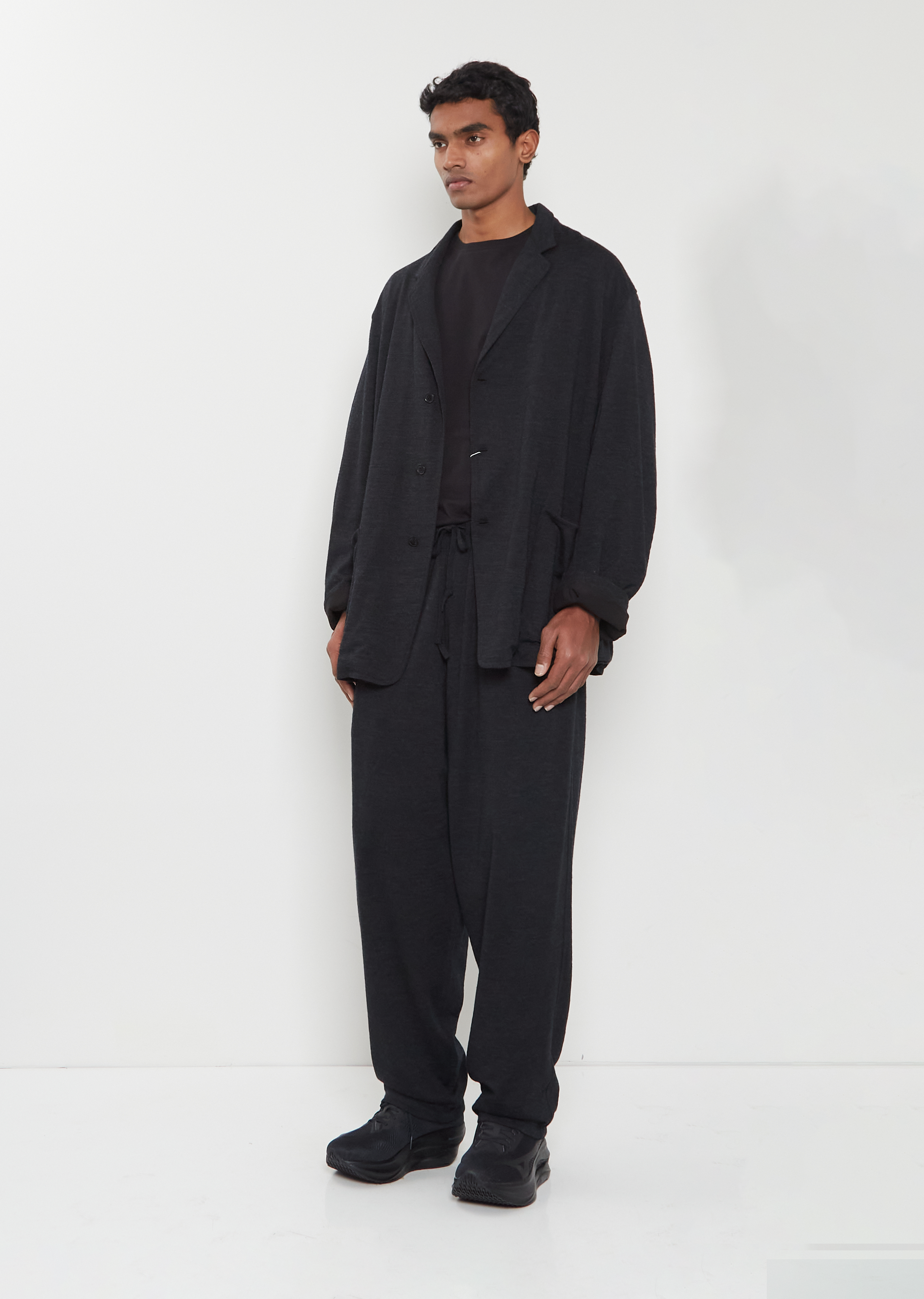 Comoli charcoal jacket with a notched collar and three button closure in wool knit. Features dropped shoulders and front patch pockets. Lined in black cotton fabric.