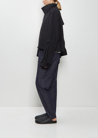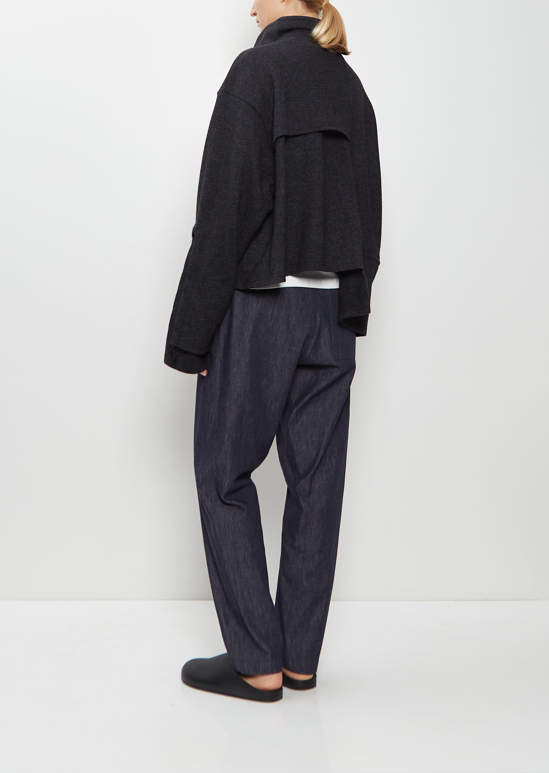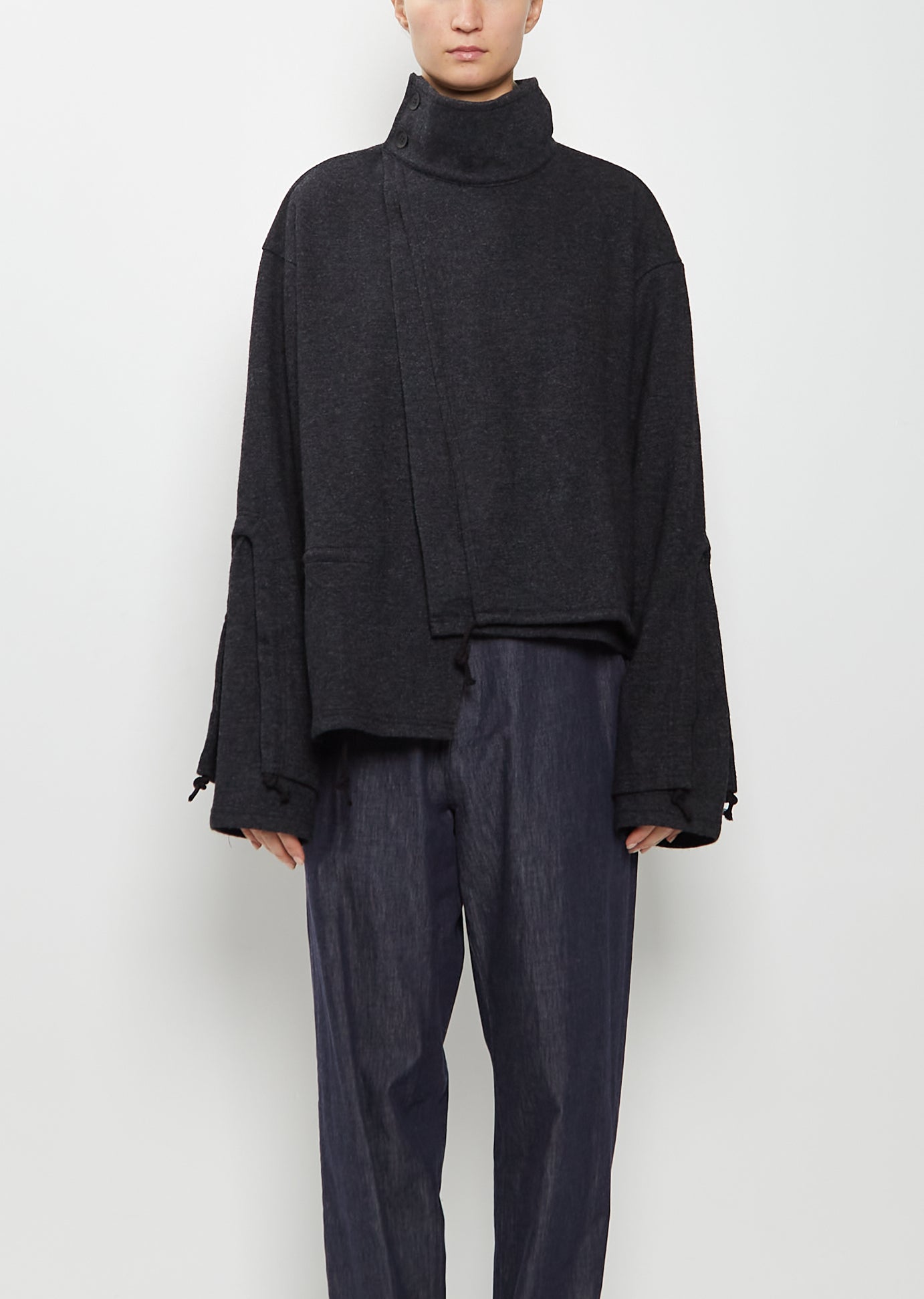 Yohji Yamamoto charcoal asymmetric jacket with a buttoned stand collar and concealed zip front in a felted wool blend. Features dropped shoulders, layered construction throughout, and adjustable drawstring hem and cuffs.