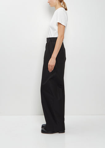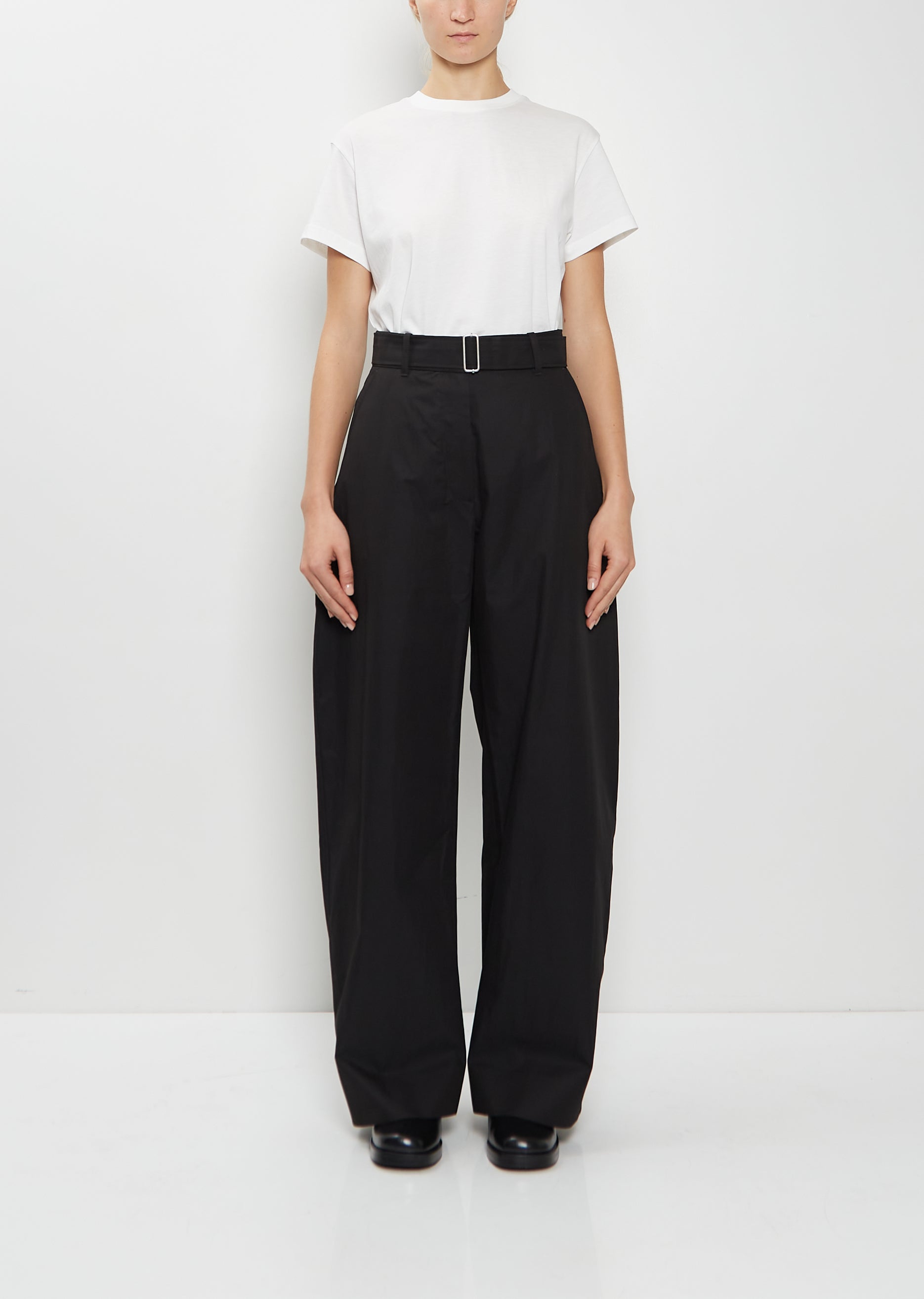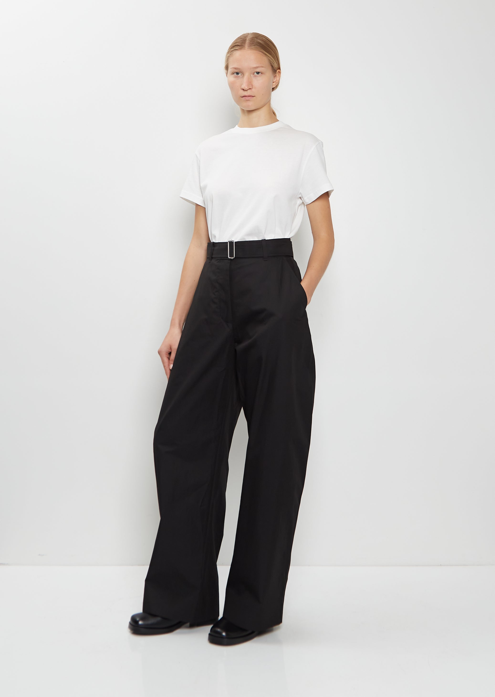 Studio Nicholson black pants with wide, gently curved legs and a high rise fit in cotton blend twill. Features a slide buckle-fastening belt, angled side pockets, belt loops, patch pockets at back and a hook and zip-fly fastening.