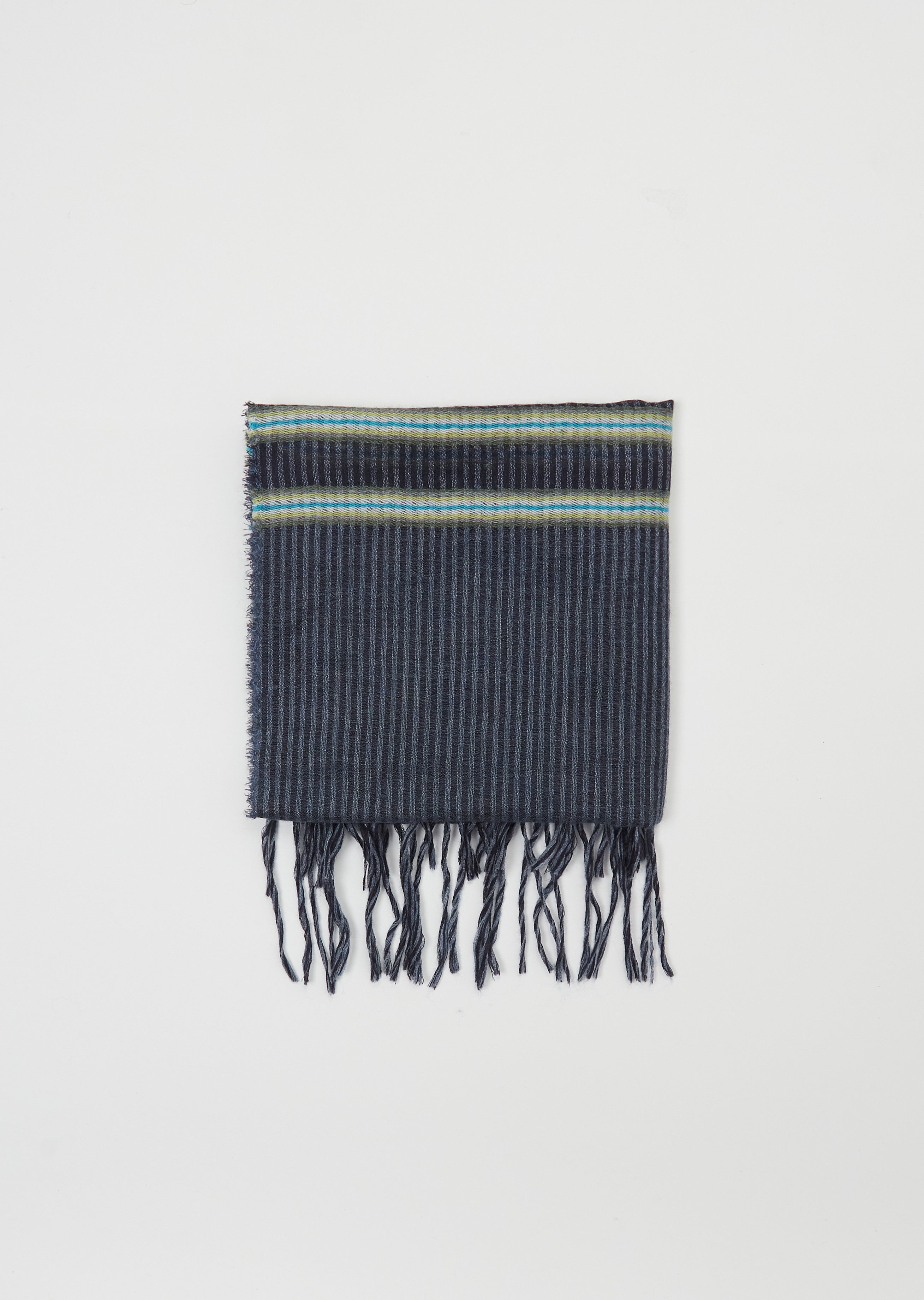 Begg x Co navy and green semi-sheer rectangular scarf with asymmetrical stripes in superfine and luxurious silk and cashmere blend. Finished with hand-knotted fringes on the shorter sides.
