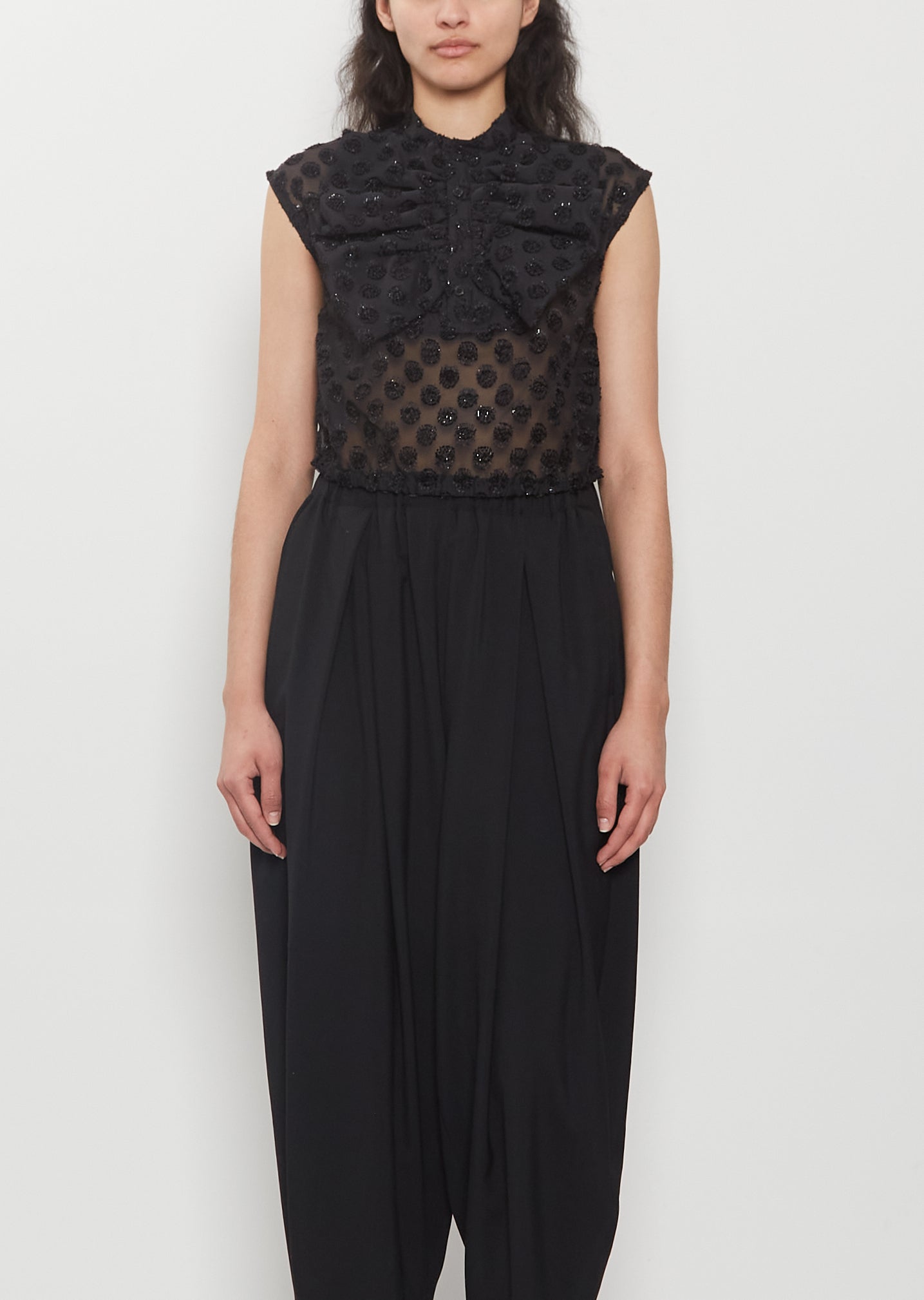 Noir by Kei Ninomiya black sleeveless top with a ruffle detail at front in a sheer georgette with a textured polka dot pattern jacquard. Features a band collar, elasticated gathered hem and a four button half placket at front.
