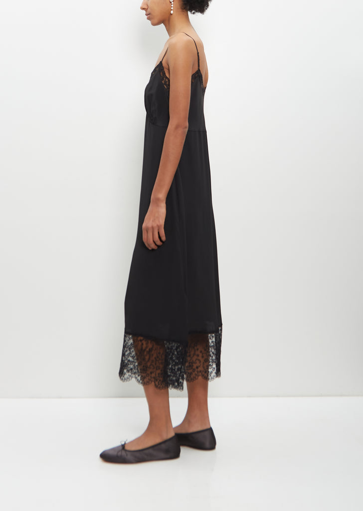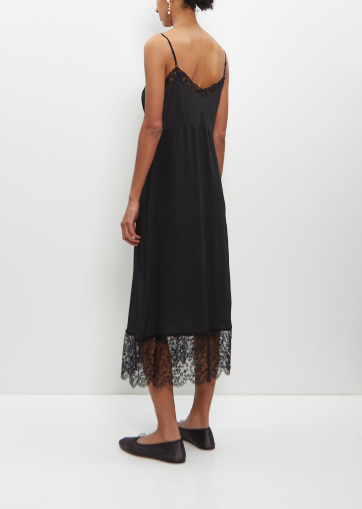 Simone Rocha black A-line slip dress with lace trim at neckline and hem in crepe de chine. Features a sweetheart neckline, empire waist and thin adjustable straps.