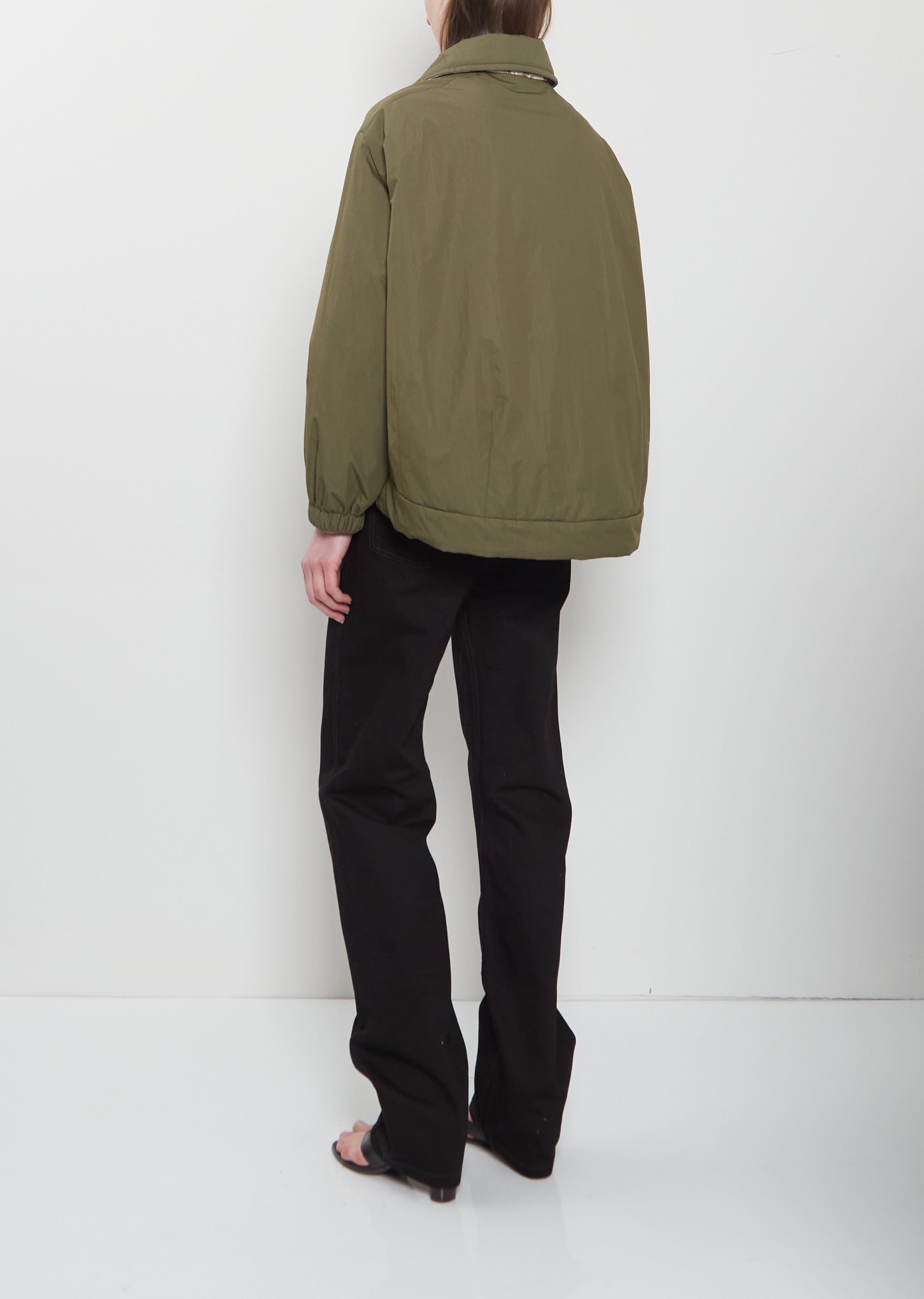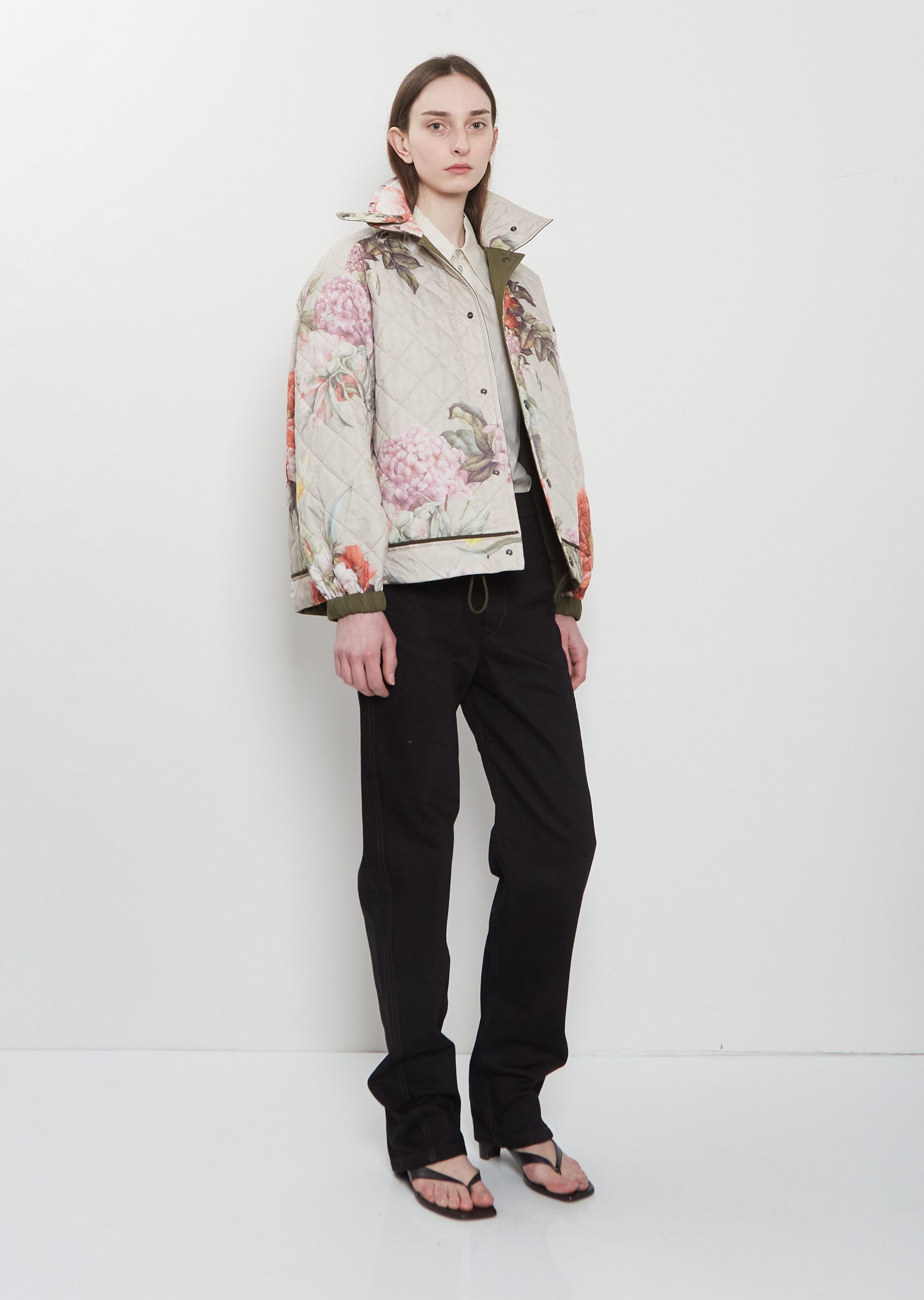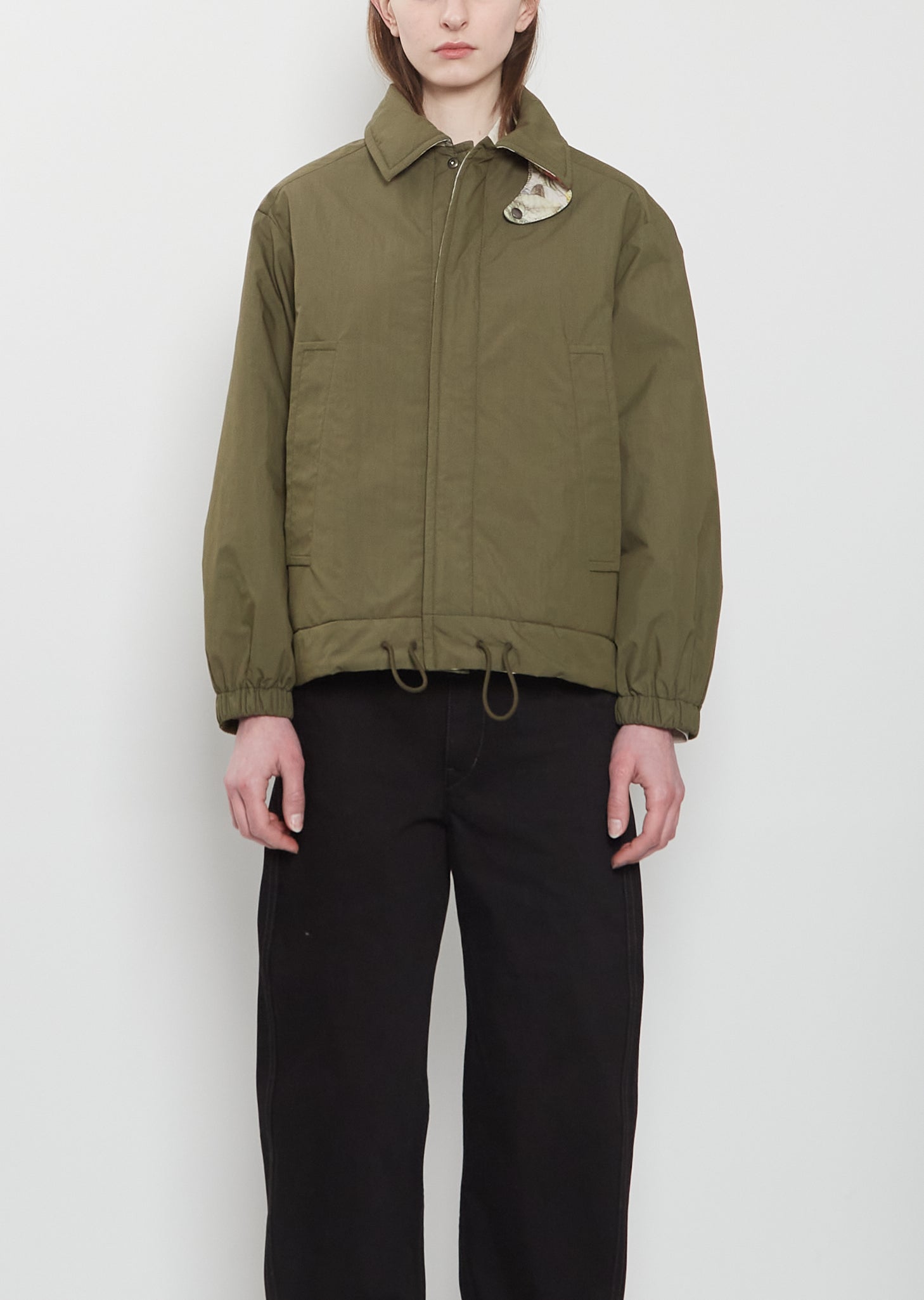 Konrad dark khaki green reversible jacket with a spread collar and an optional press buttoned tab at neck made from a lightweight quilted cotton and recycled polyamide blend with contrasting floral pattern on reverse side. Main side features two large diagonal welt side pockets, adjustable drawstring at hem, elasticated cuffs and press buttons closure. Reverse side features two side seam pockets. Relaxed fit.