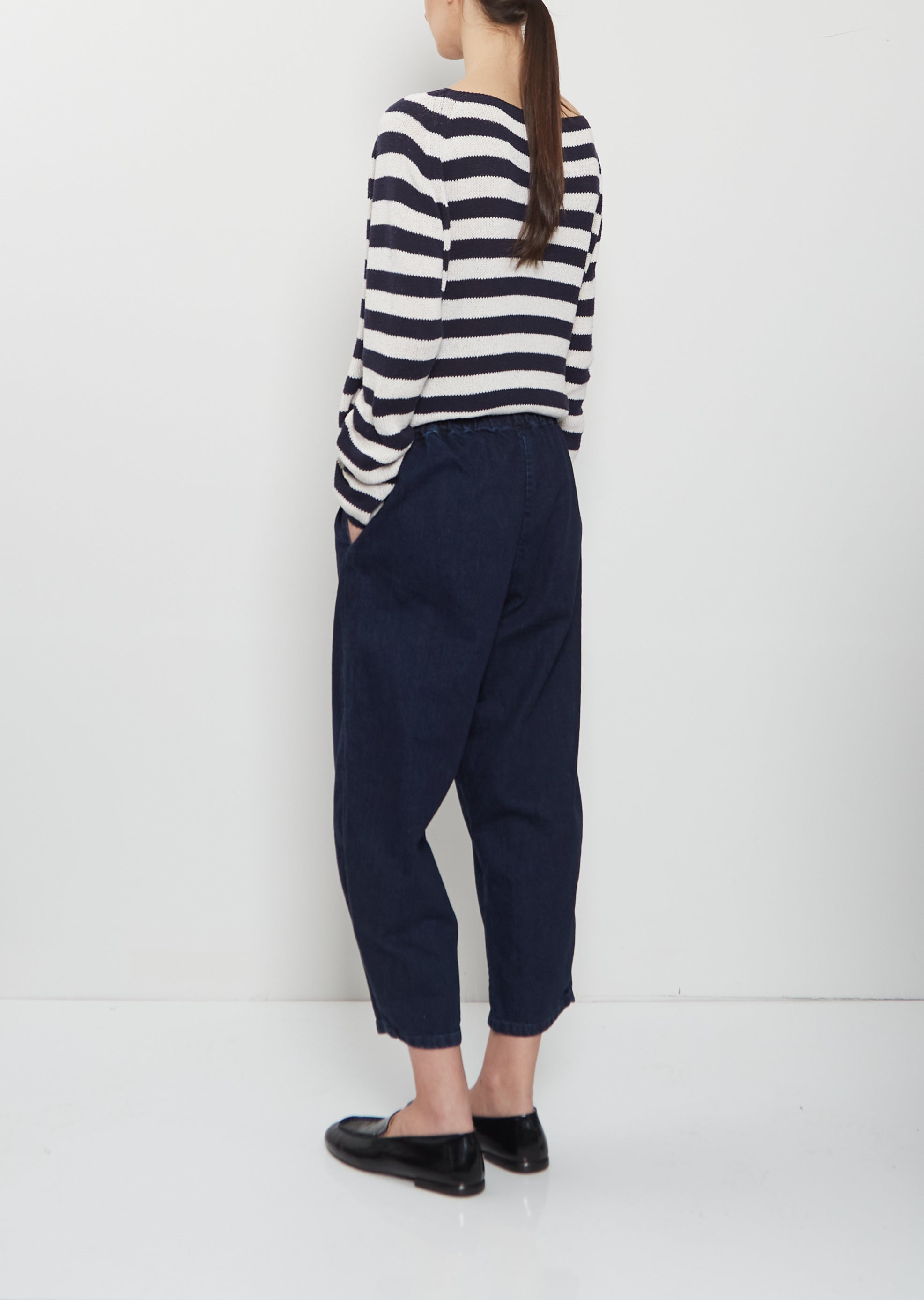 Apuntob indigo blue pull-on cropped pant pant with wide, curved legs in a dense cotton denim with a washed and worn finish. Features an elasticated waist and side seam pockets. Relaxed fit.
