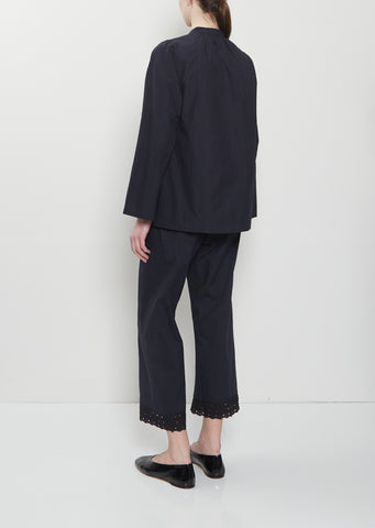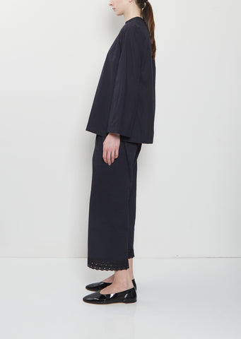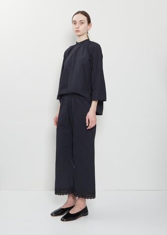 dosa midnight pull-on cropped pant with straight legs in a hand-spun and hand-woven dense khadi cotton. Features an elasticated waistband and embroidered eyelet lace panel at hem.