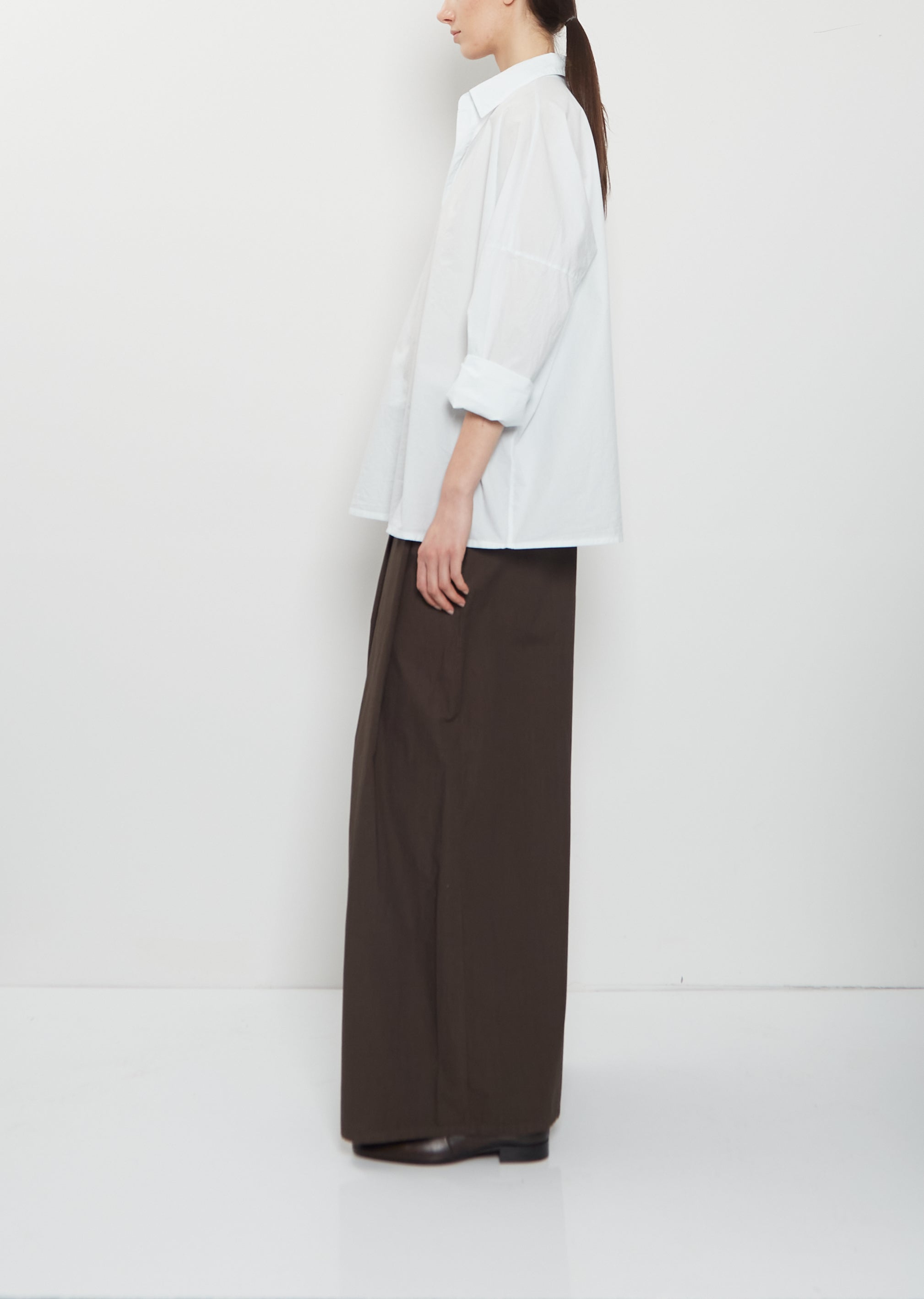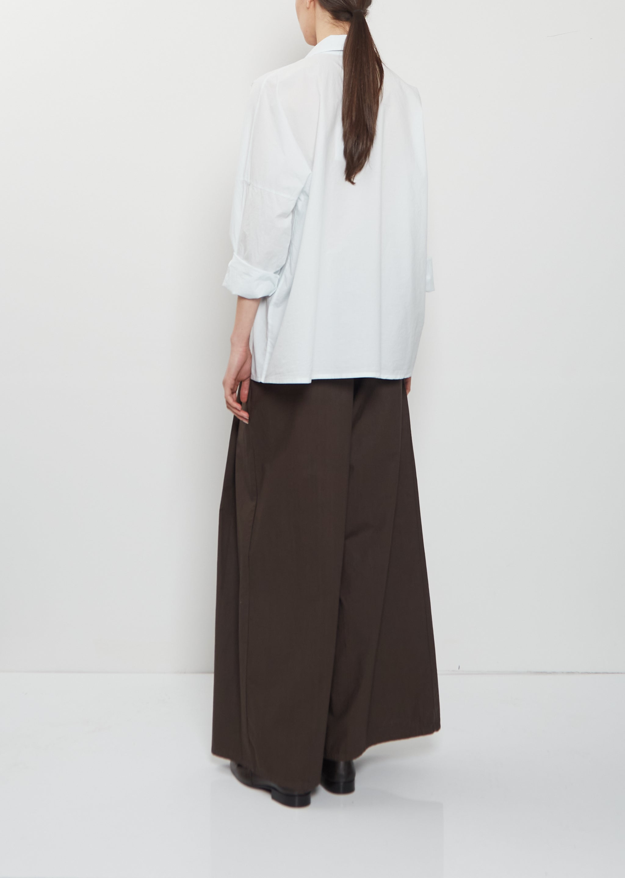 Labo.art dark brown signature wide leg trousers with a pleated front and wide elasticated waist in cotton poplin. Concealed side seam pockets. Easy, pull on fit.