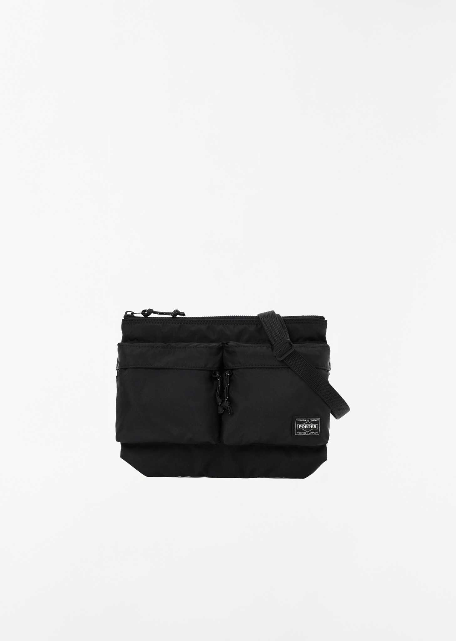 Porter - Yoshida & Co black shoulder bag with two exterior zipper pockets in technical nylon. Features an adjustable shoulder strap, an internal removable pouch, black-tone metal hardware and a top zipper closure. Finished with a bright orange nylon lining.