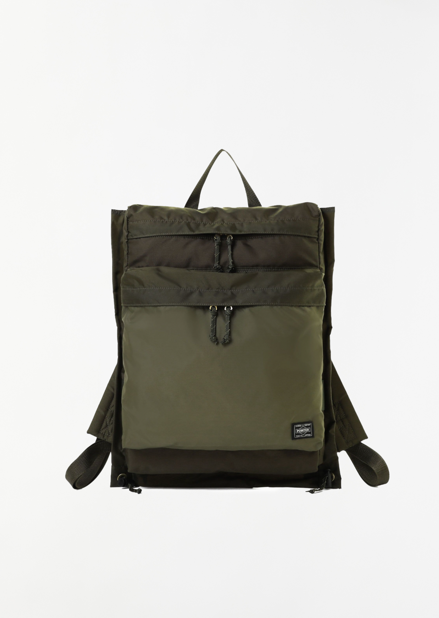 Porter - Yoshida & Co olive drab rucksack with two exterior zipper compartments and adjustable shoulder straps in technical nylon. Features a top handle, adjustable drawcord sides, an interior removable pouch with top handle, an interior velcro pocket, and two interior slip pockets. Finished with a bright orange nylon lining.