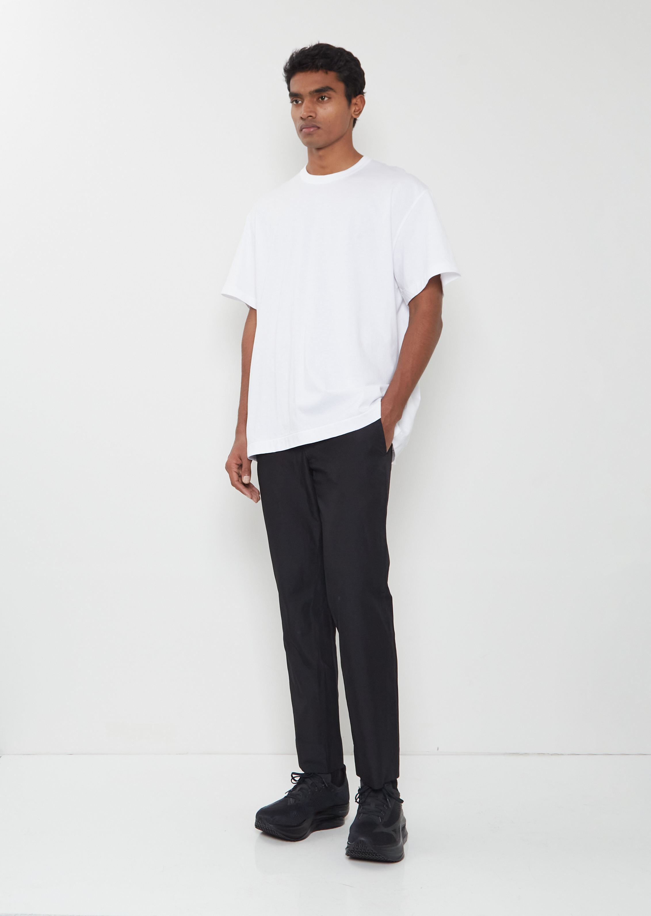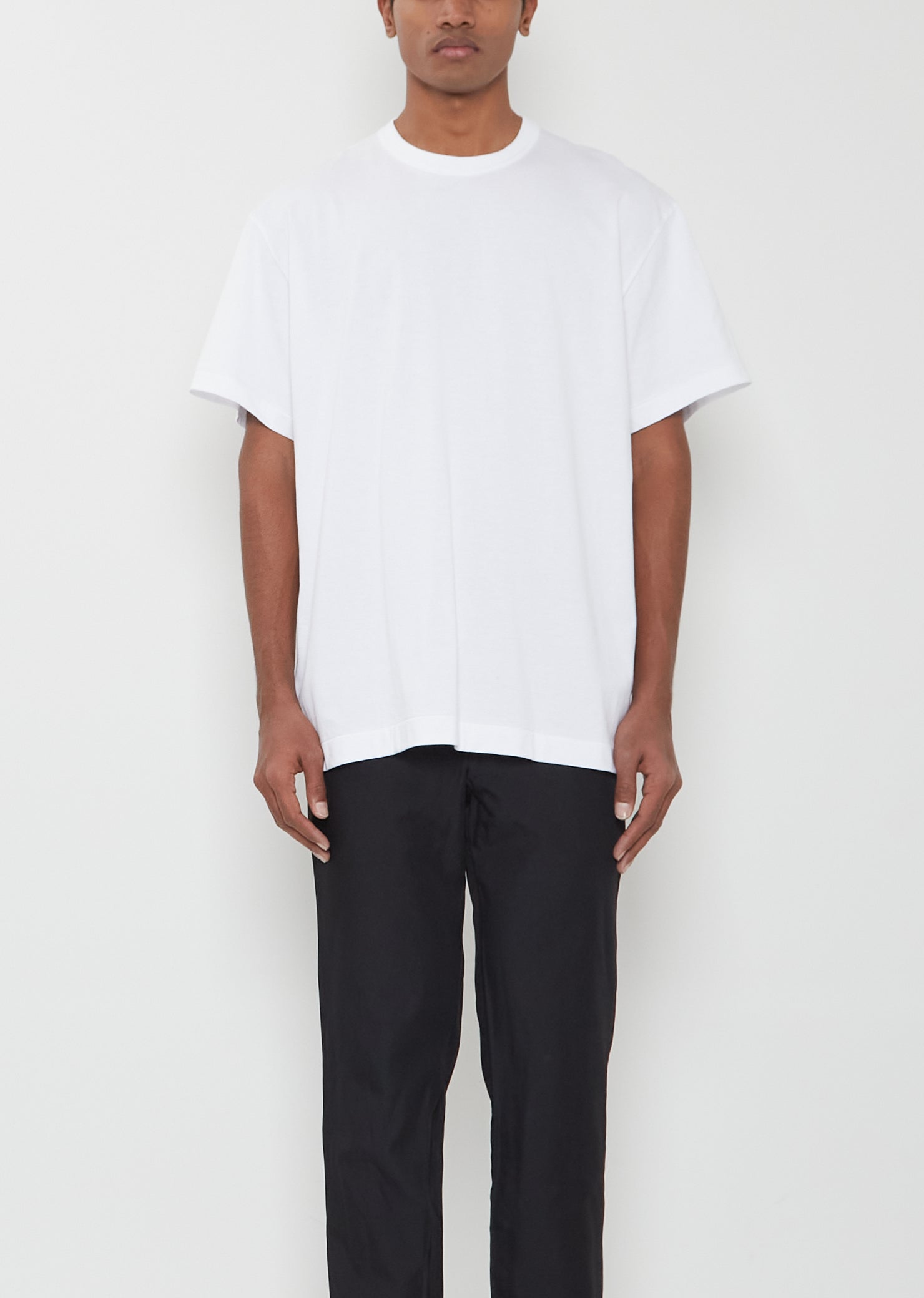 Comme des Garçons Homme Plus white t-shirt with slightly dropped shoulders and round neckline in soft and dense cotton jersey. Relaxed, oversized fit.