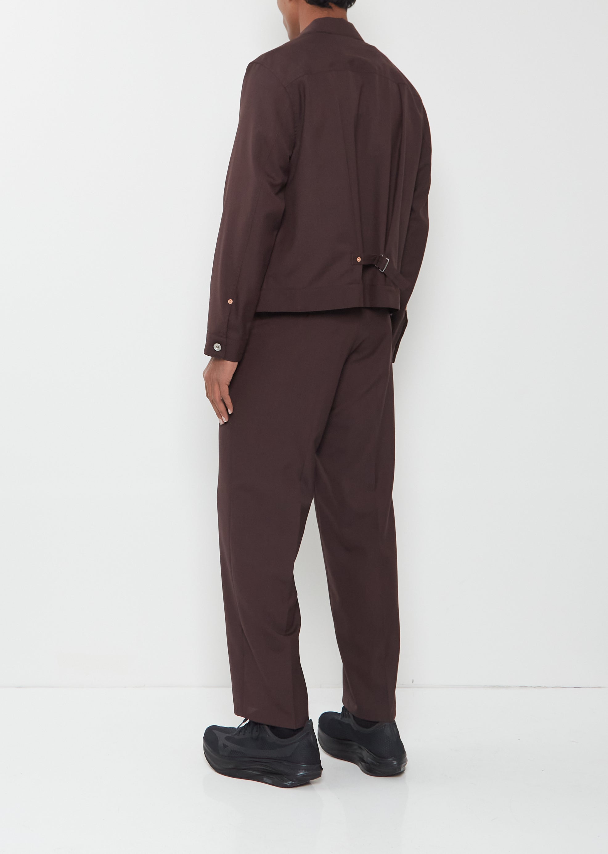 Sacai brown jacket with action pleats at placket and silver-toned button front in a lightweight poly wool blend. Features a chest patch pocket, buttoned cuffs, side seam pockets, and waist adjuster detail at back. Comes unlined.