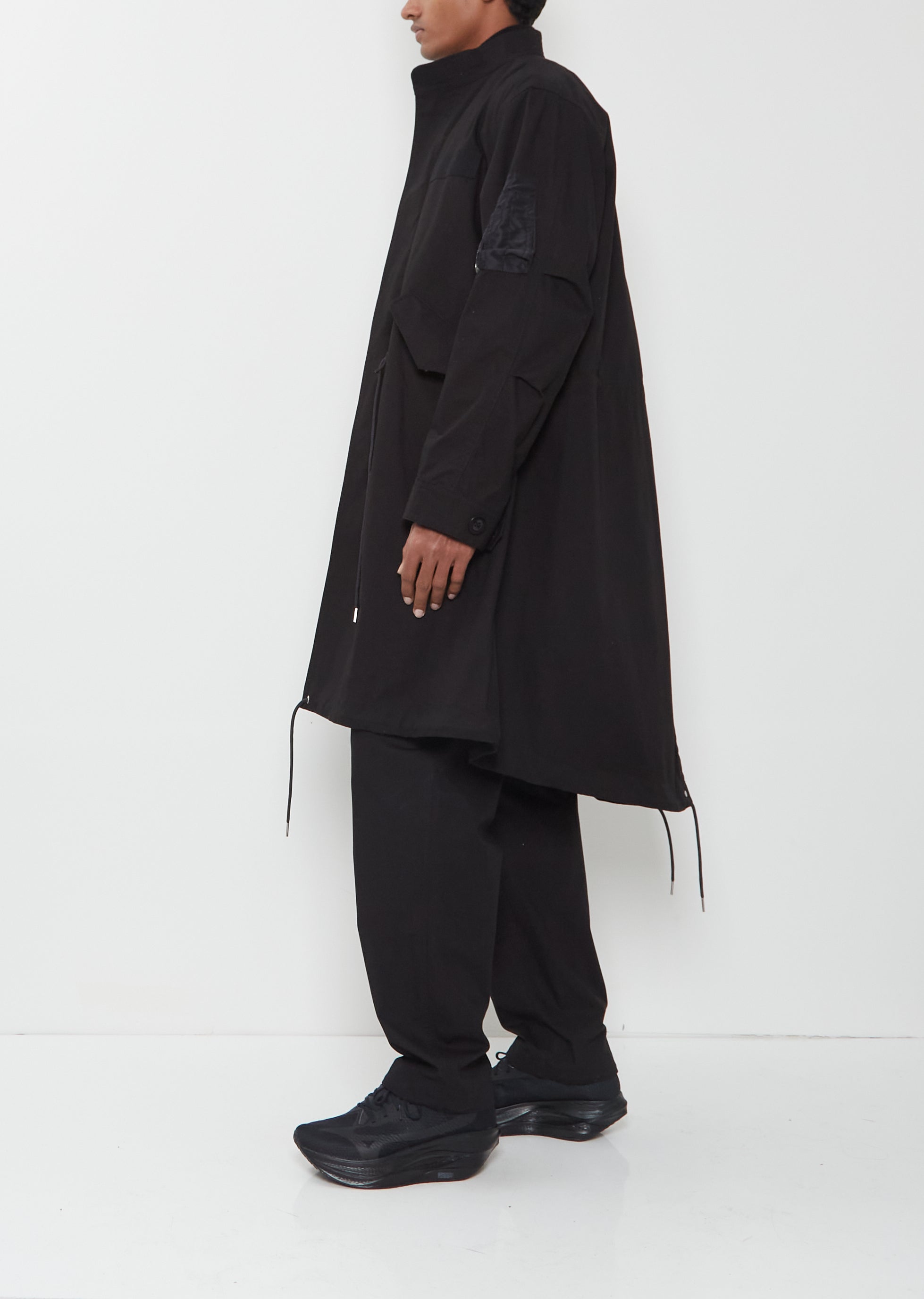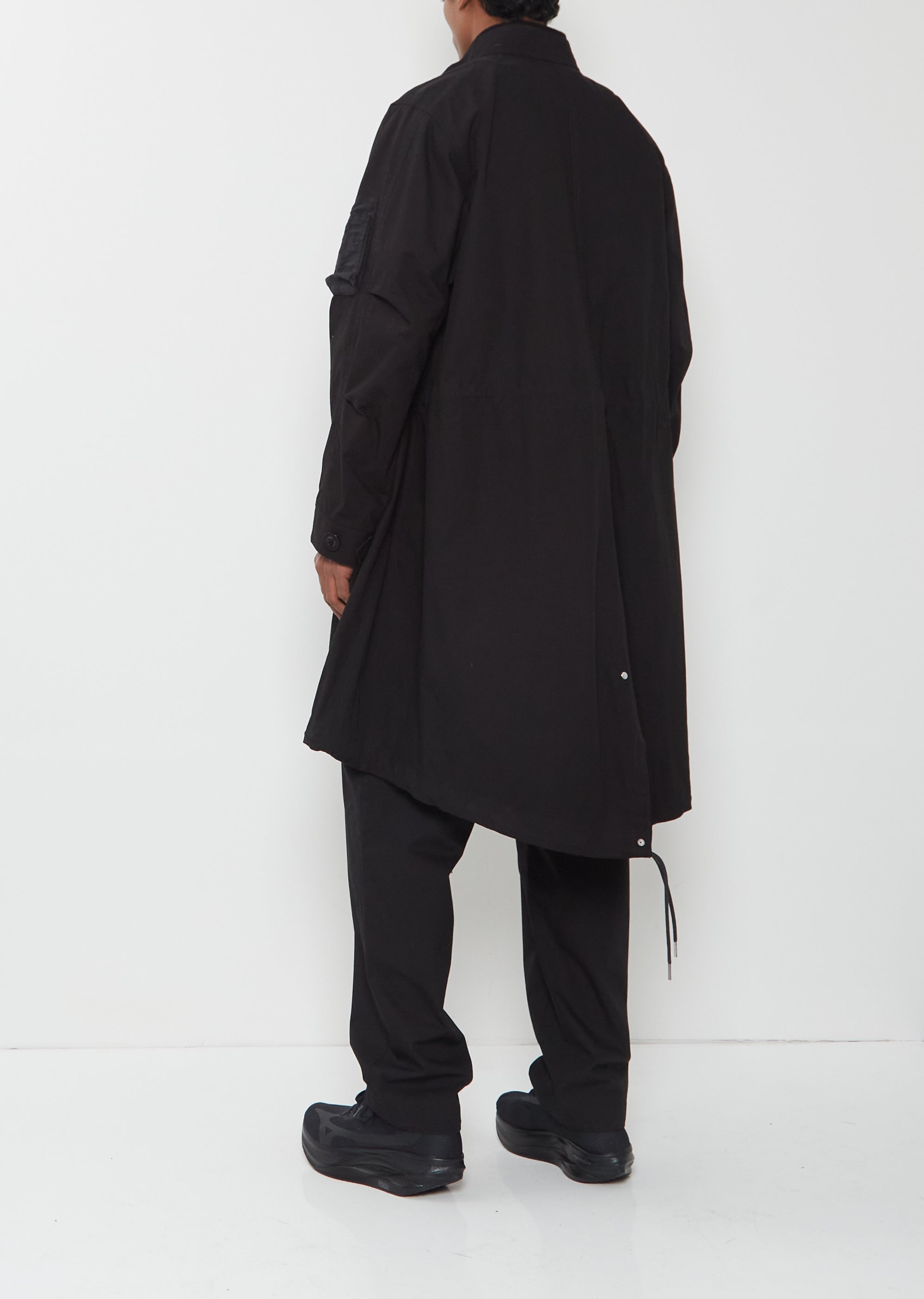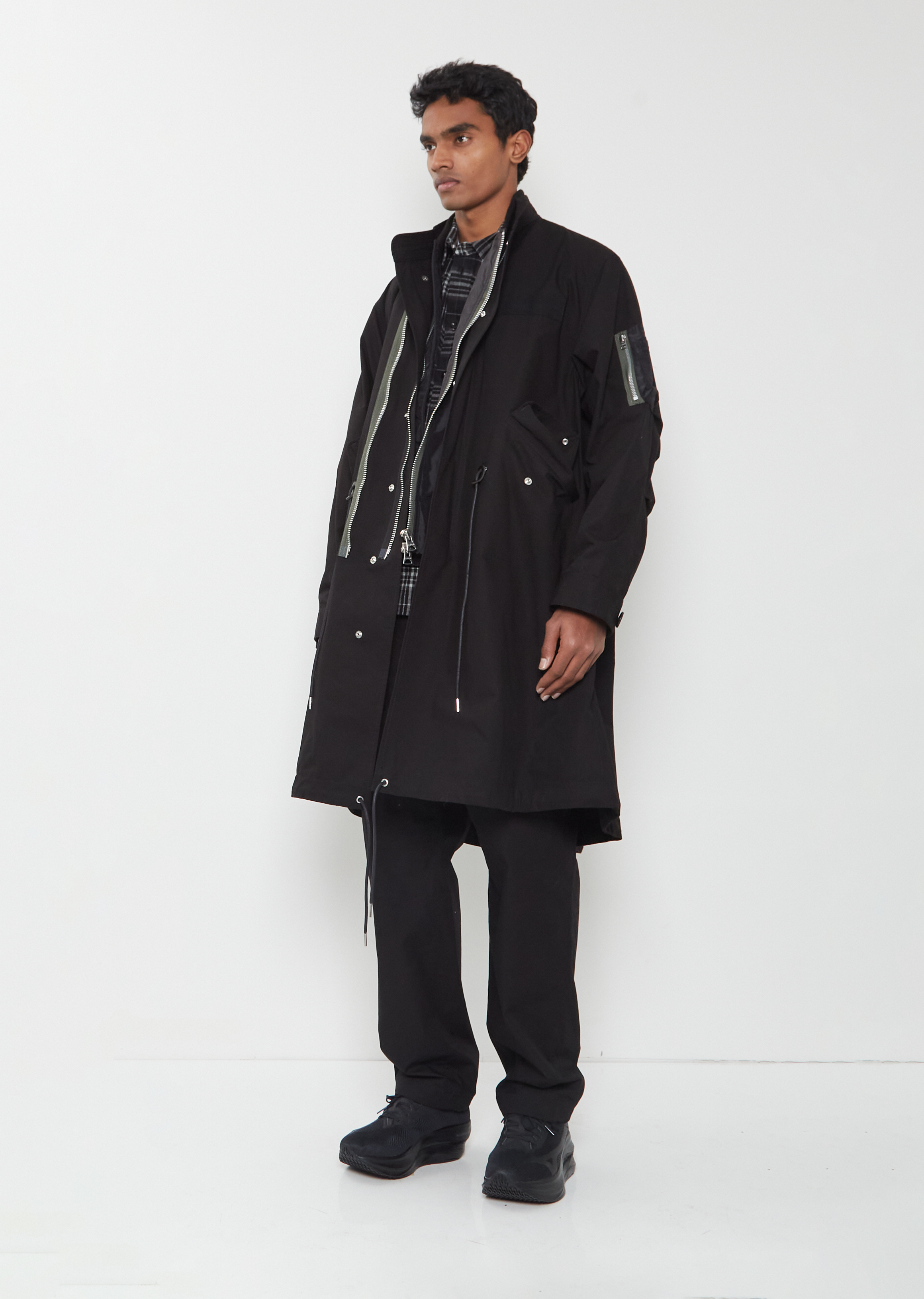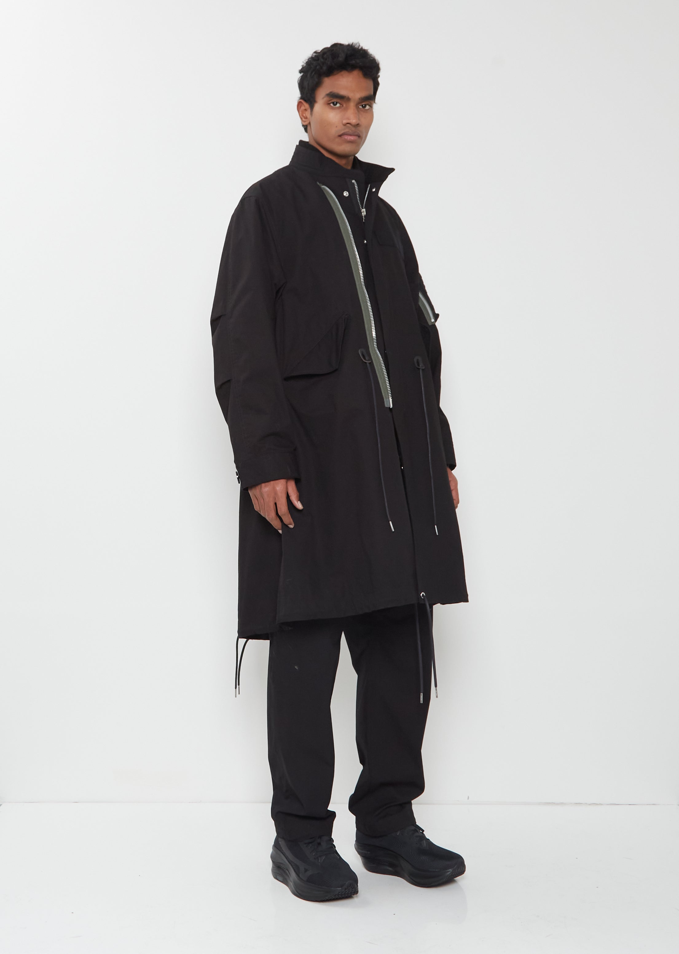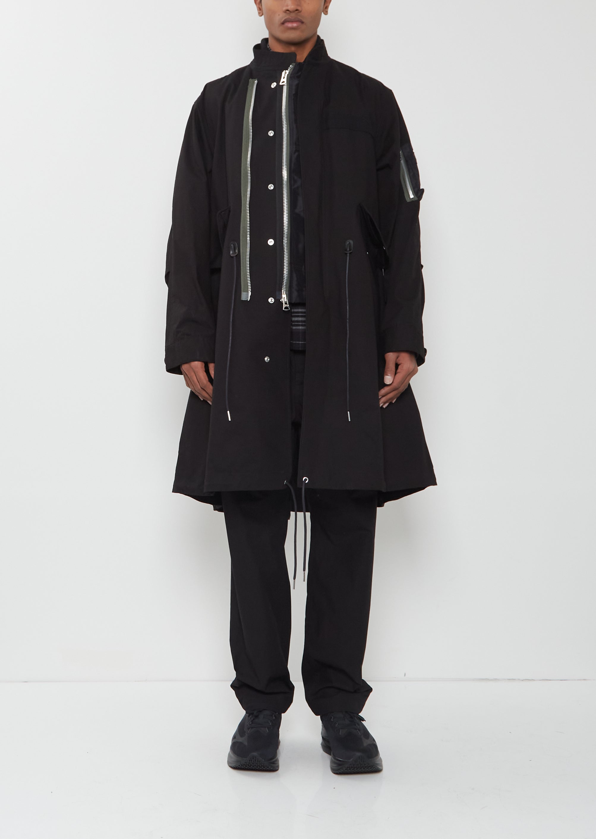 Sacai black coat with an attached interior bomber detail and double zip press button front in cotton nylon ripstop. Features an outer stand collar, an interior bomber collar, double zip closure at bomber, additional zip stringer, angled press button flap welt pockets, adjustable drawstring waist and hem, signature zippered pocket at sleeve, adjustable button cuffs, and slit at back. Front can be zipped in various ways for desired style.