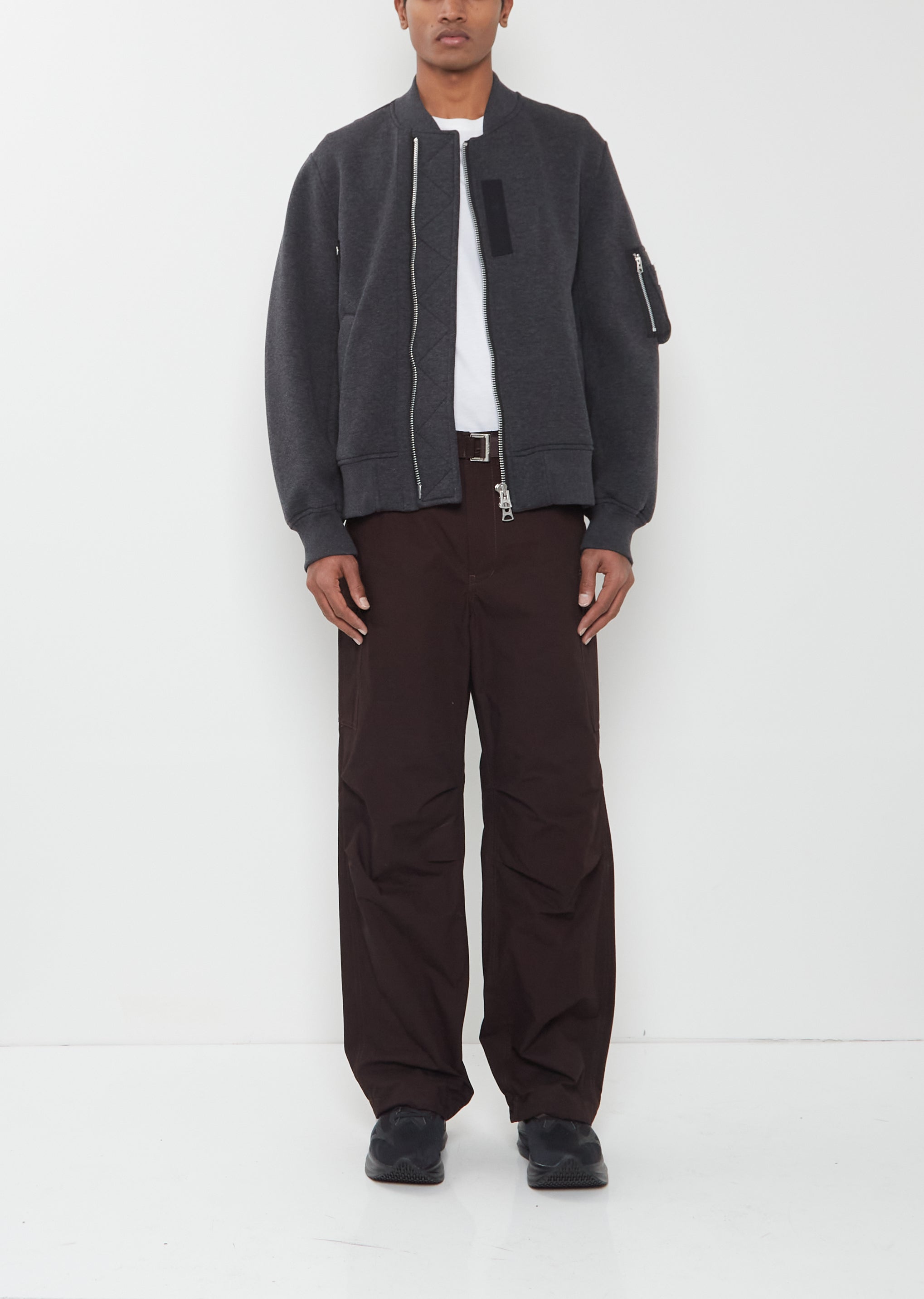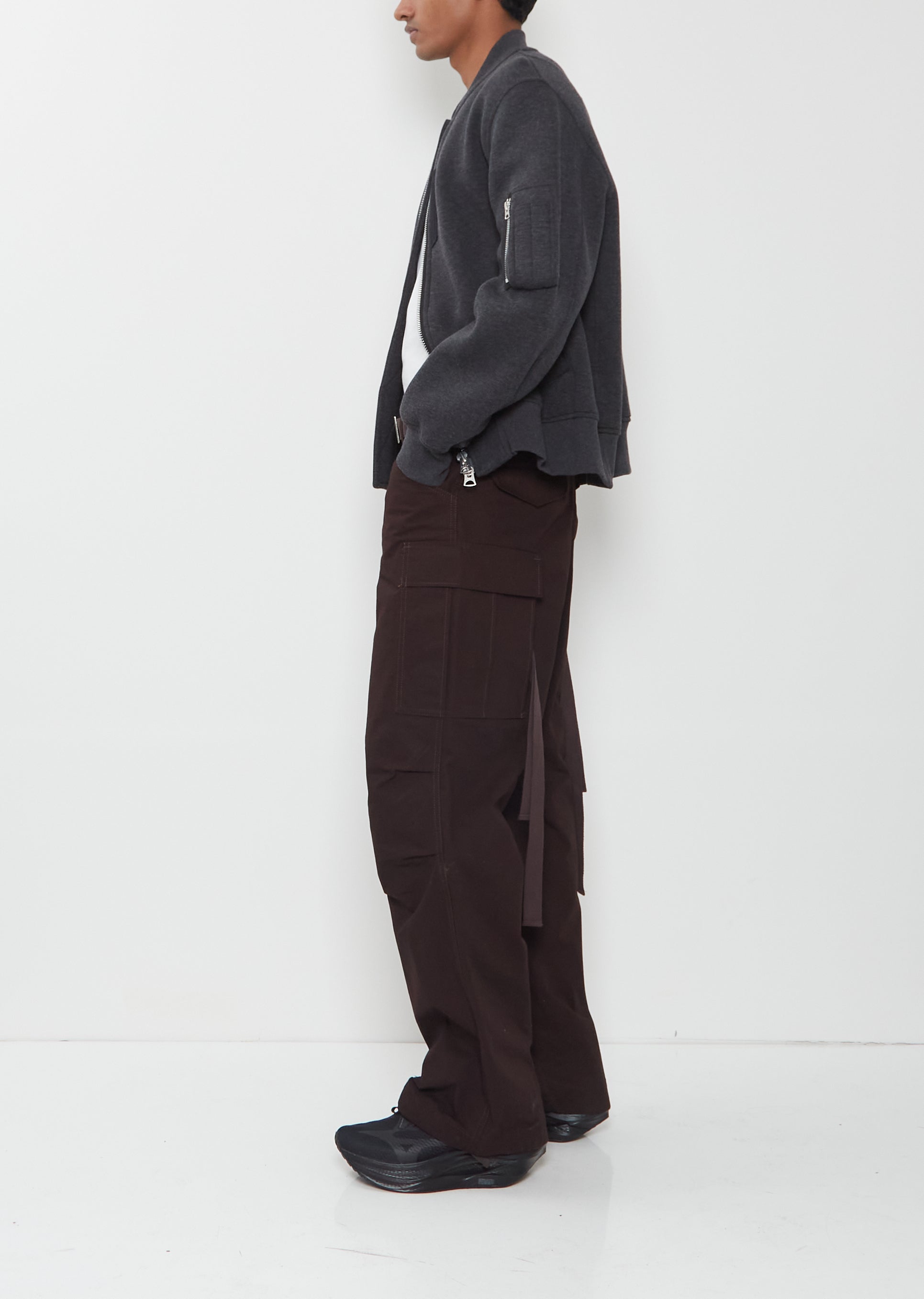 Sacai brown pants with wide, straight legs and adjustable self belt in a cotton nylon ripstop. Features belt loops, herringbone tape backing at belt, angled front pockets, press button flap pockets at legs, pleating details at knees, adjustable drawstring cuffs, waist adjusters at back, press button flap pockets at back, attached herringbone tape details at back, and a button and zip-fly fastening.