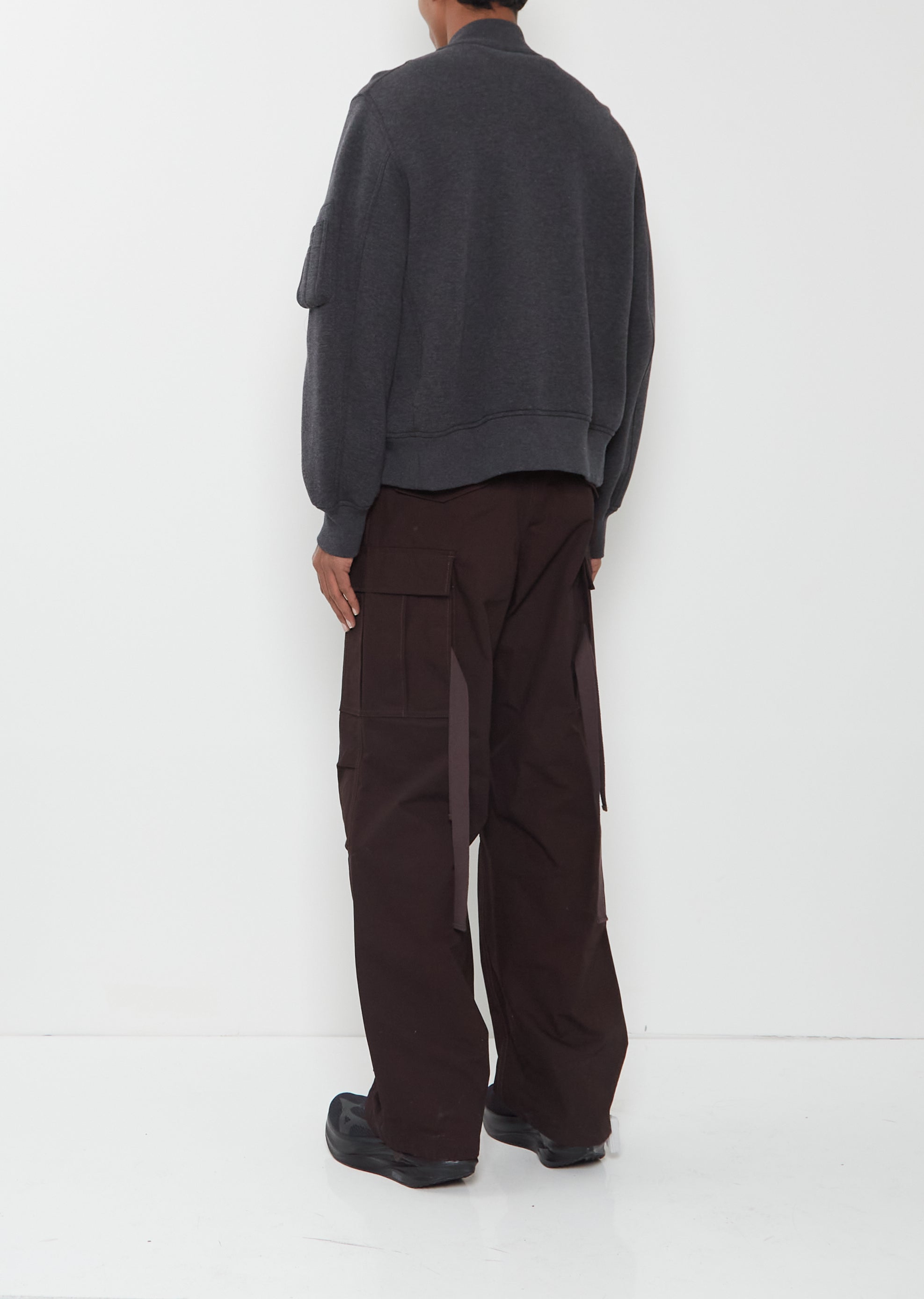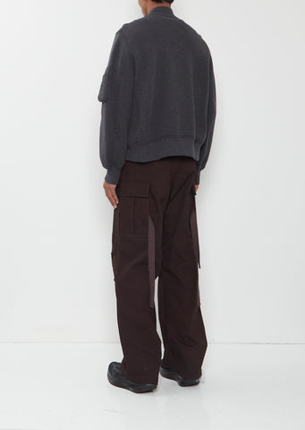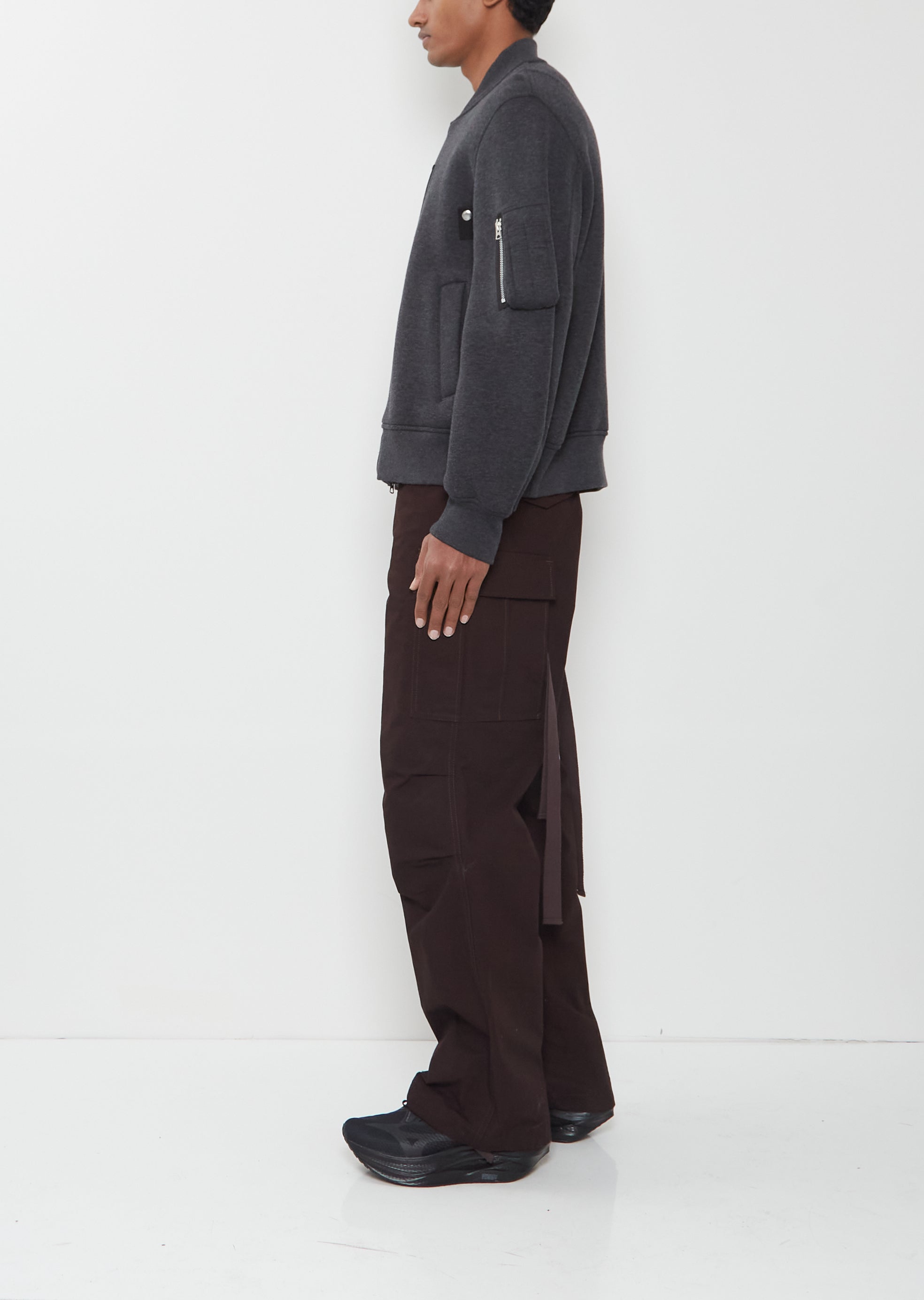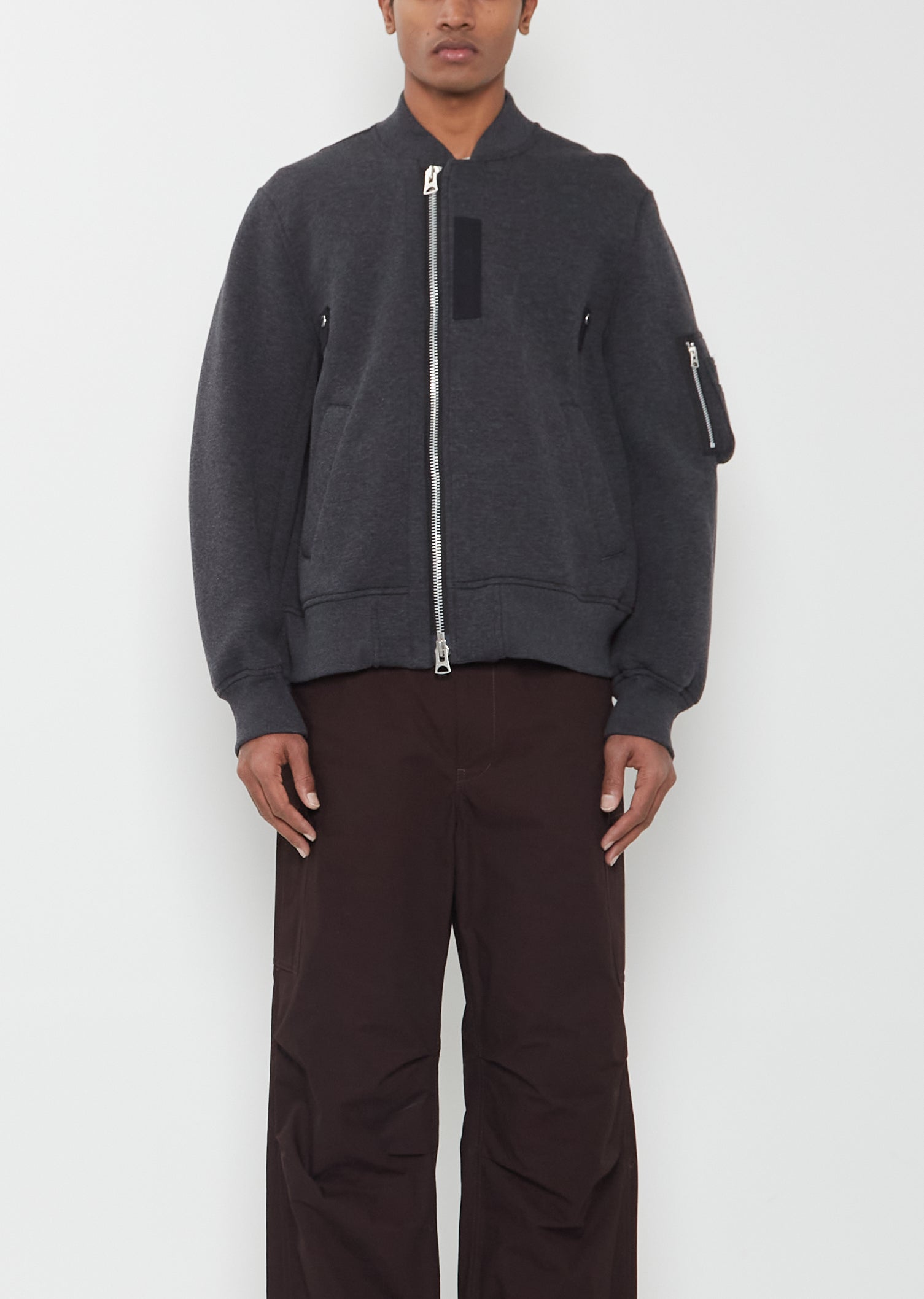 Sacai cool gray blouson with a bomber style collar and an asymmetrical double zip front in signature sponge sweat. Features press button herringbone tape details, press button welt pockets, signature zippered pocket at sleeve, and ribbed trim finish at collar, cuffs, and hem.