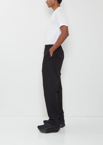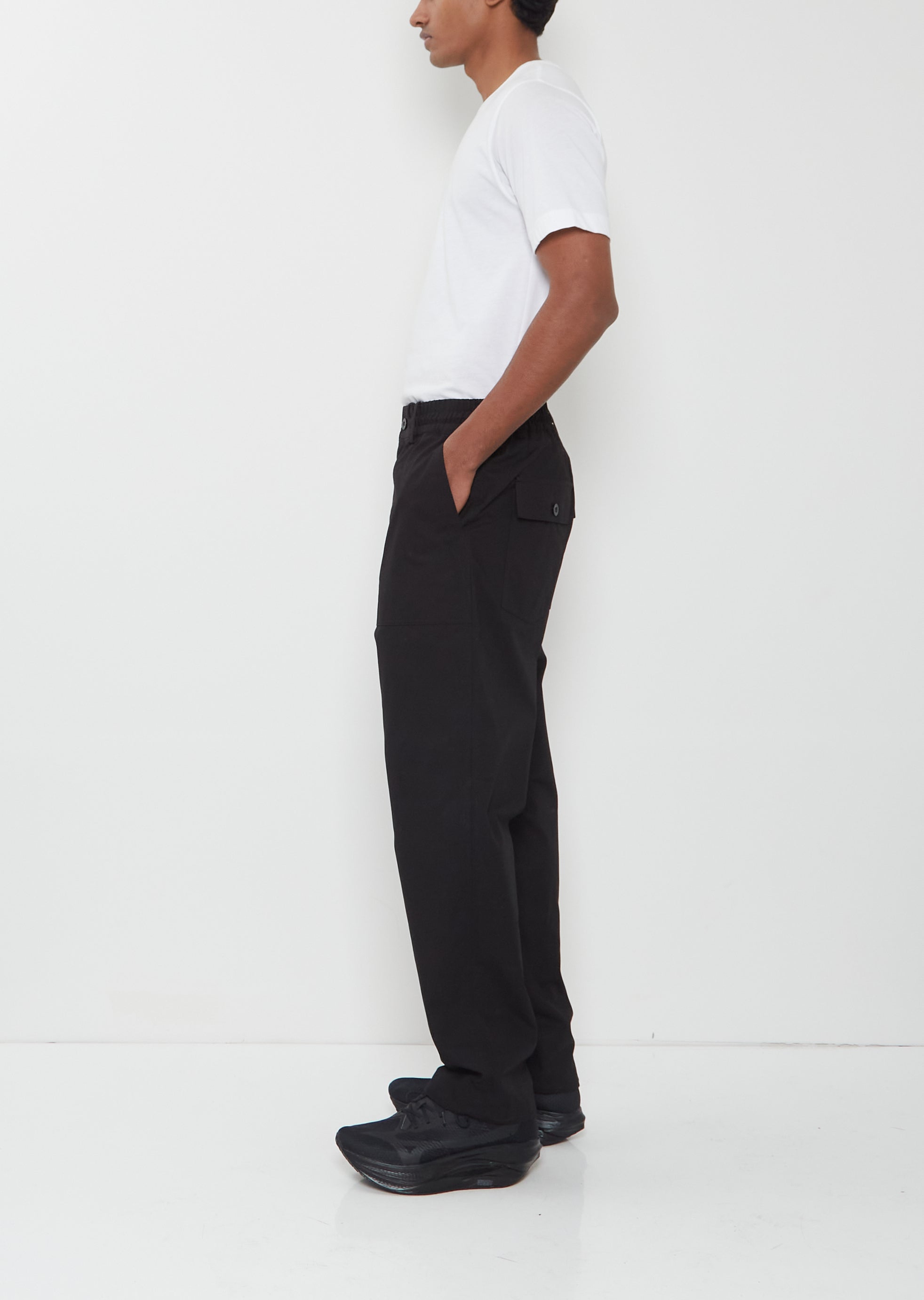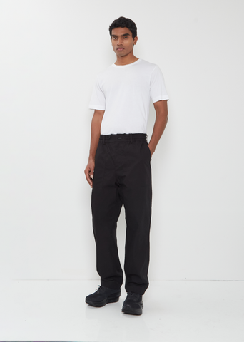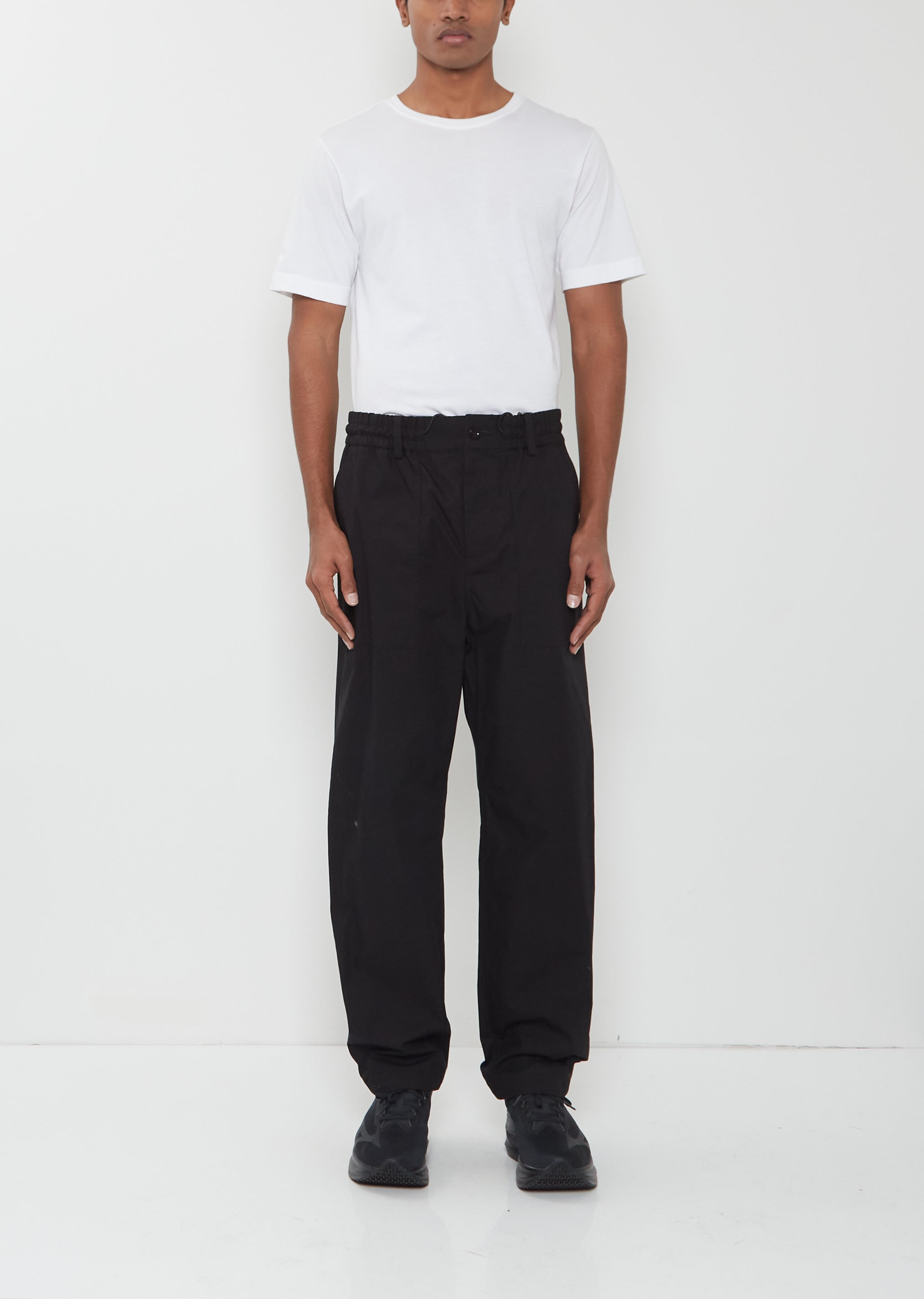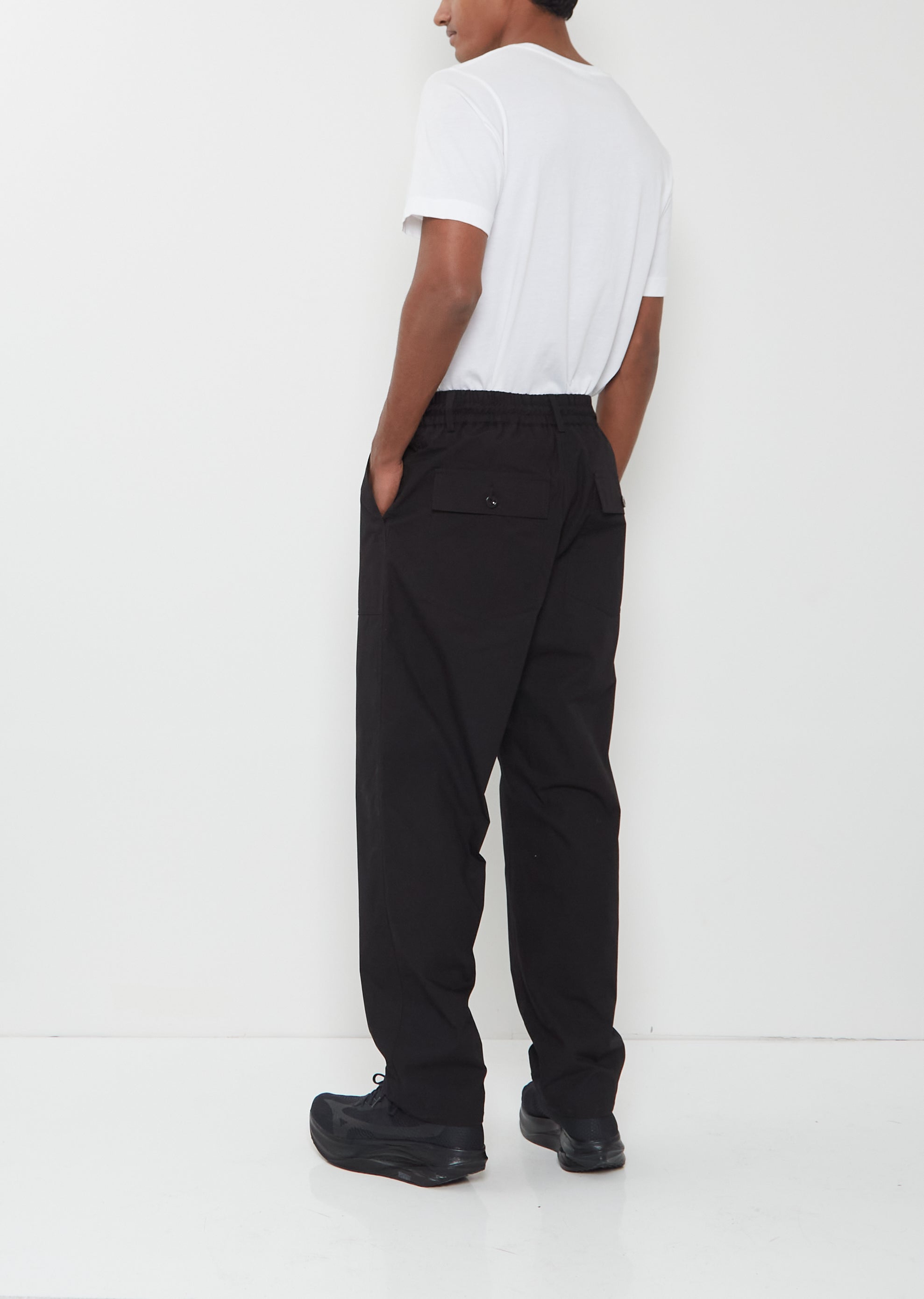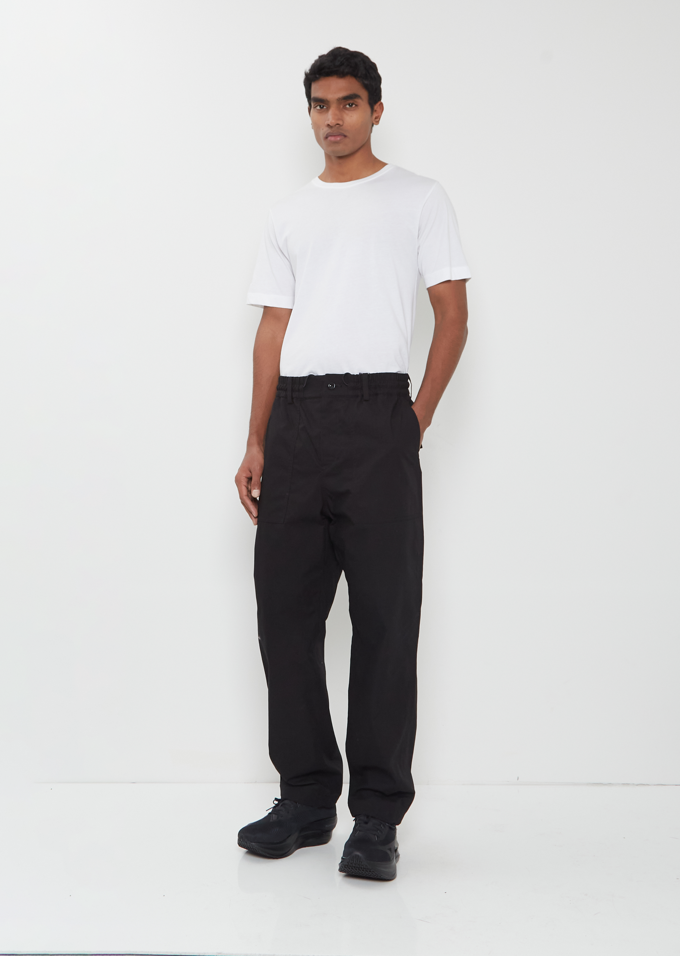 Sacai black pants with wide straight legs and an elasticated drawstring waist in cotton nylon. Features belt loops, angled patch pockets, interior drawcord cuffs, buttoned flap patch pockets at back, and a button and zip-fly closure.
