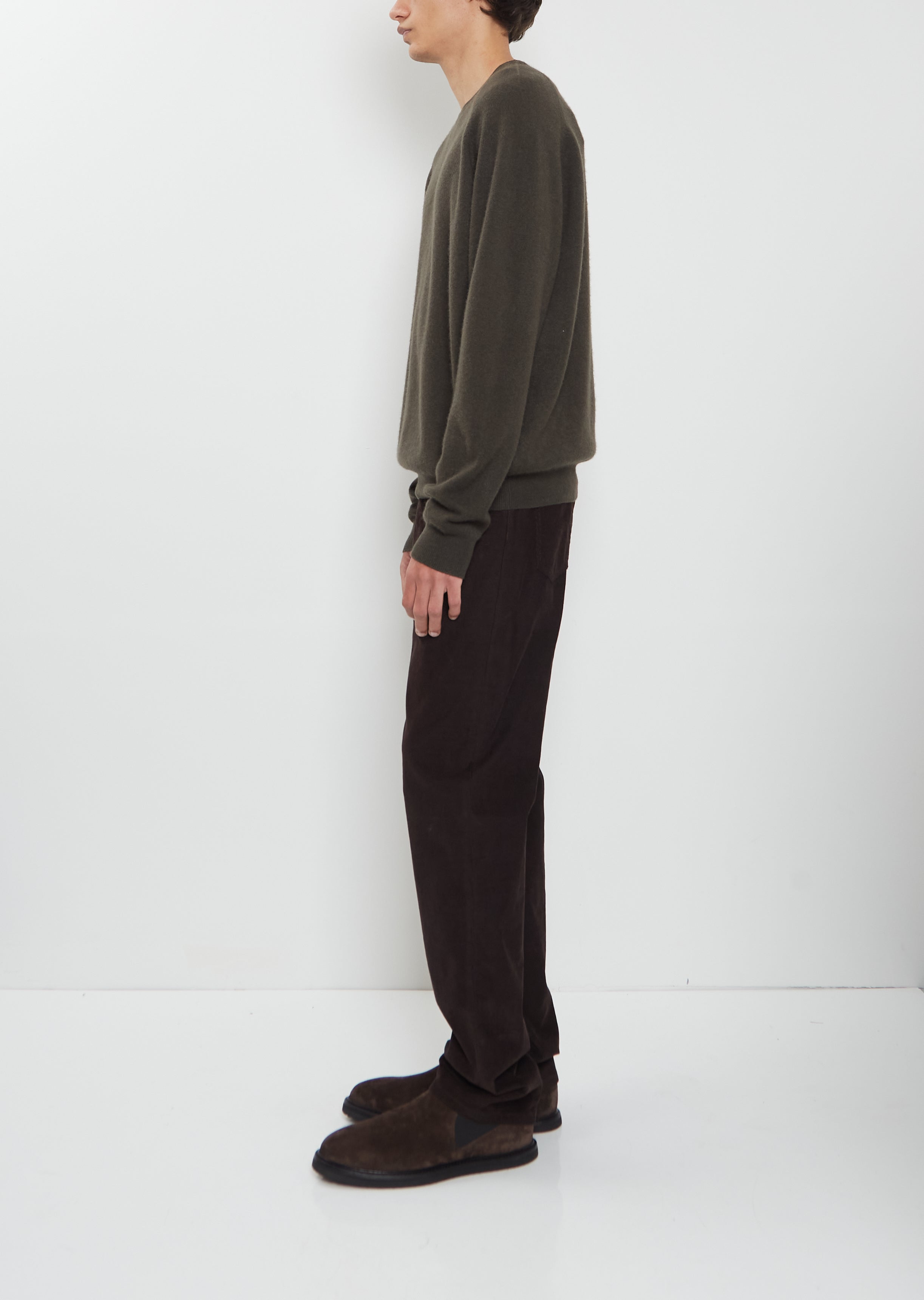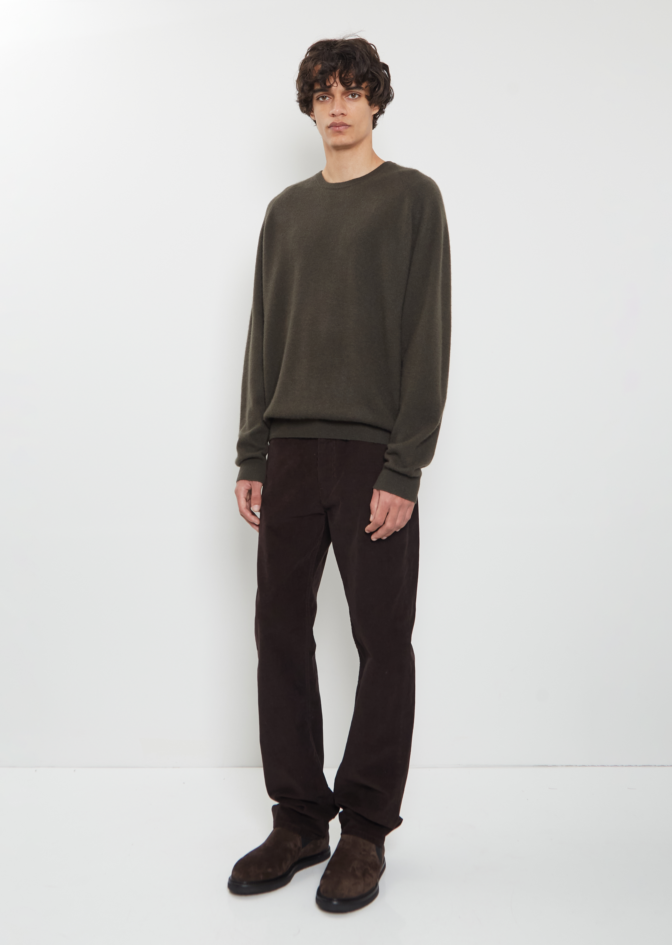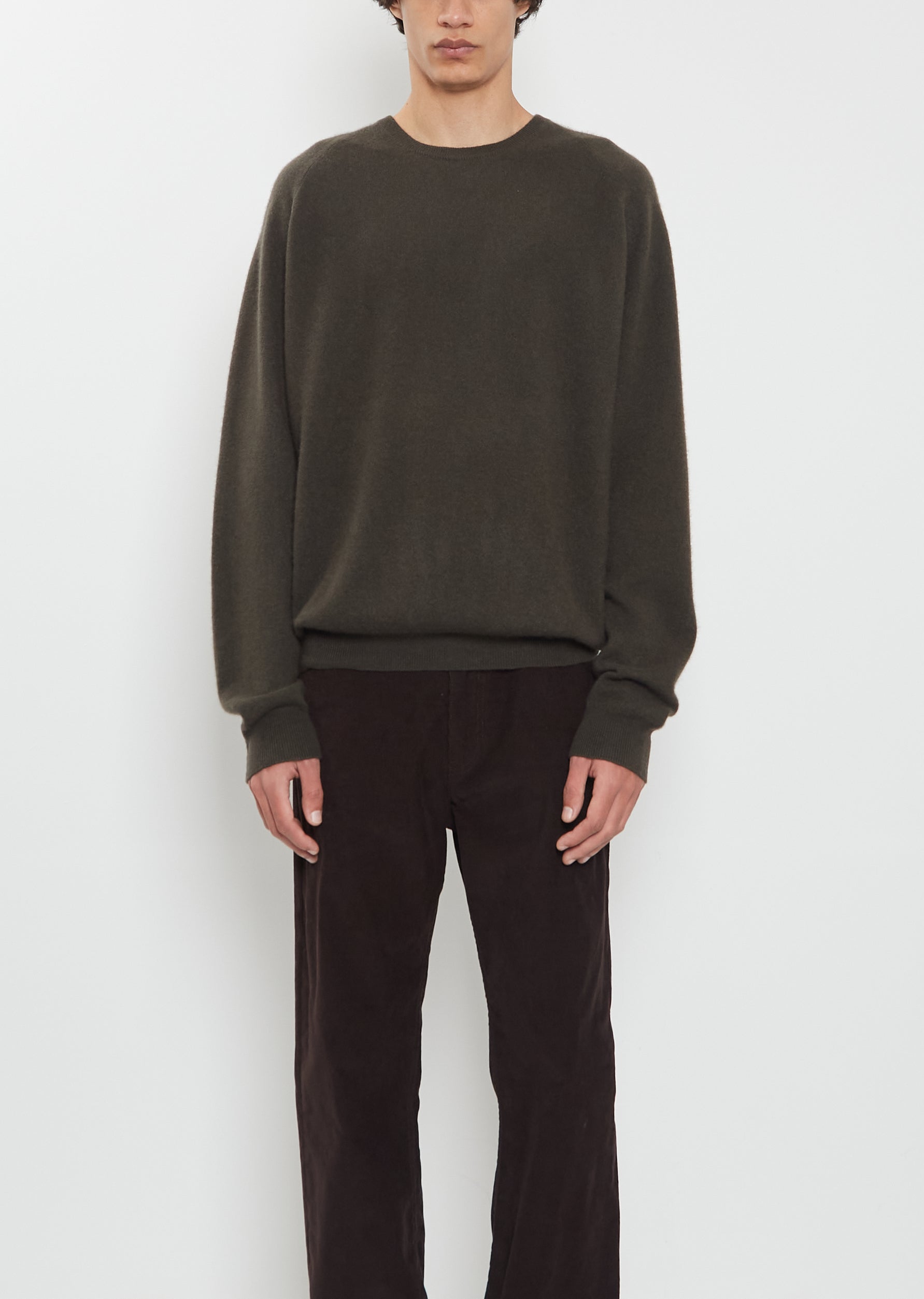 Frenckenberger dark olive green unisex boyfriend-style sweater with a round neck and raglan sleeves in an ultra-soft mid-weight cashmere knit. Features a relaxed silhouette and rib trim finishings along neckline with a wider rib trim finish at the cuffs and hem.