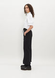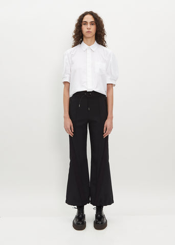 Sacai black wide leg track style pants in technical knit fabric. Features zip side pockets, rib trim details along upper side twisting across to reach the hem, and a waist drawcord to adjust the fit. Finished with an elasticized waist. These pants come lined.